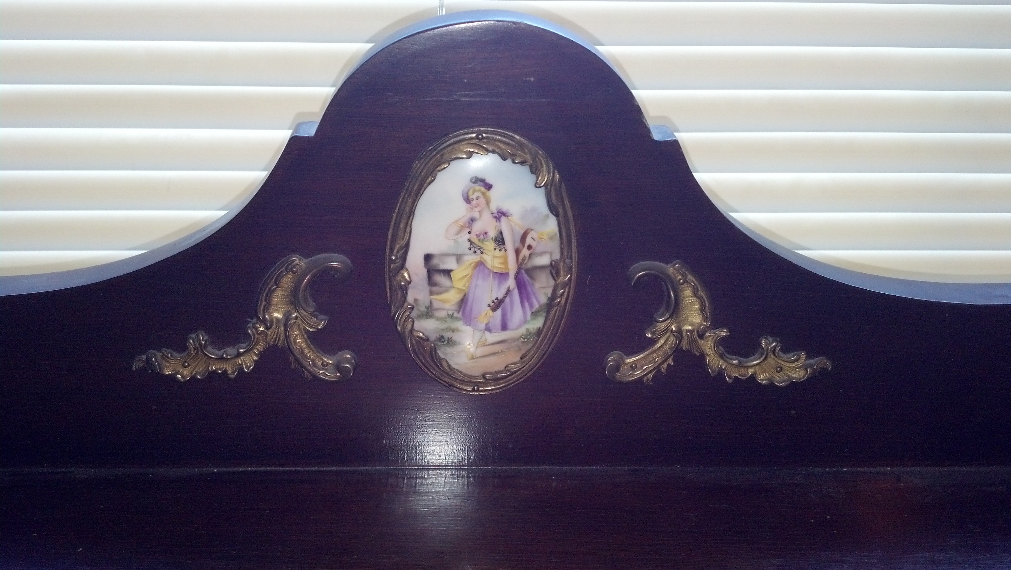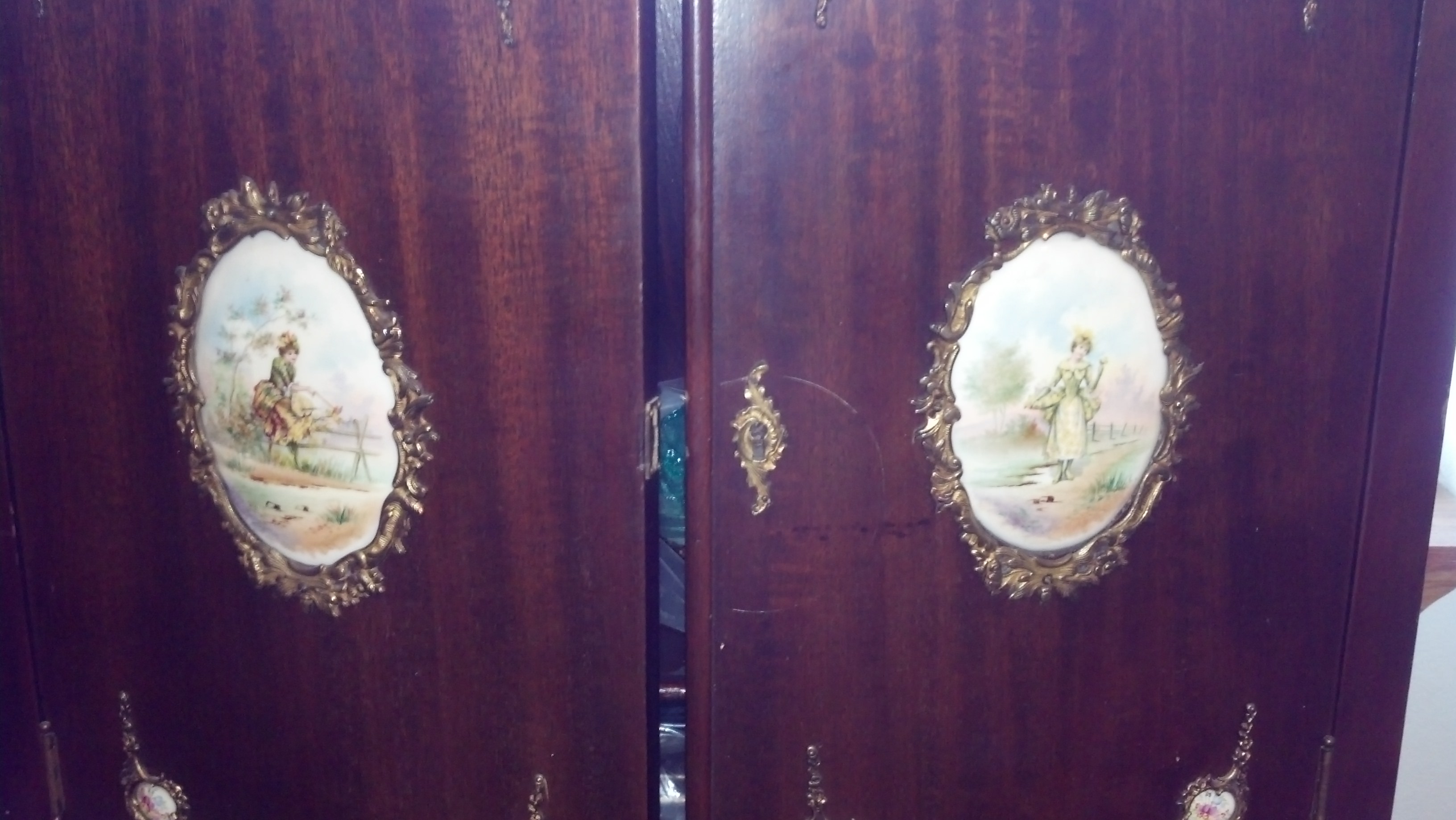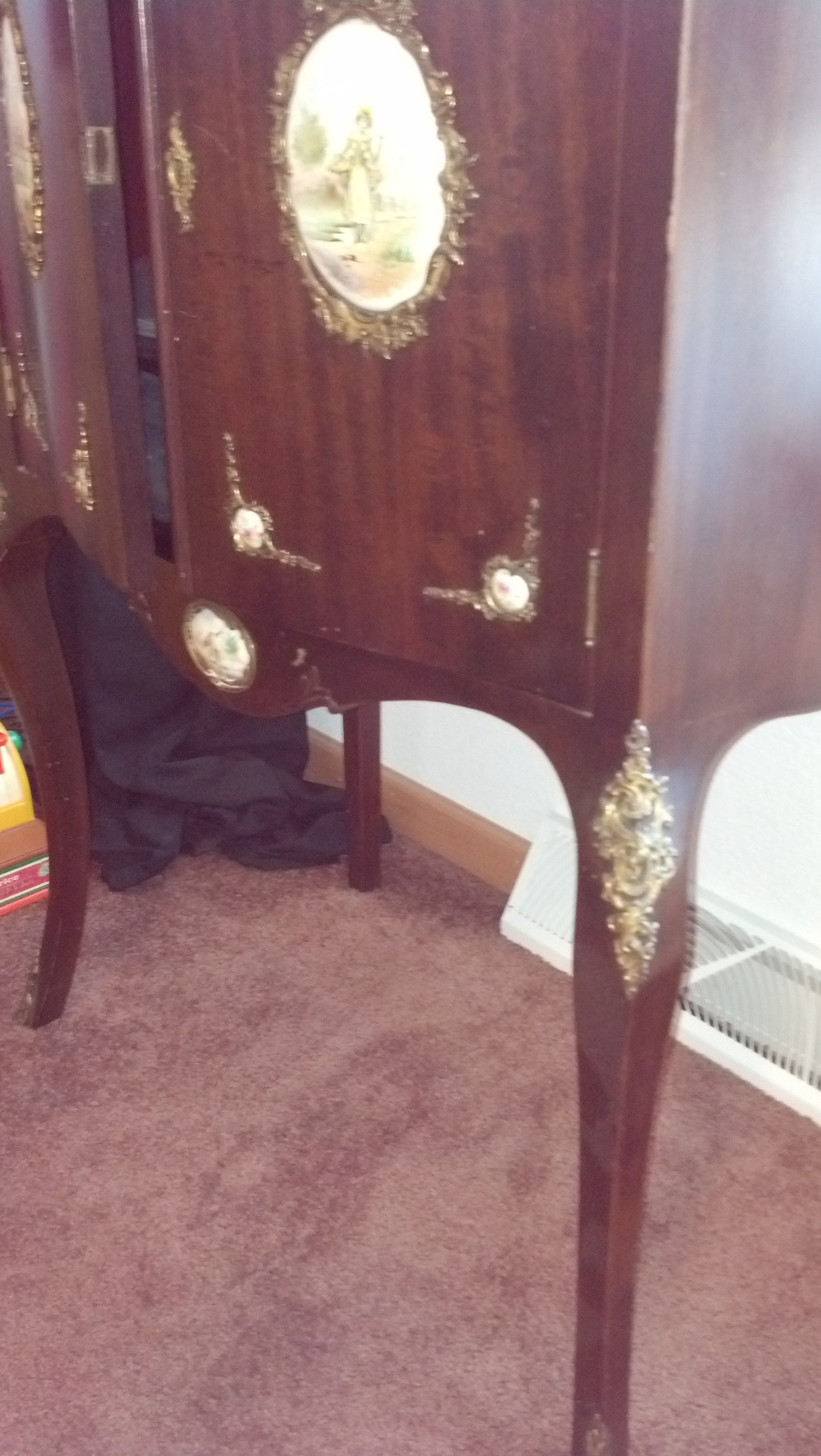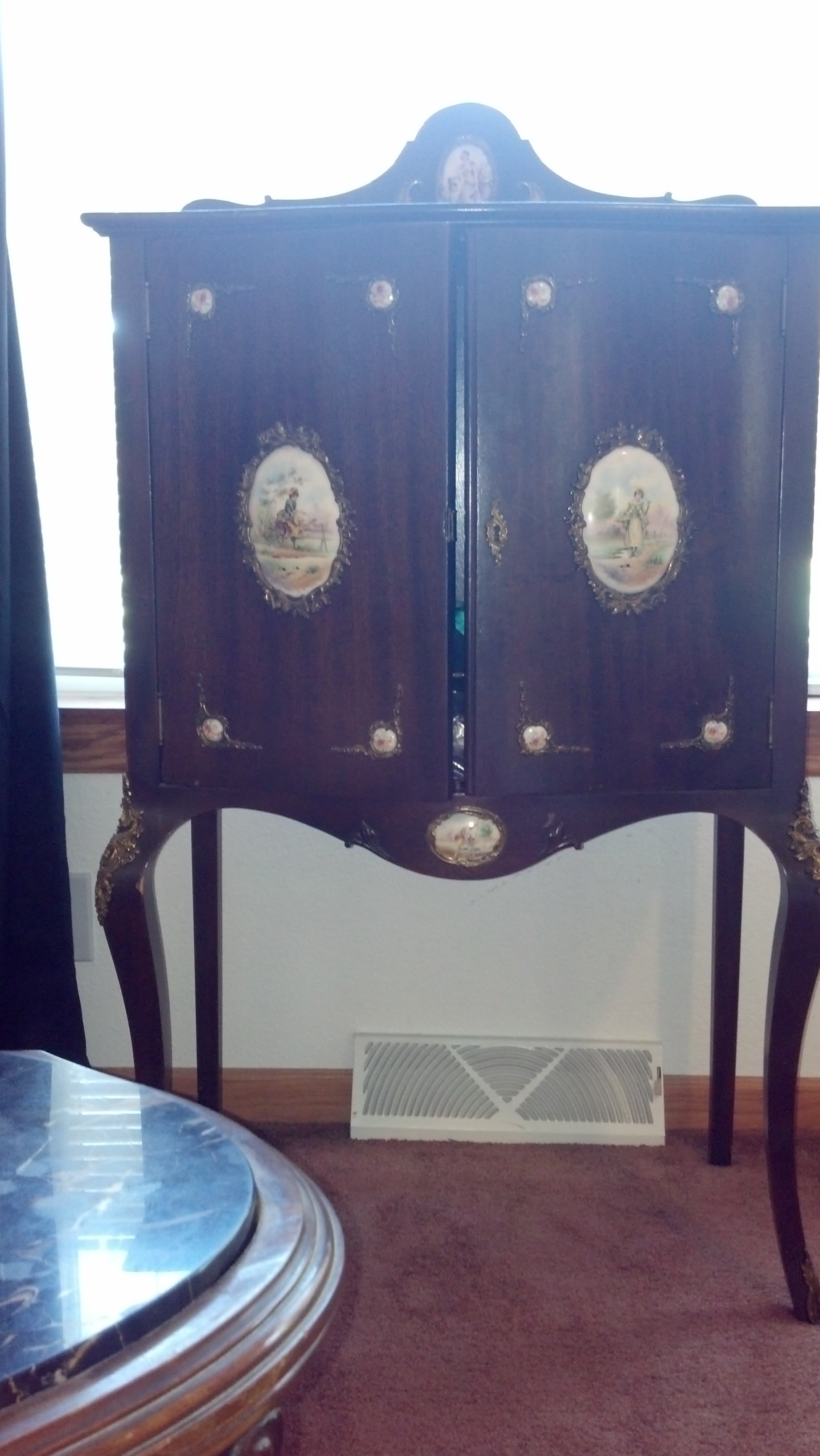 This cabinet has long legs with bronze on the curve of each front leg. Locking cabinet doors with key. Porcelain plaques on the front of each door, one below doors and one on the backing across the top. There are 2 bronze rails on the top.