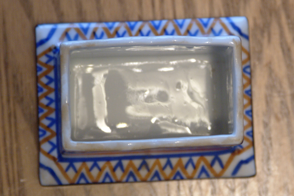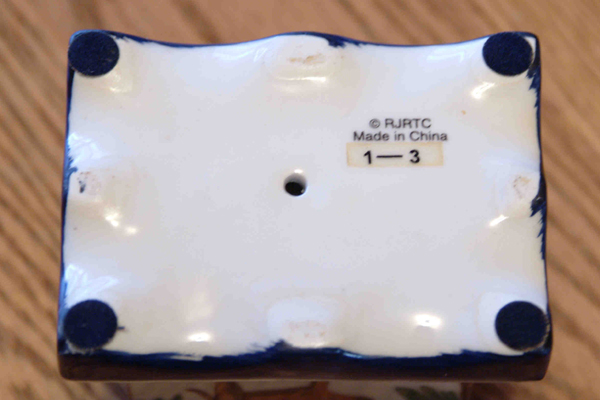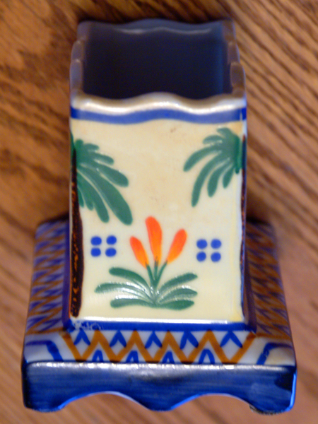 Ceramic Base painted in Blue & Tan Colors. Top has Camel painted Brown with orange landscape and Palm trees in brown plus green palms.