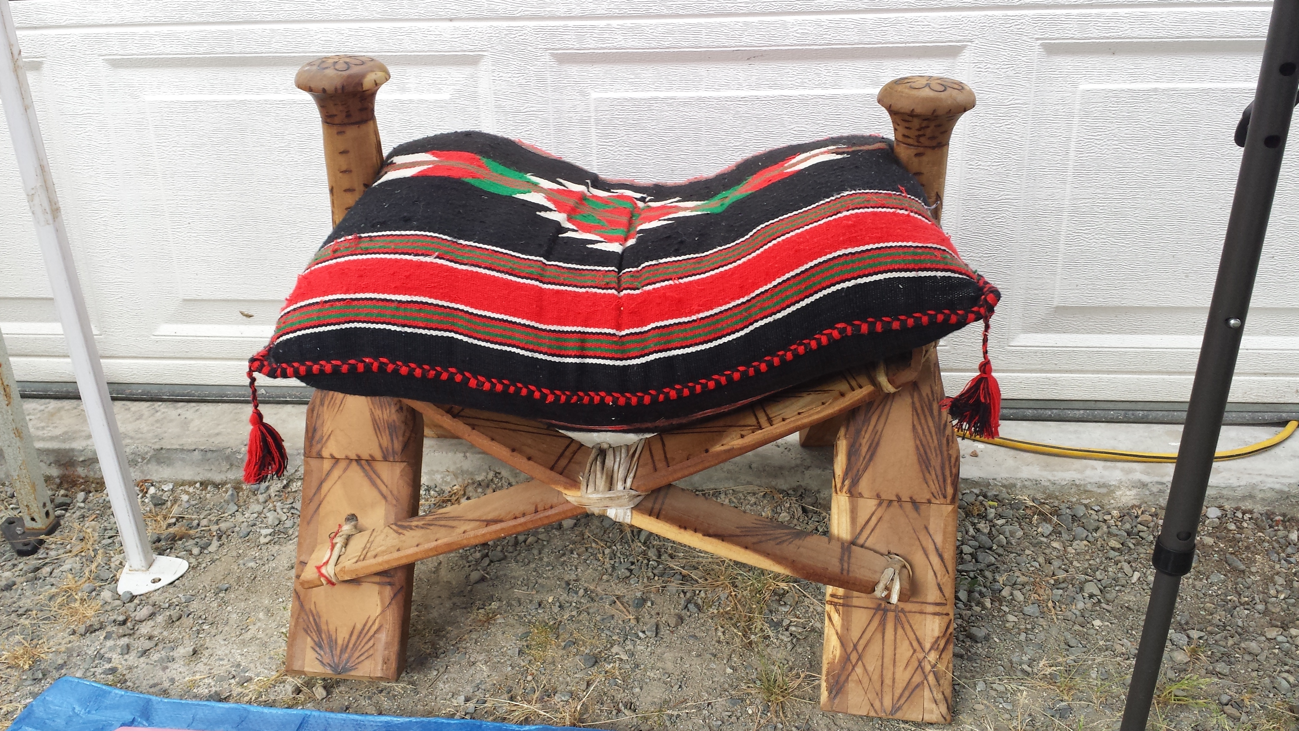 Has seat and designs carved into the wood. No markings. In excellent condtion