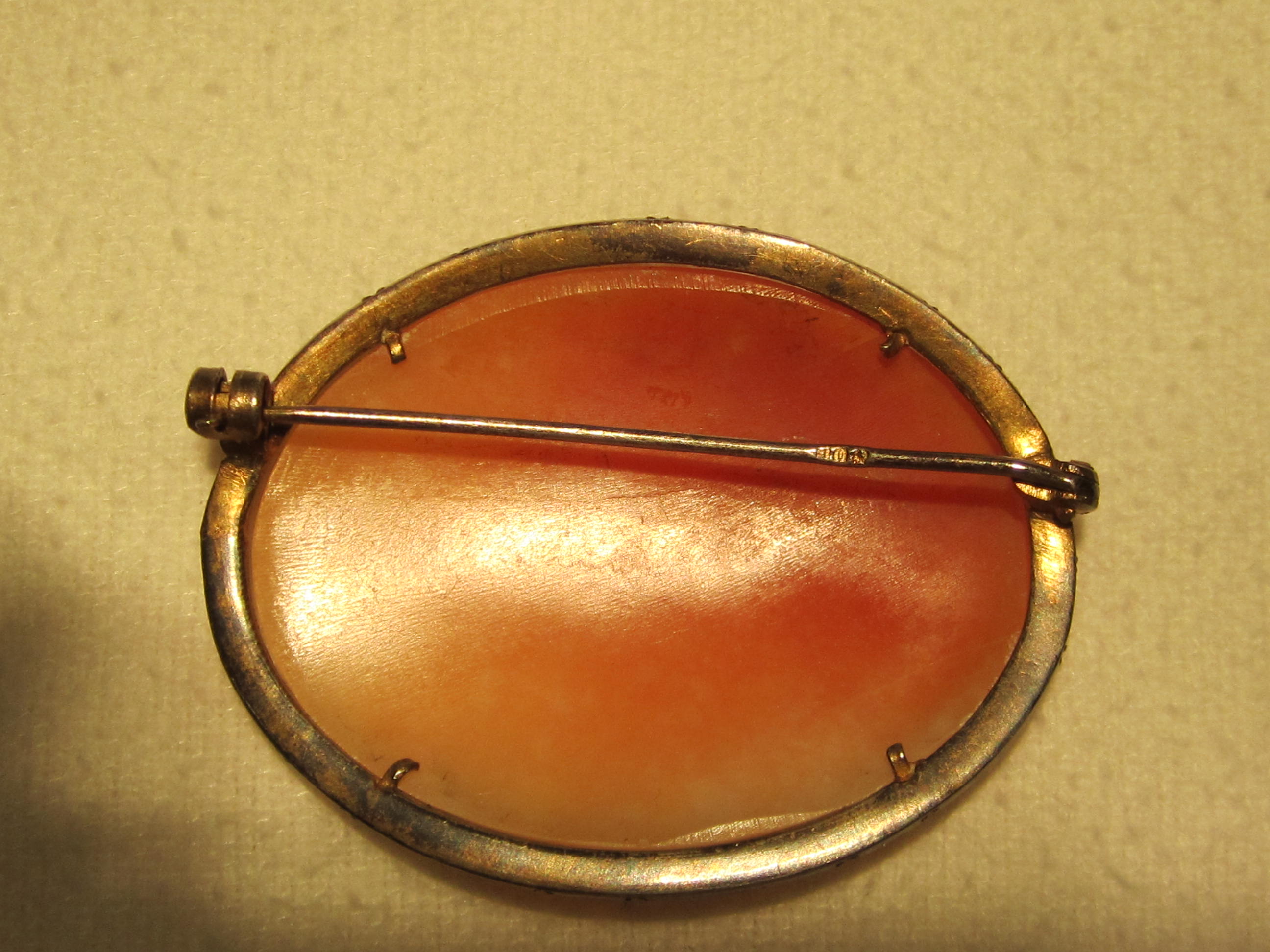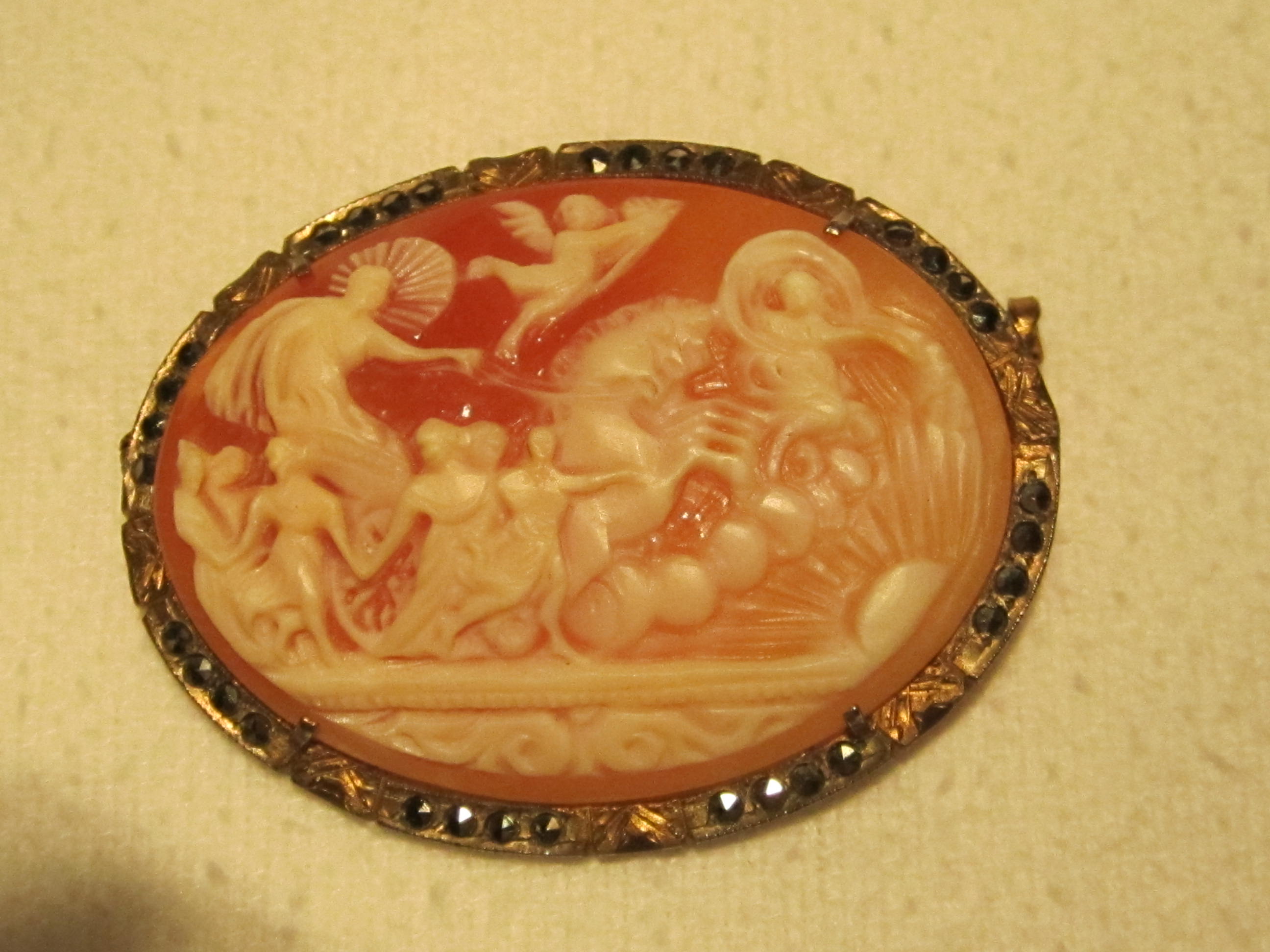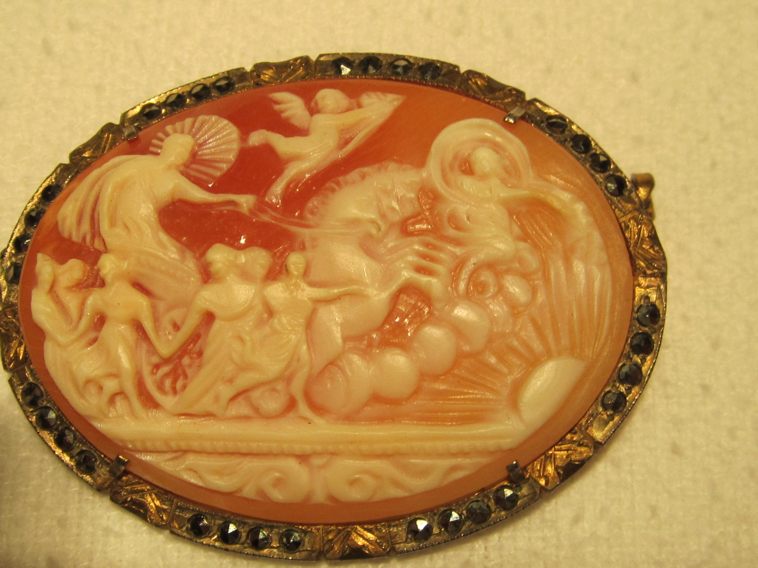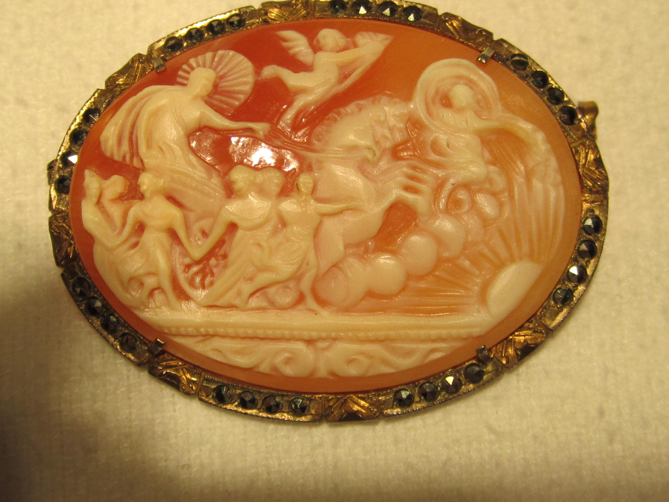 Check the cameo closely. If the material is dense with minimal pores/grain, it may be stone. If lighter and more porous/grainy, it is probably shell. Shell cameos often also have curved back sides. If a shell cameo and my guess on vintage is correct, value is likely $50 tops - probably less. If stone of similar vintage - or older, value could be $100 and up. Older is definitely better in terms of value. BTW: The cameo pattern is fairly intricate and attractive.