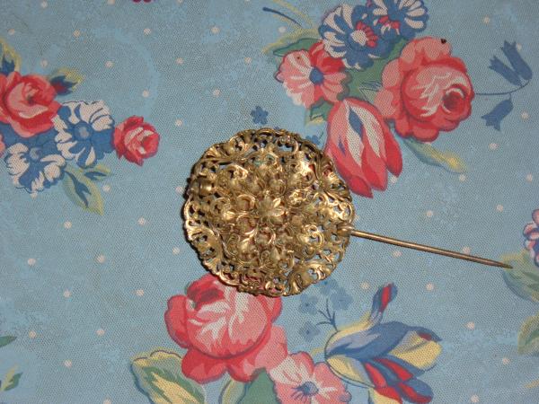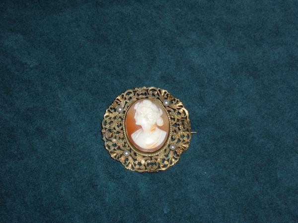 Grandmother moved to US in the 1930's. The broach is a cameo possibly made of coral on a golden filigree pin with four pearls inlaid in pin. Very pretty.