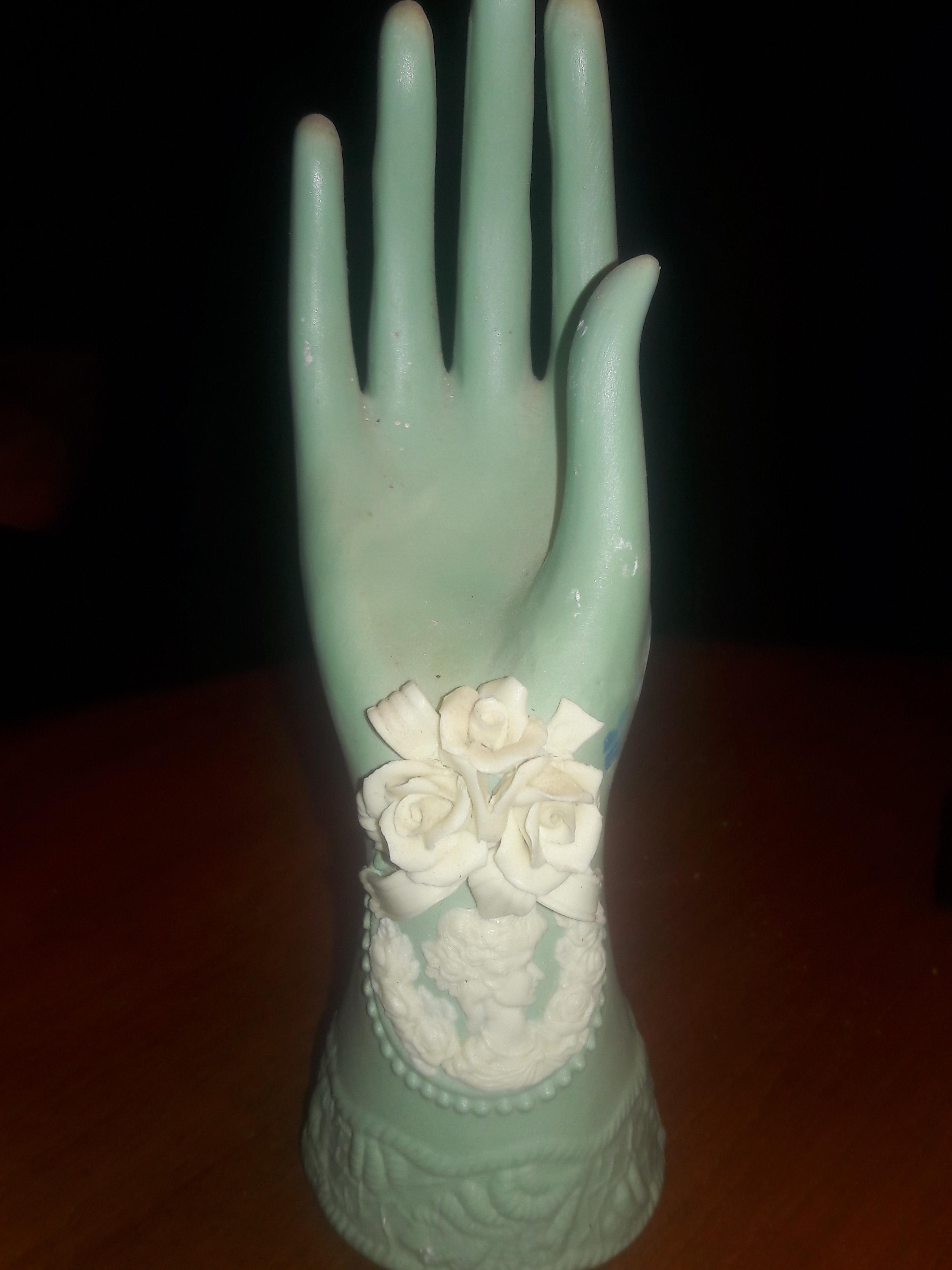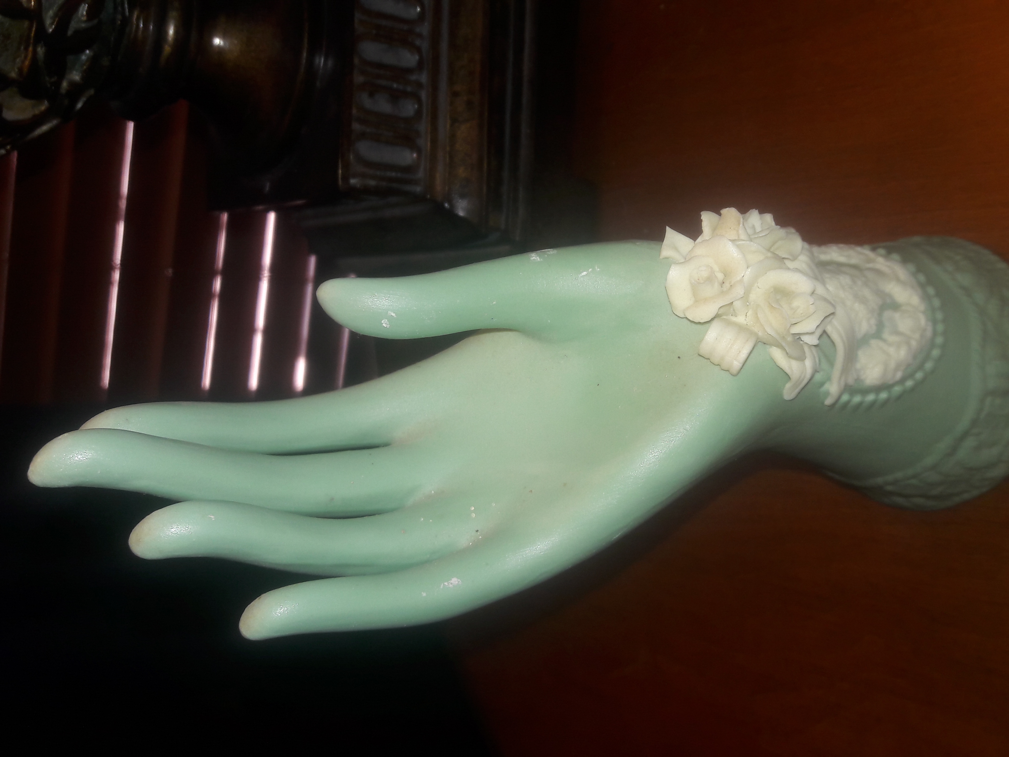 Am not sure of your ceramic - could be bisque by the photo... more recently they were produced in porcelain or a white lustre opalescent ceramic, but it's a ring holder hand statue either WITH a Victorian look or FROM the Victorian era. Have seen similar with lace and roses but not cameo. Your granma's one seems very detailed and elaborate so may hav been used for display purposes in a shop.