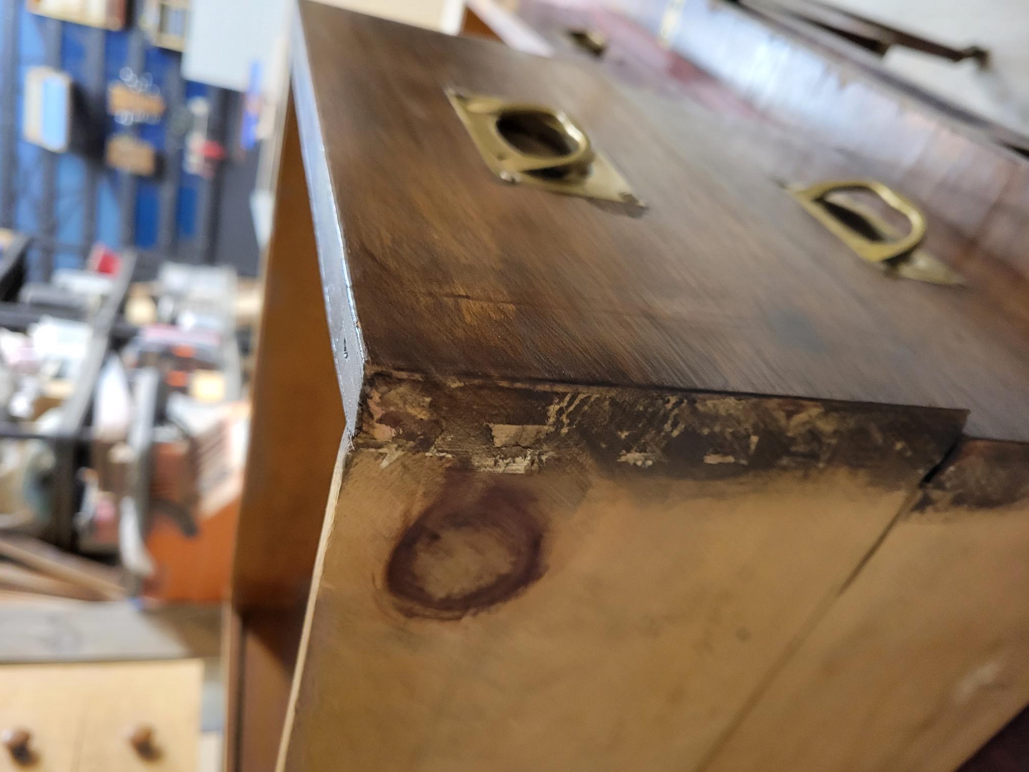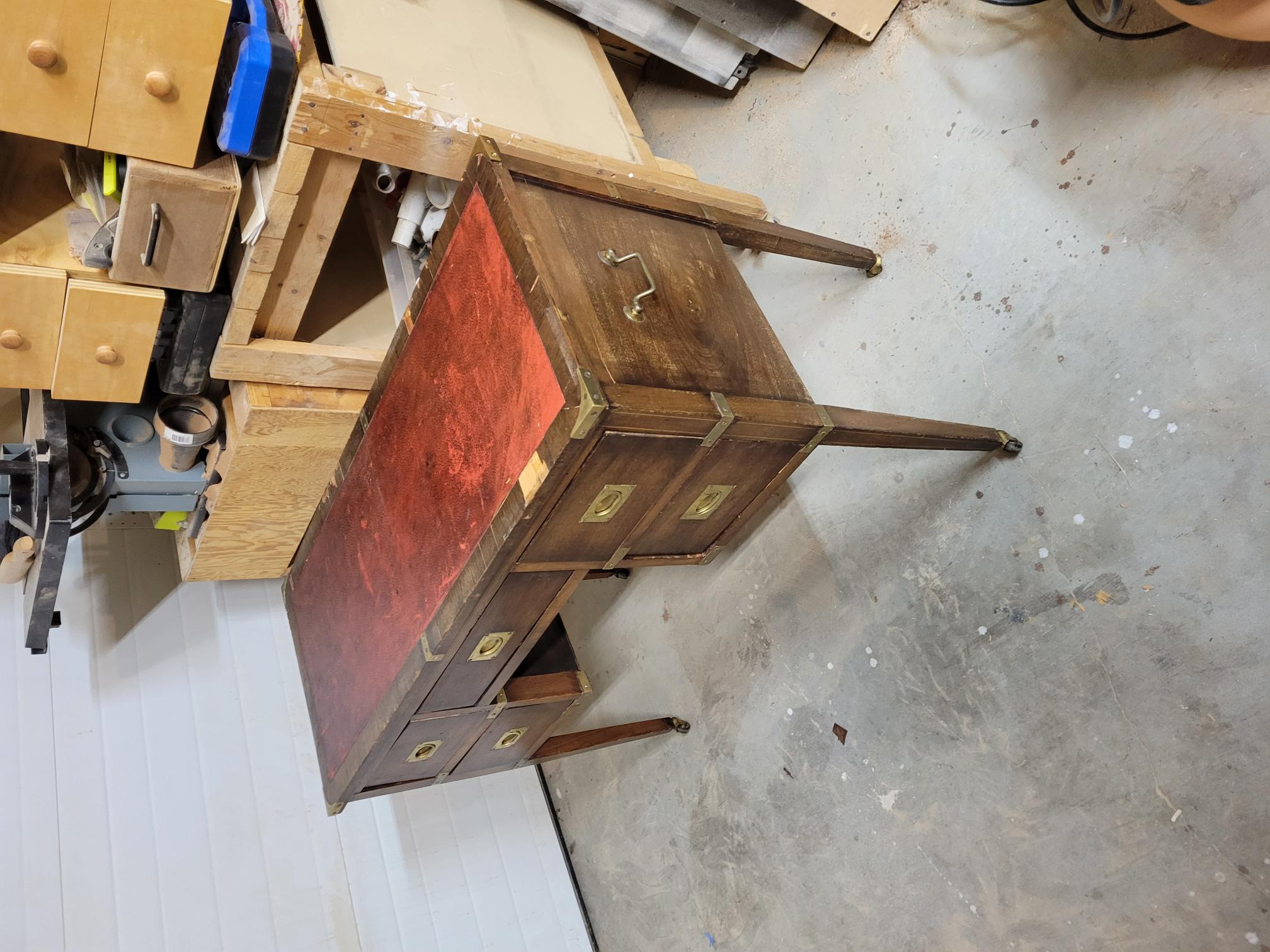 Found this "campaign style" desk and restored it since it was covered in many coats of stain and veneer had completely failed.