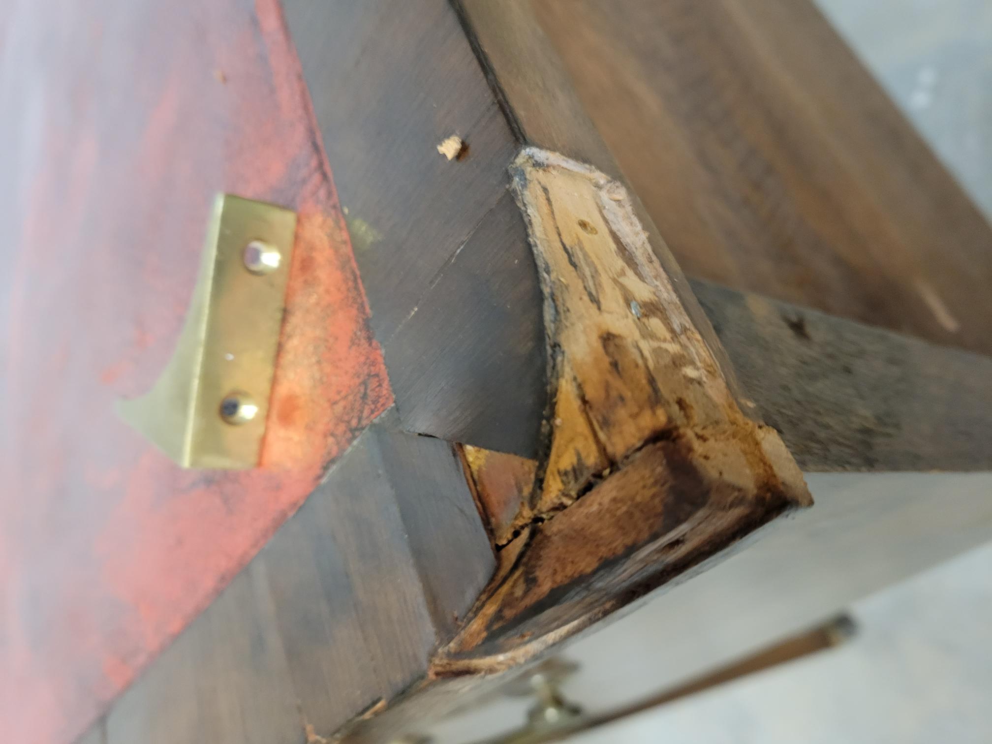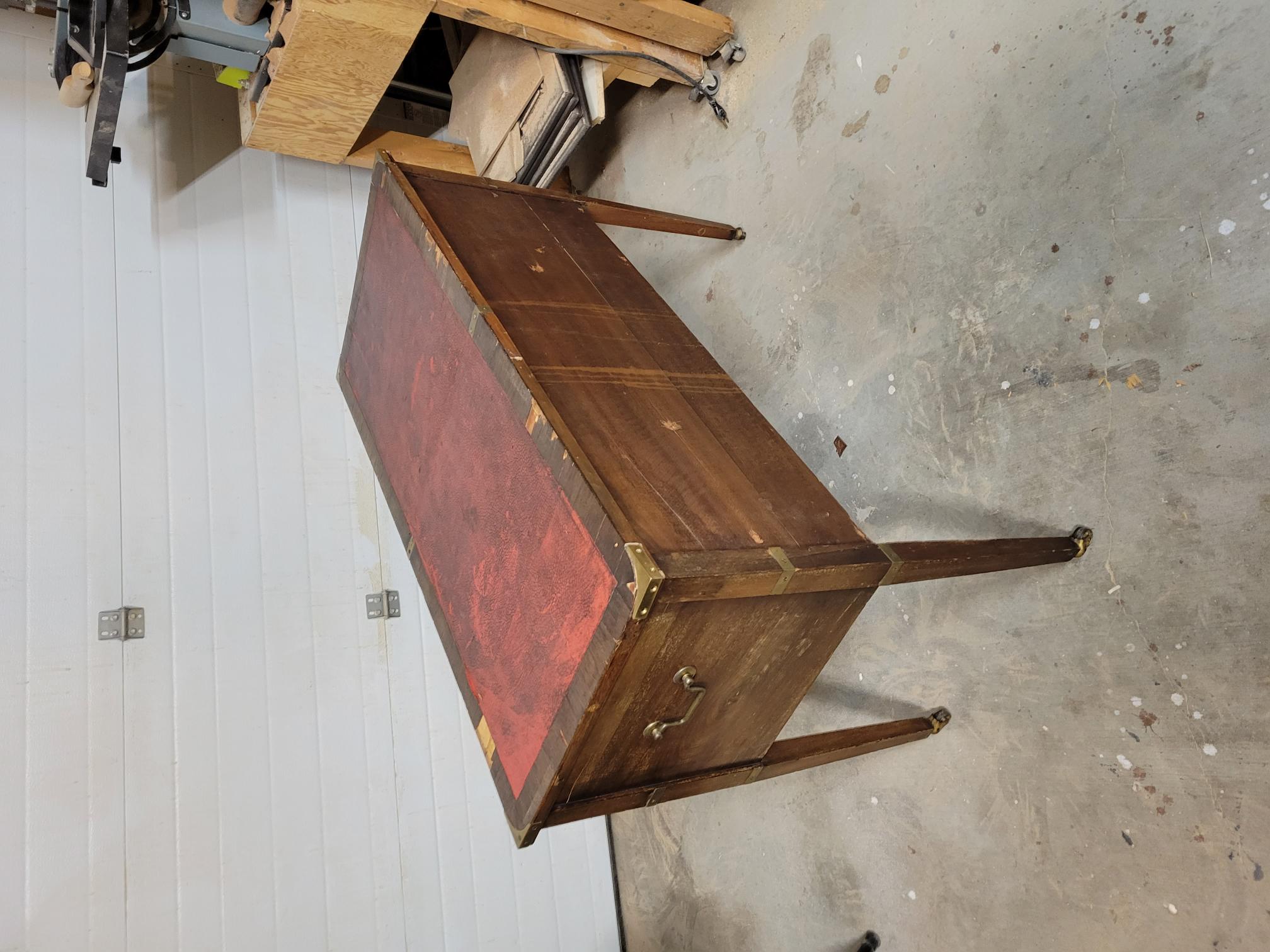 - Looks to be made from multiple original pieces. Someone scratched 1946 in the piece which was likely when the pieces all came together to form this desk. Brass could have been added at this time.