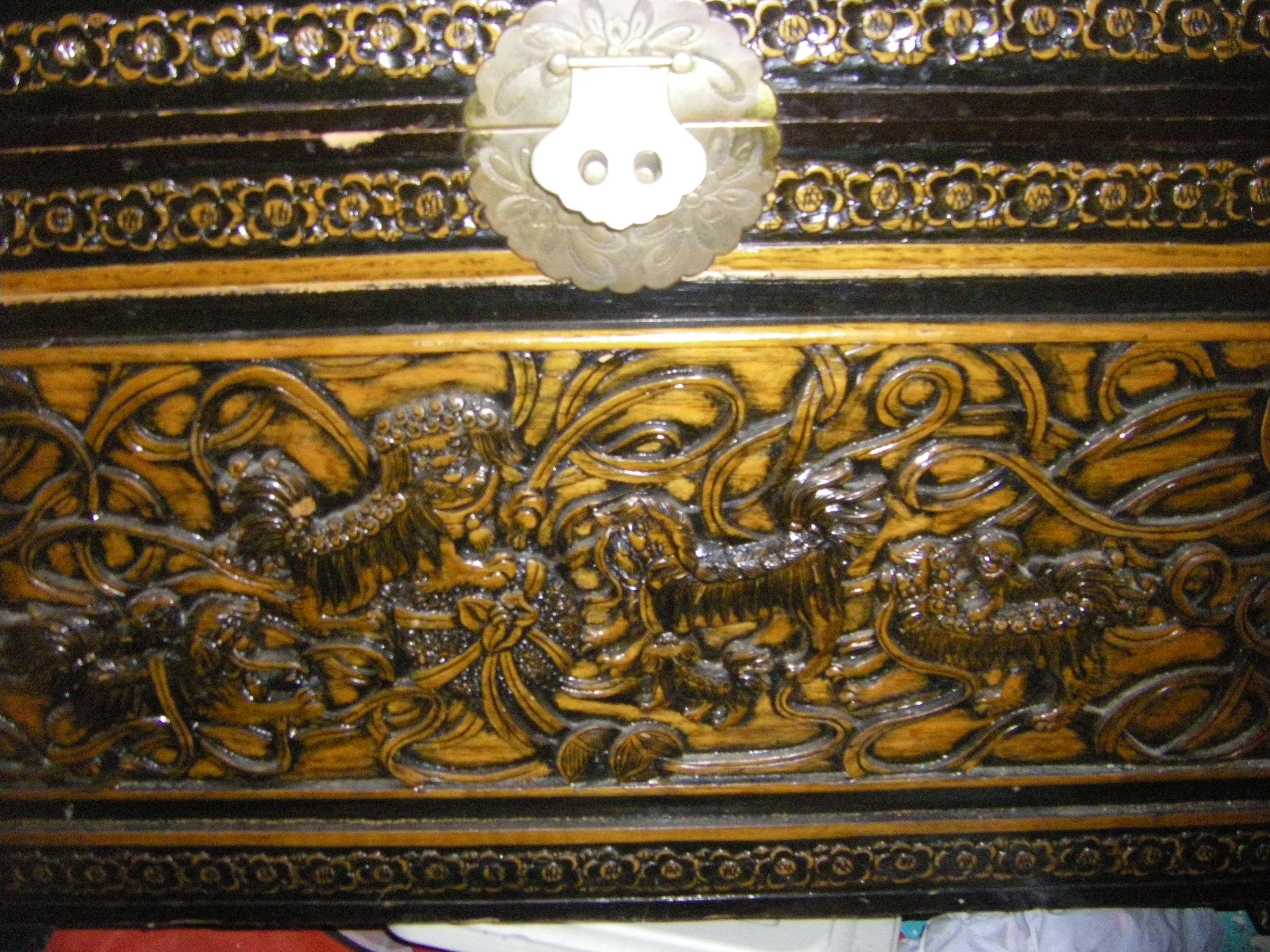 I believe this trunk to be an asian camphor chest, but I am not positive. Not water stains, and generally in great condition. Not sure of age. I was unable to find any manufacturing marks, names, or dates. The chest was orginally purchased over seas and later purchased by my mother who in turn gave to me.