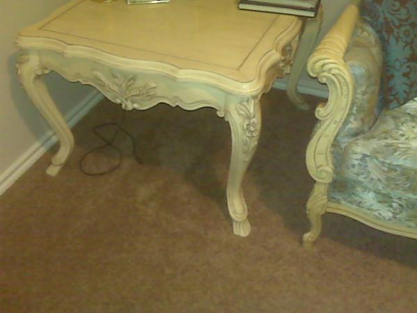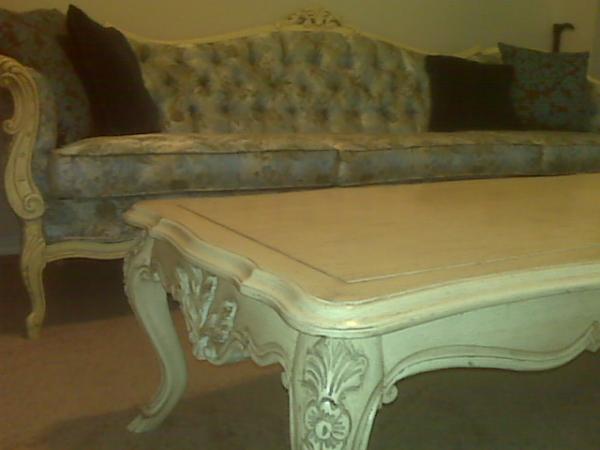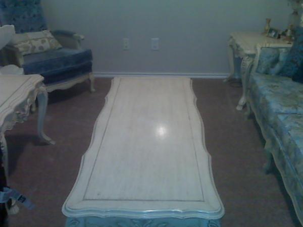 Living room set includes sofa, coffee table, 2 end tables and 2 side chairs.