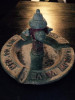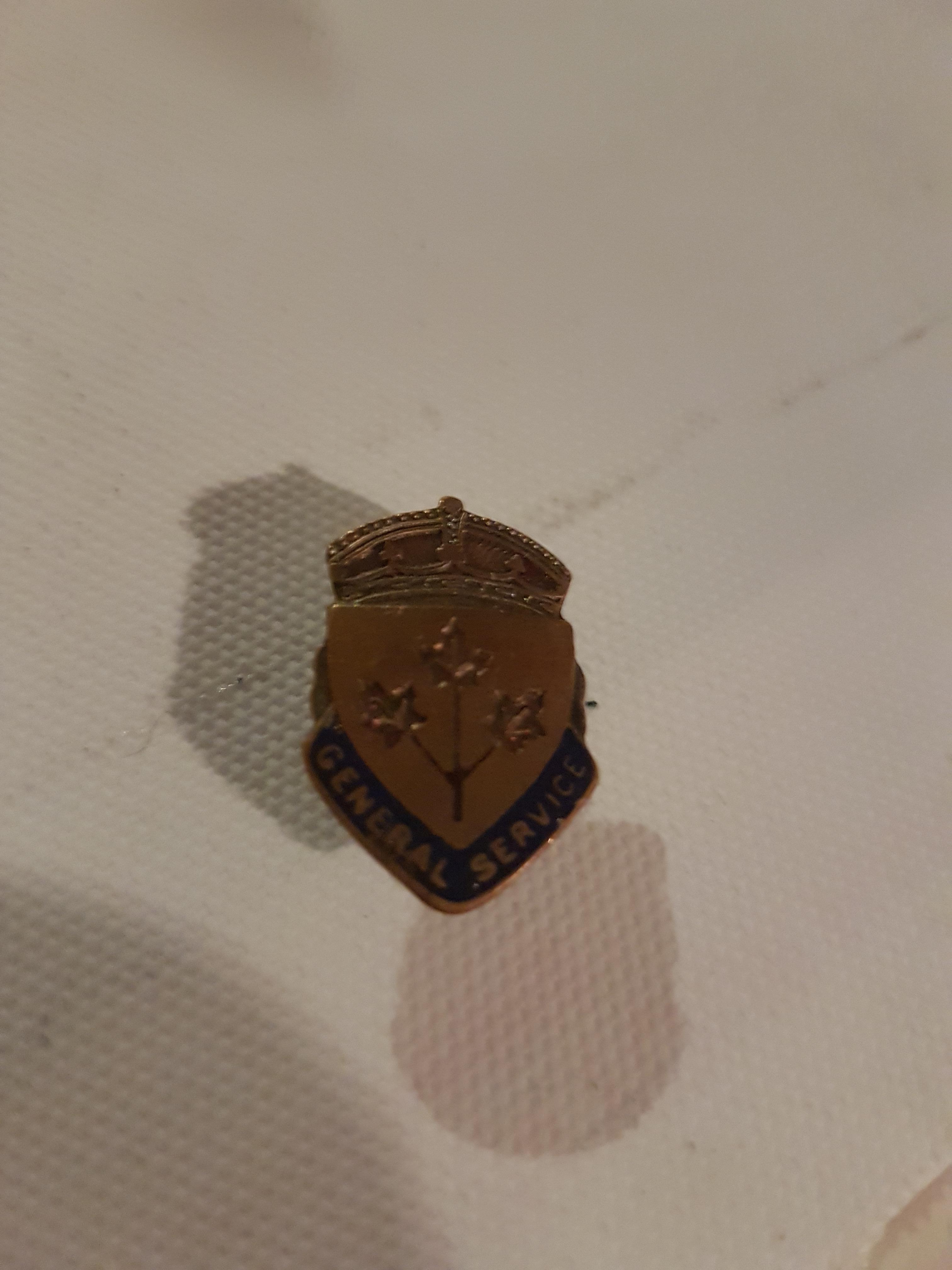Old pin from one of the canadian wars general service , the pin is the shape of a sheild with 3 maple leafs in the middle with a crown on top and blue banner on bottom. number 205770