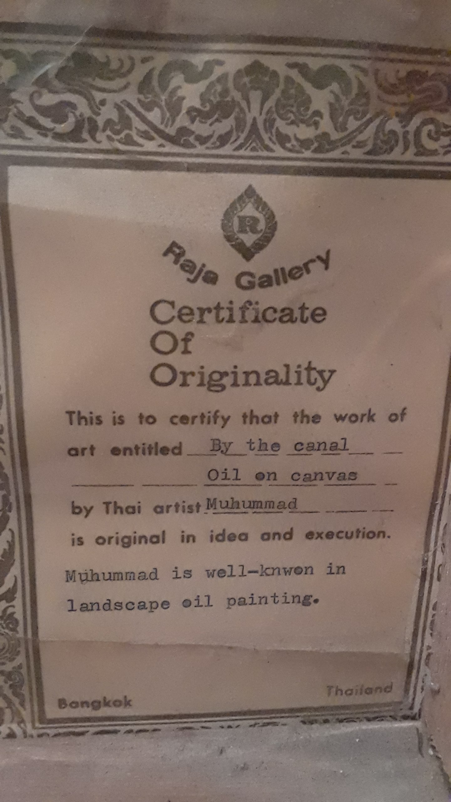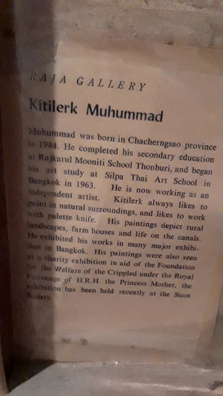 Muhummad – S. K. Muhummad – K. Muhummad .Was born in Chacherngsao Province, Thailand in 1944. He completed his secondary education in Rajkarul Mooniti School Thonburi, and began his aart study at Silpa Thai Art School in Bangkok in 1963. His paintings depict rural landscapes, farm houses and life on the canals. He exhibited his works in many major exhibitions in Bangkok. His paintings were also seen at a charity exhibition in aid of the Foundation for the Welfare of the Crippled under the Royal Patronage of H.R.H, the Princess Mother. His paintings currently sell for under $100.00 at auction