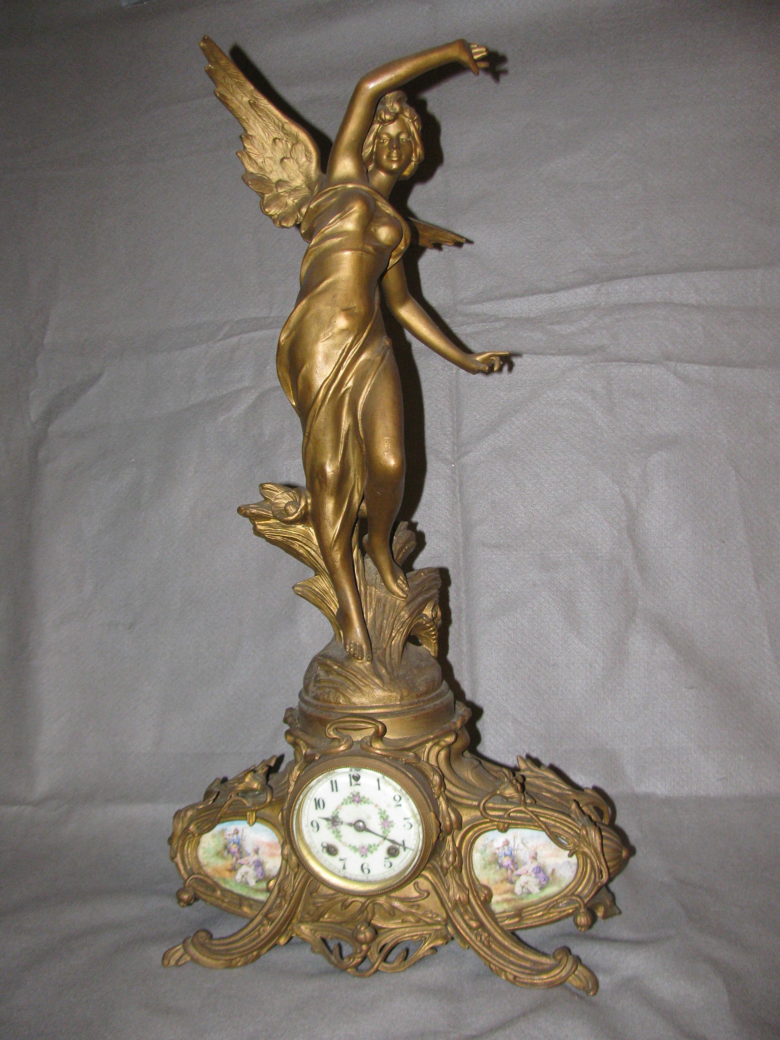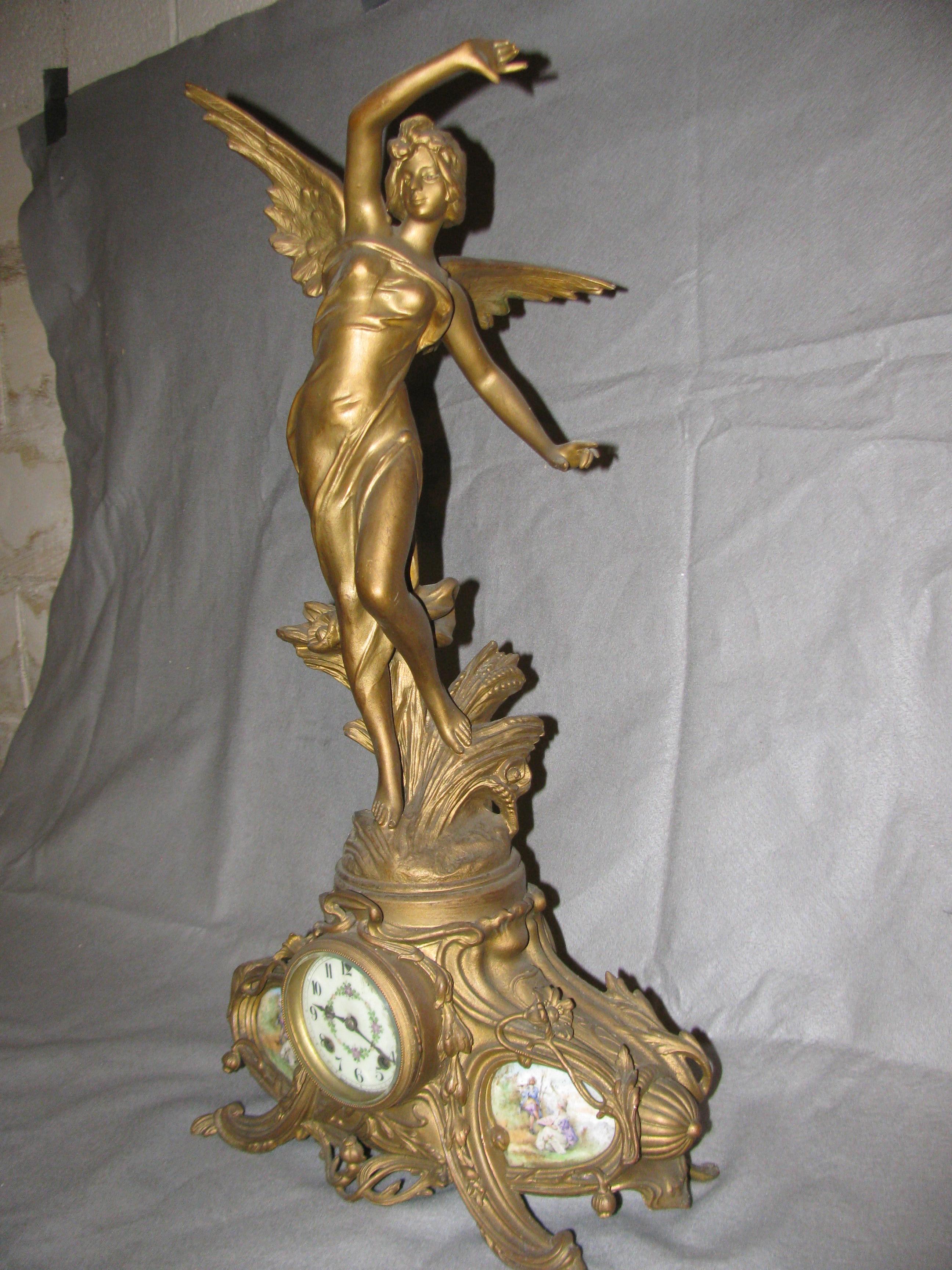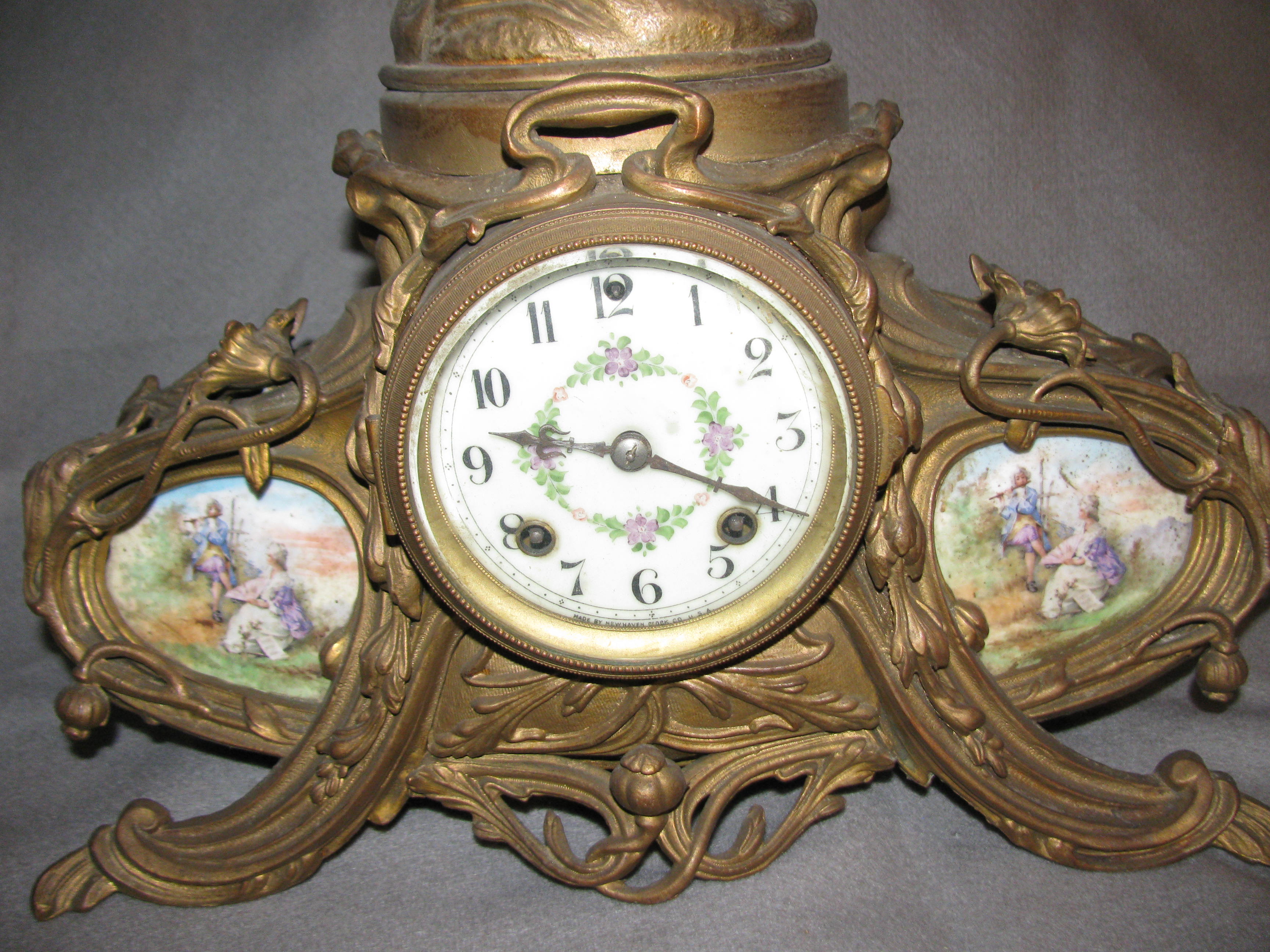 3 piece Candelabra and Mantle Clock Set. Very ornate, extreamly heavy. Possibly bronze.