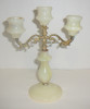 It Is a three stick silver candle holder,with a round bowl that has what looks like to be tea leaves all the way around the top. The candle stick holders curve around the bowl and form into the feet underneath
