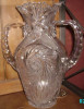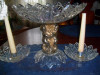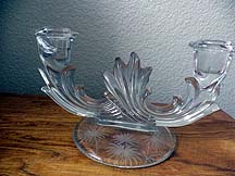 Carved crystal candlestick holder for two candles, low not high, swirling floral motive connects the two candlesticks.
