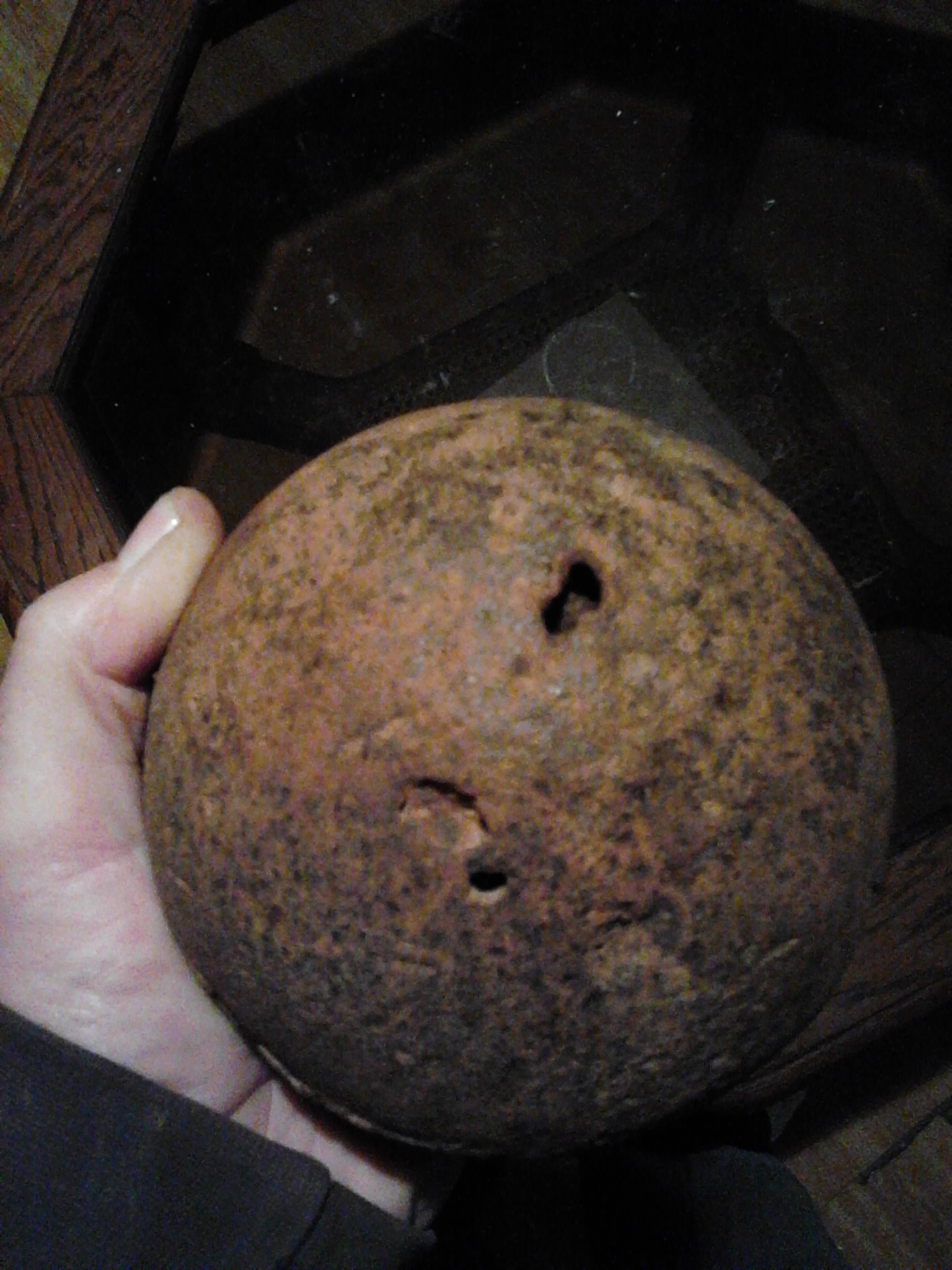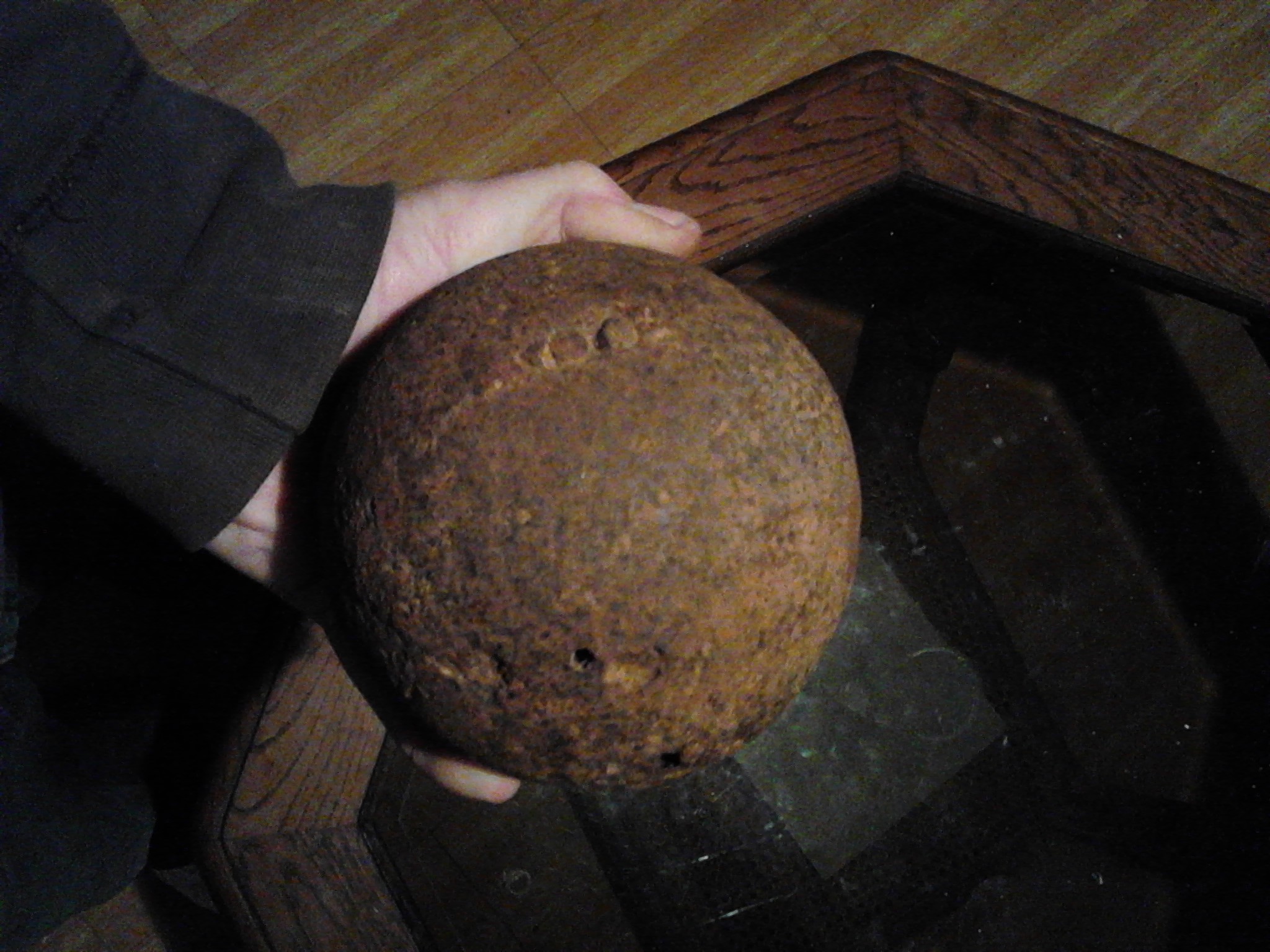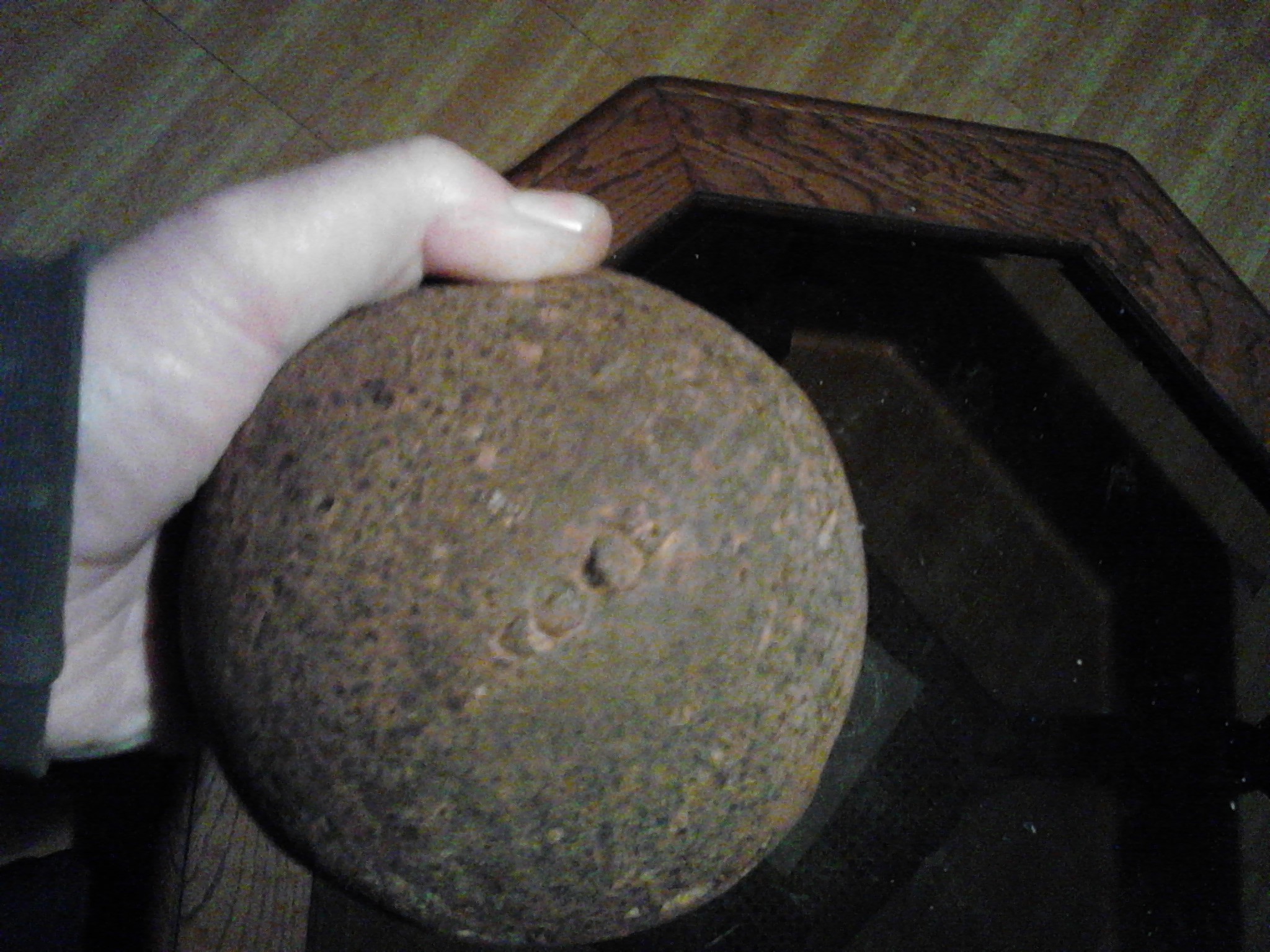 its 5" in diameter and weighs aprox 15lbs and was found about 20 miles from the battle of pilot knob.