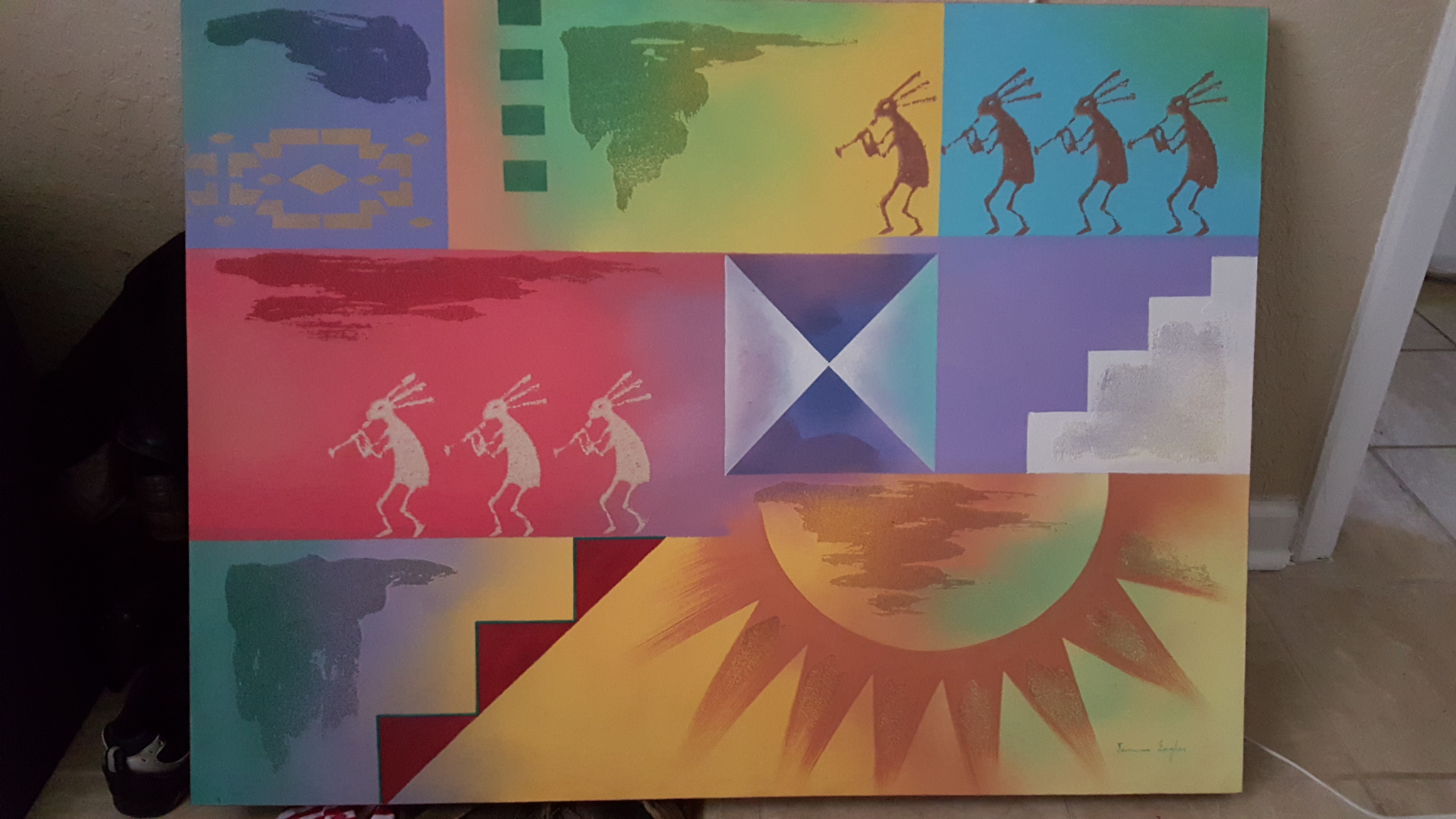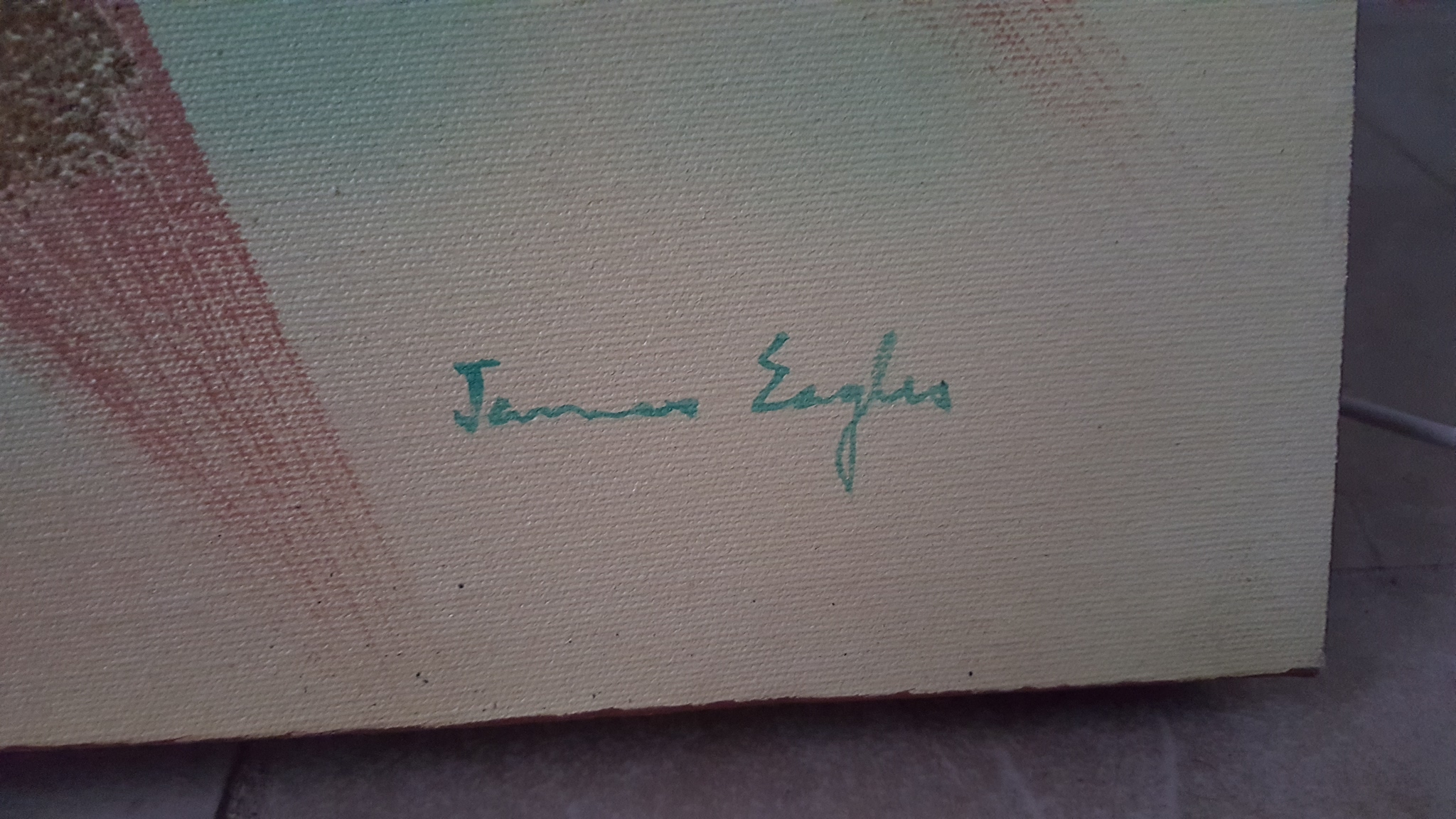 Description I have a canvas painting of what looks like aztecs playing instruments. Very colorful and brings lots of joy. It's by an artists that I believe is James Eagles. It was purchased from Artists Guild of America, Gardena California.