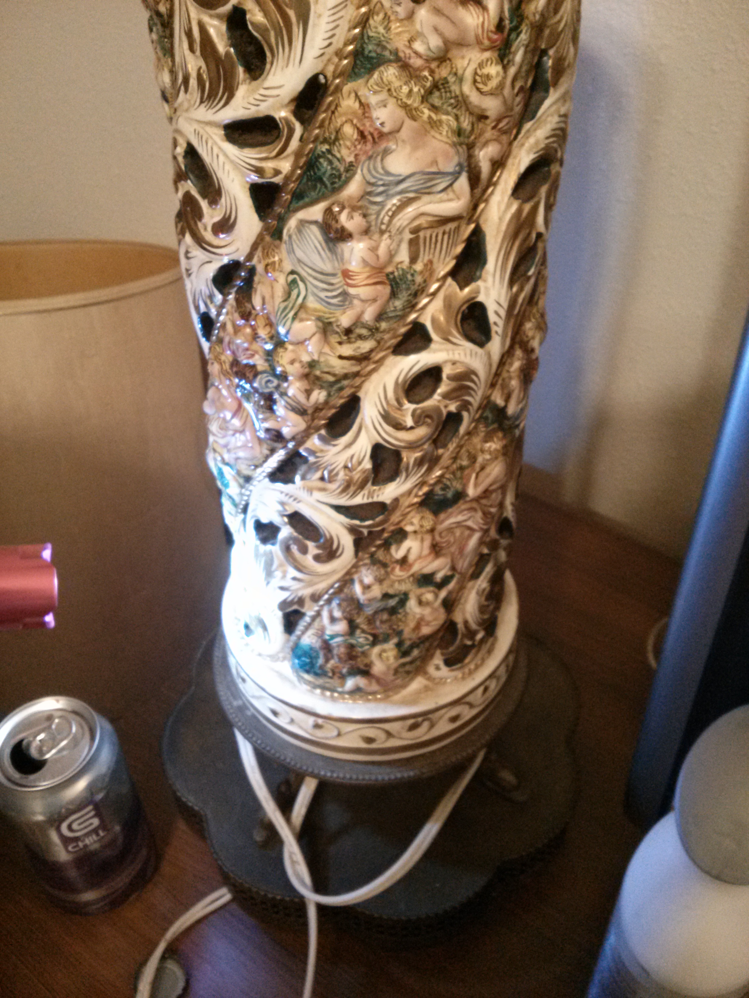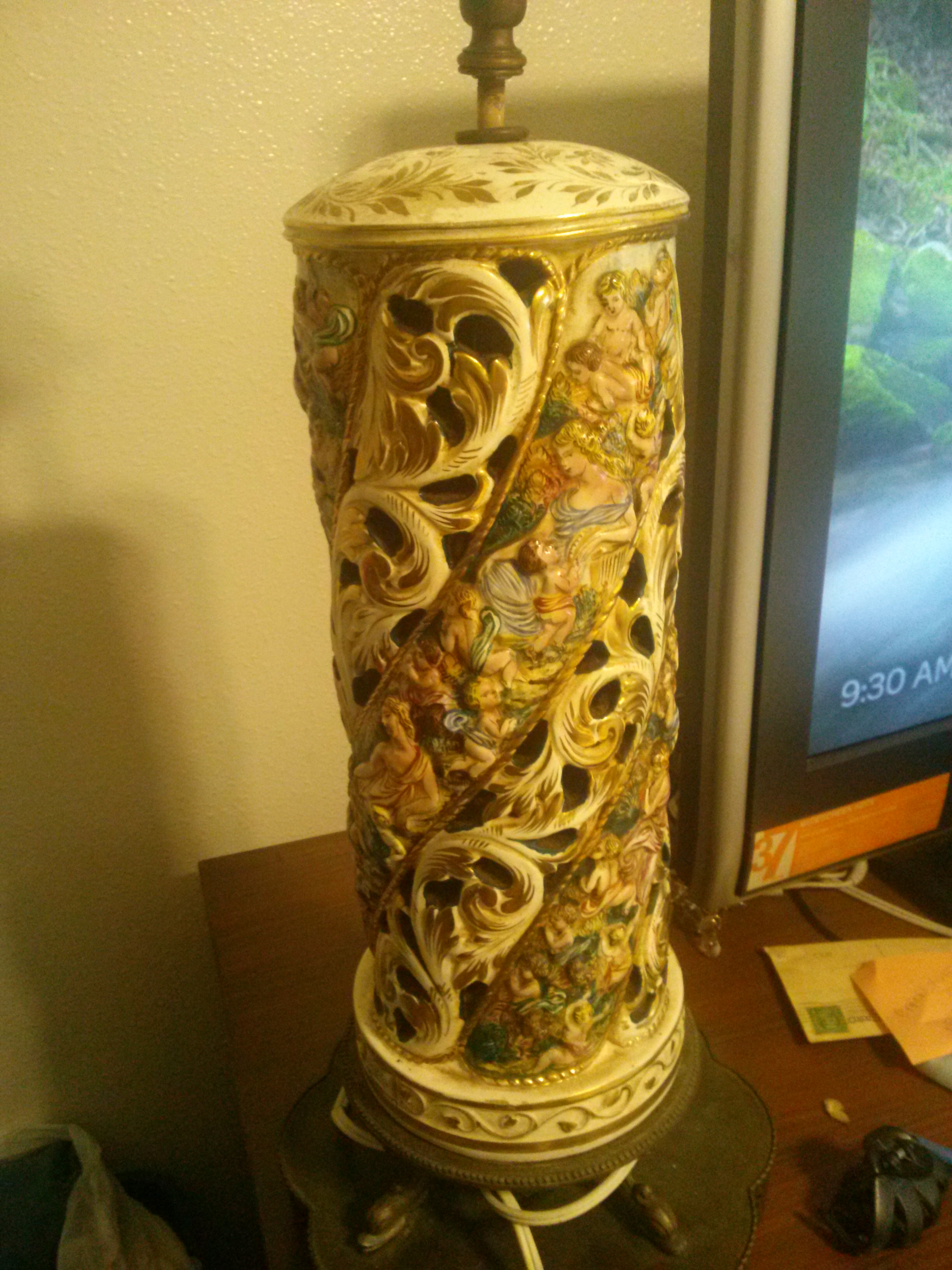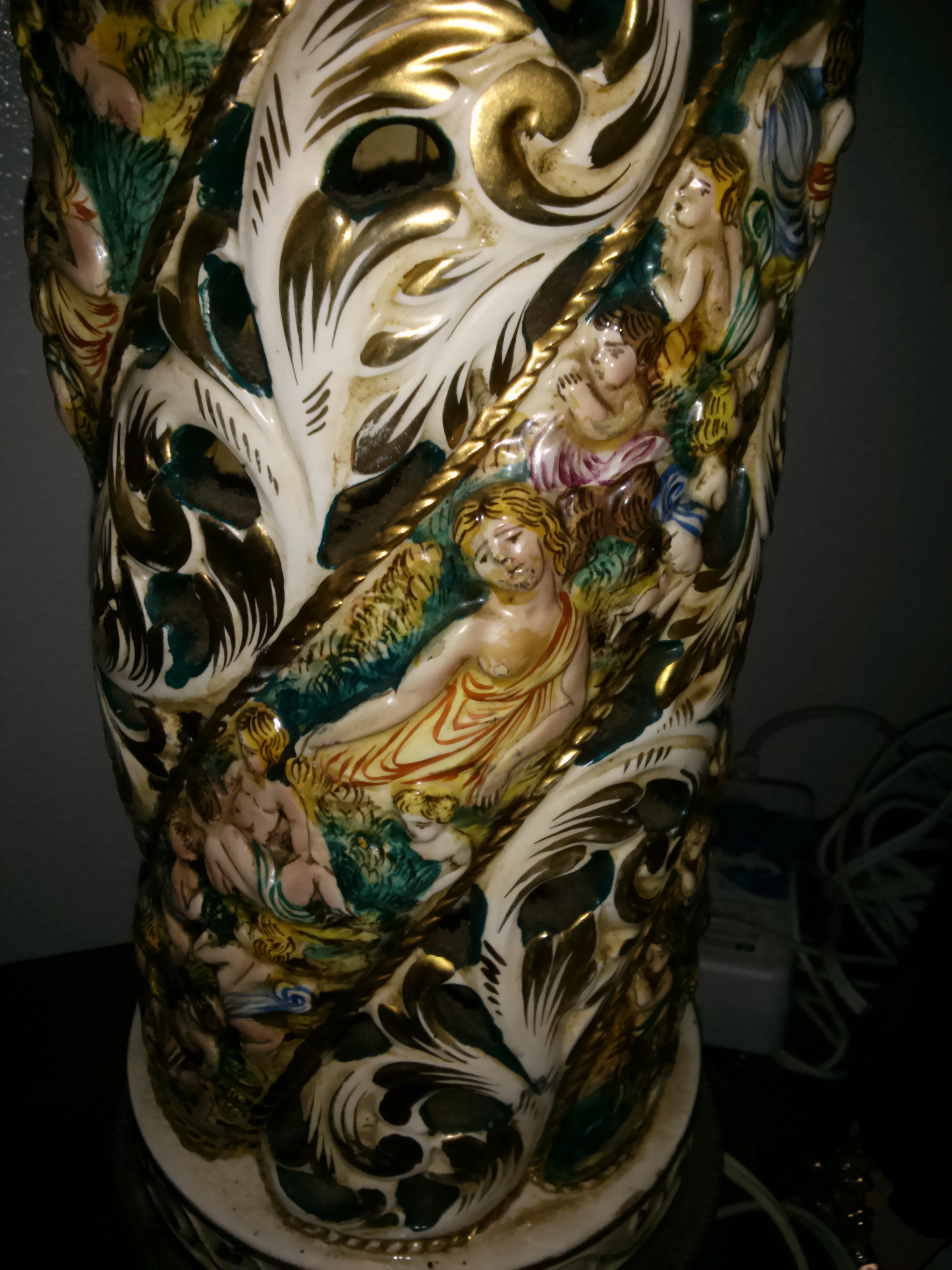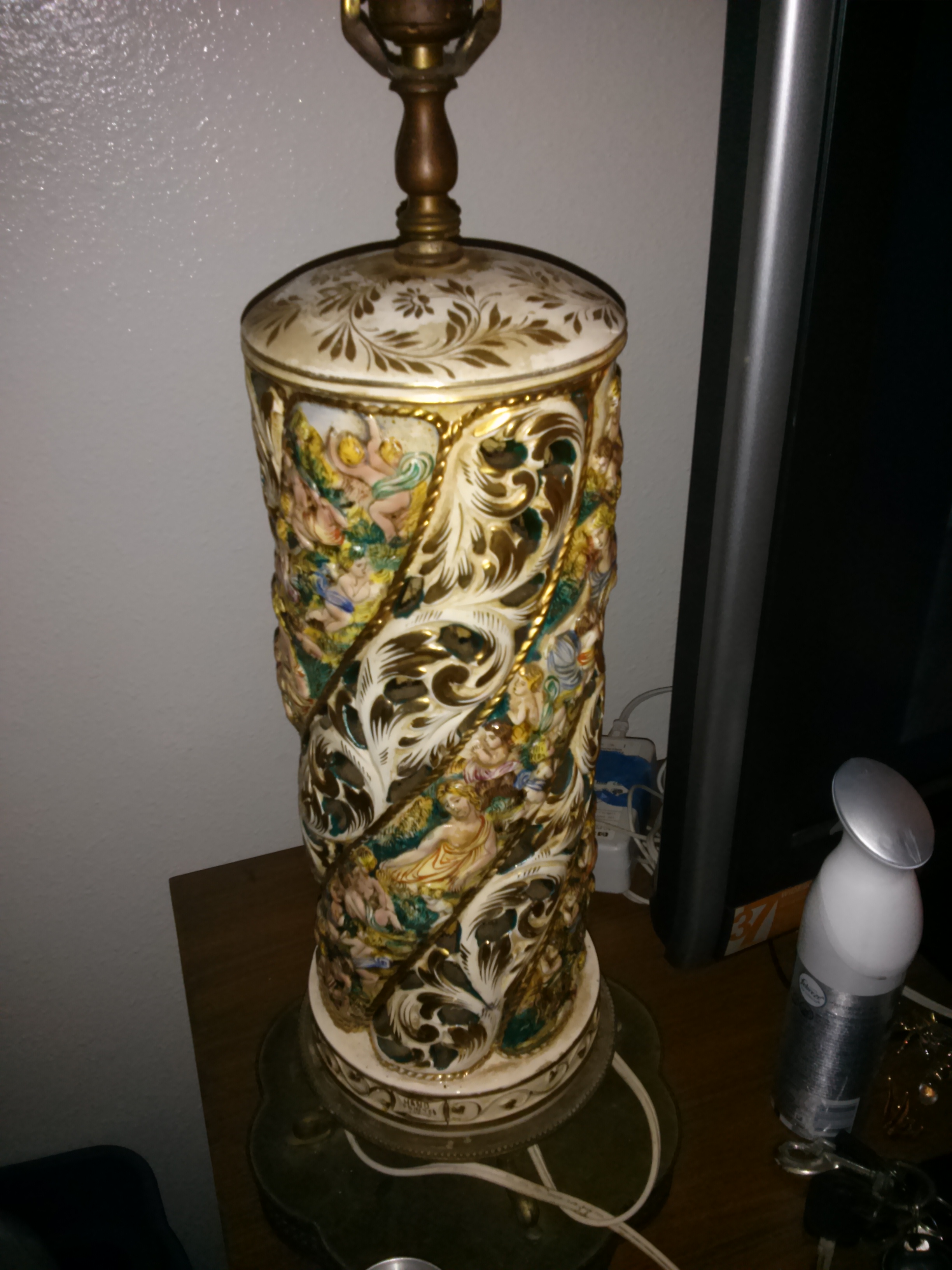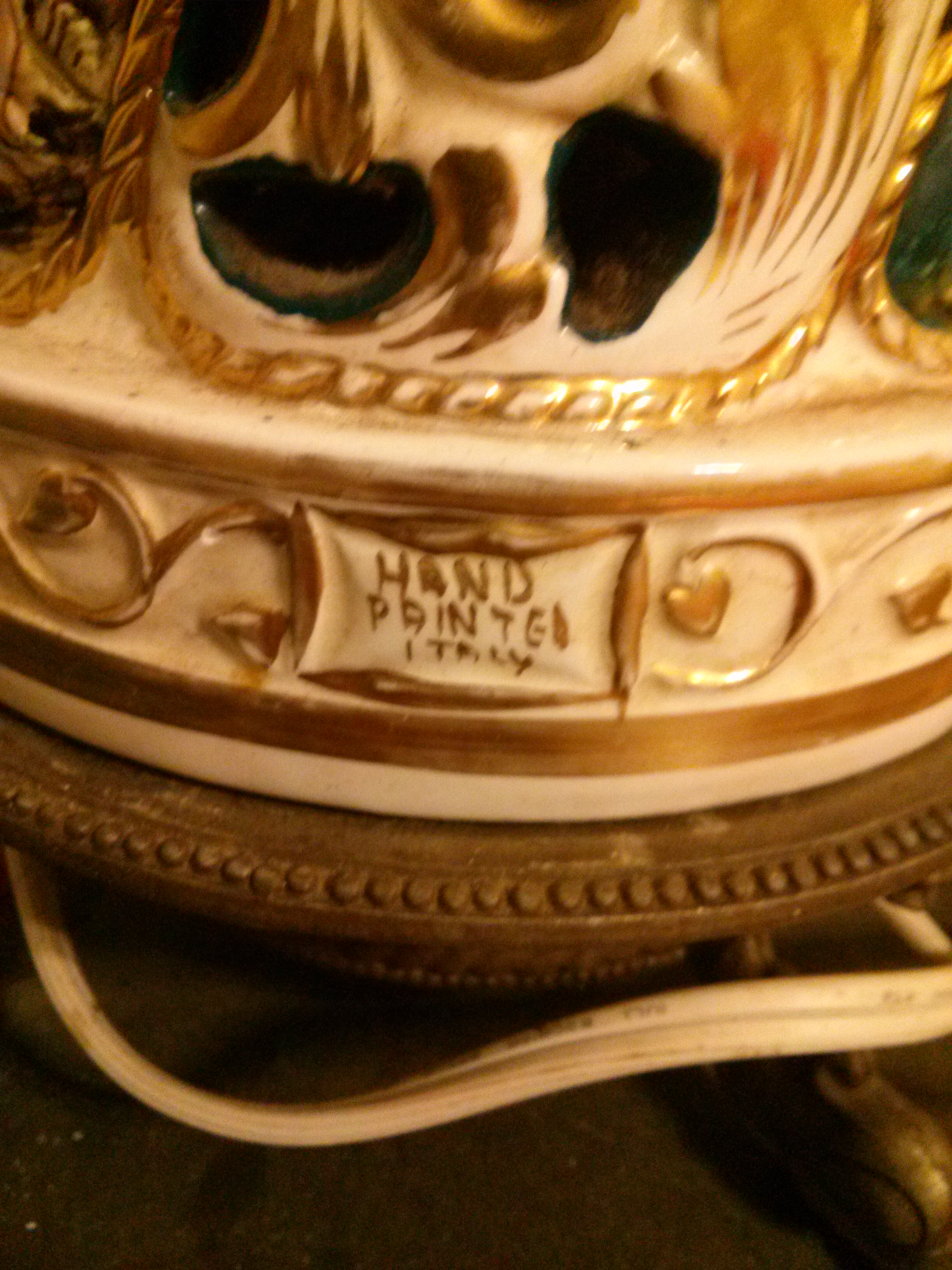 the lamp stands about 25" tall and sits on a brass stand that looks like fish for the legs. It has beautiful detail of cherubs and says on the lower bottom of the detail states Hand Painted. At the very bottom of the lamp states "NP (then it looks like 2 music notes) Capodimonte ITALY".