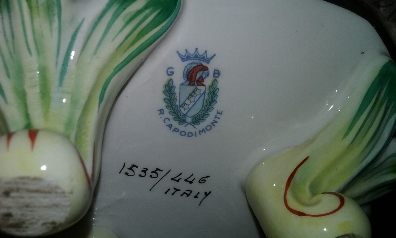 The markings on the bottom of the bowl are a crown with some type of object on top of a shield. The shield is gray with a sash of white containing three stars. On each side of the shield is a branch. The letter "G" is above the branch on the left, and the letter "B" is above the branch on the right. Under the branches are the letters "R. Capodimonte". Under this is written "1535/446" and "Italy".