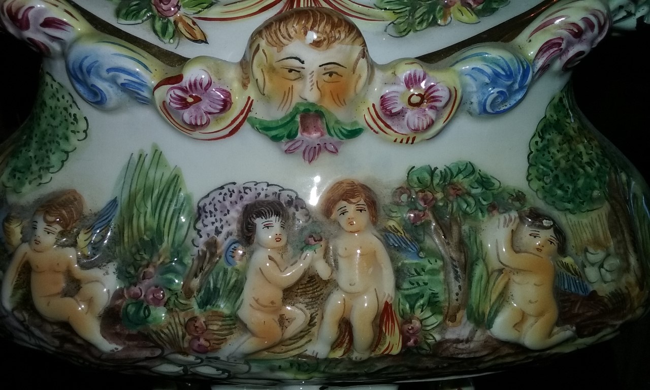 The bowl itself appears to have cherubs on the front...two in the middle that appear to be holding hands or jointly holding an item. There is another cherub sitting on the left and another kneeling on the right. They are in a garden....possibly to represent Adam and Eve in the Garden of Eden???
