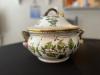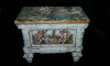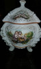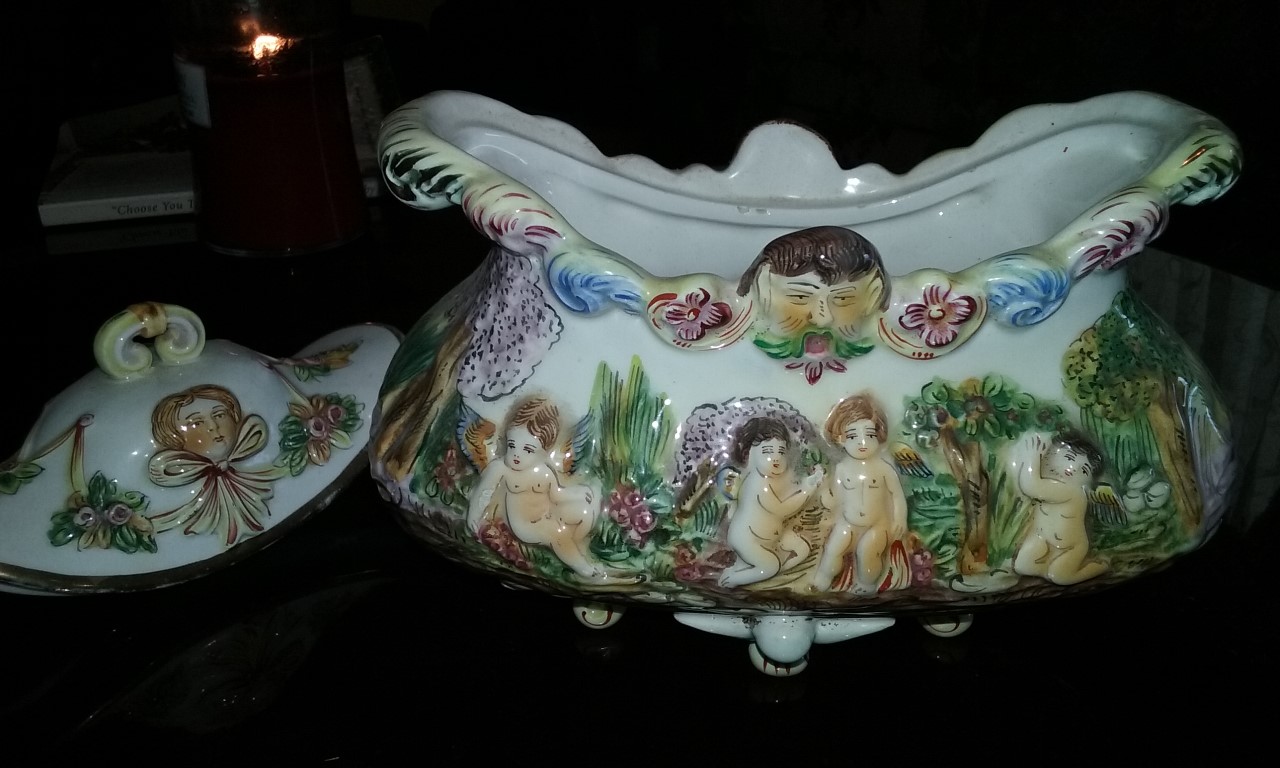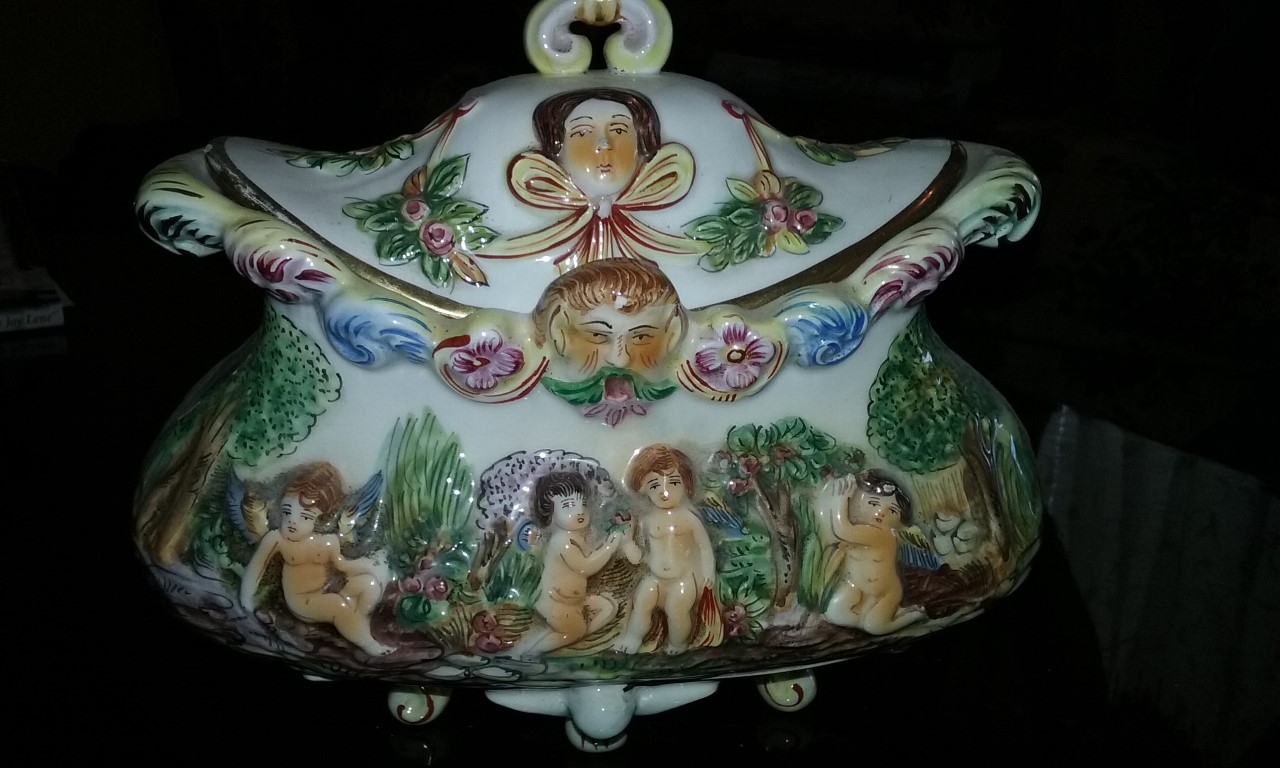 This Capodimonte piece has four short porcelain legs-one in front, one in back, and one on each side. The lid has a type of "handle" with what appears to be a woman's face with dark hair and a bow beneath the chin. There is another face under this one on the bowl itself. It appears to be a man's face with brown hair, rosey cheeks, green moustache with his mouth open. On each side of the man's face is a pink flower, then some type of design in blue.