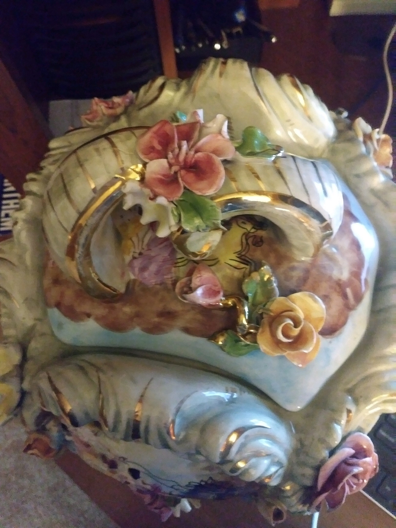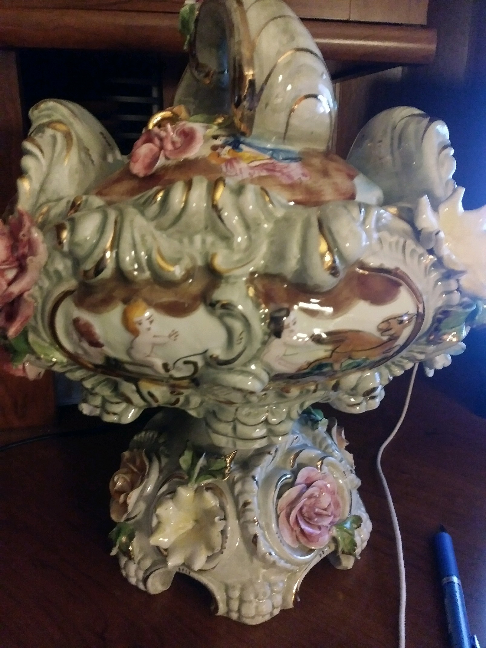 I purchased this piece today. Not sure if it is capodimonte or not. The bottom has "813 Base Galdi Made in Italy". No other marks on this piece. It measures 13" tall and 10.5" wide. The cover on top is removable. There are cherubs and animals on all 4 sides. Any advice you can provide is greatly appreciated. I have searched the internet for something like this......no luck!! Please help!!