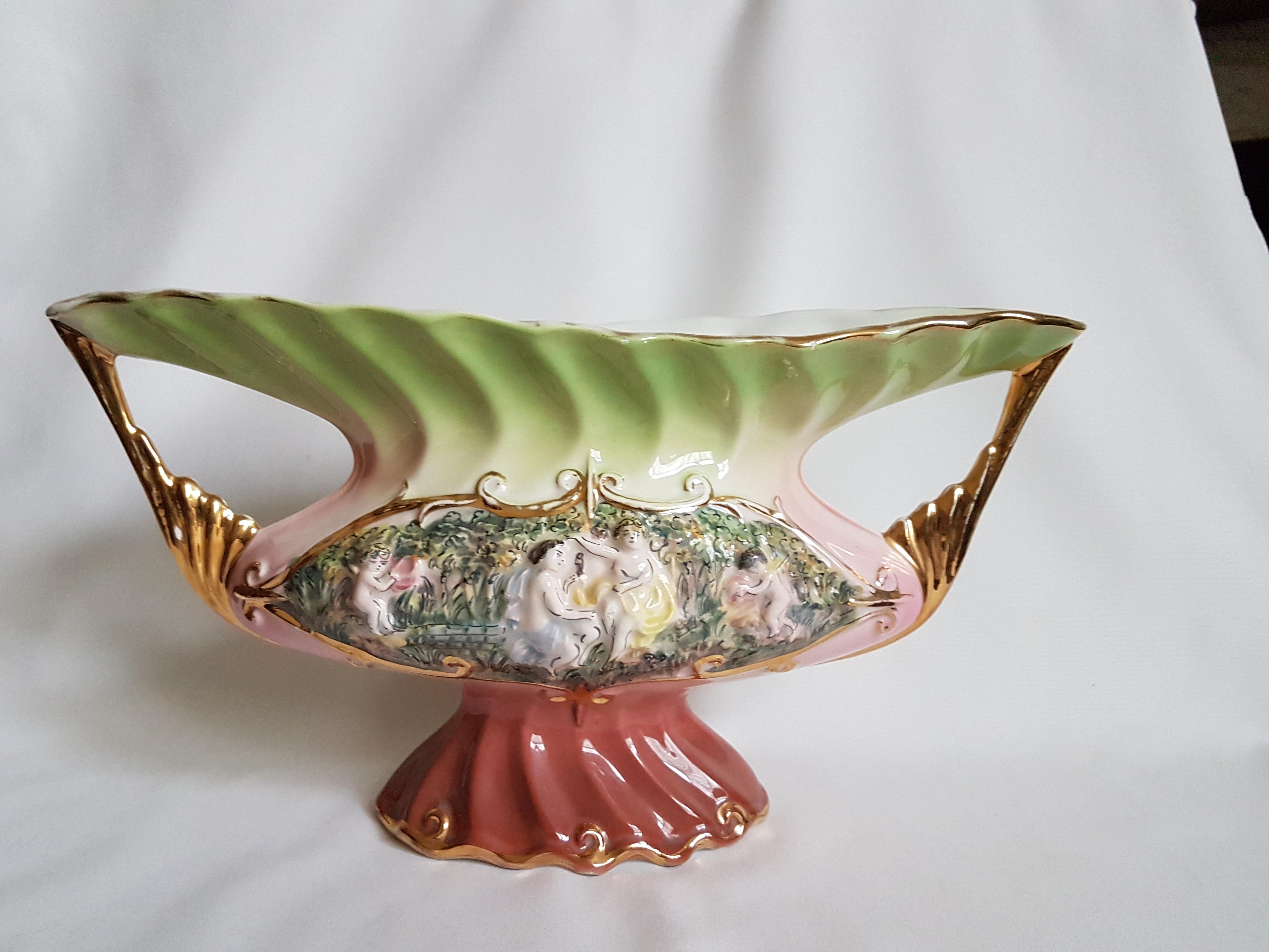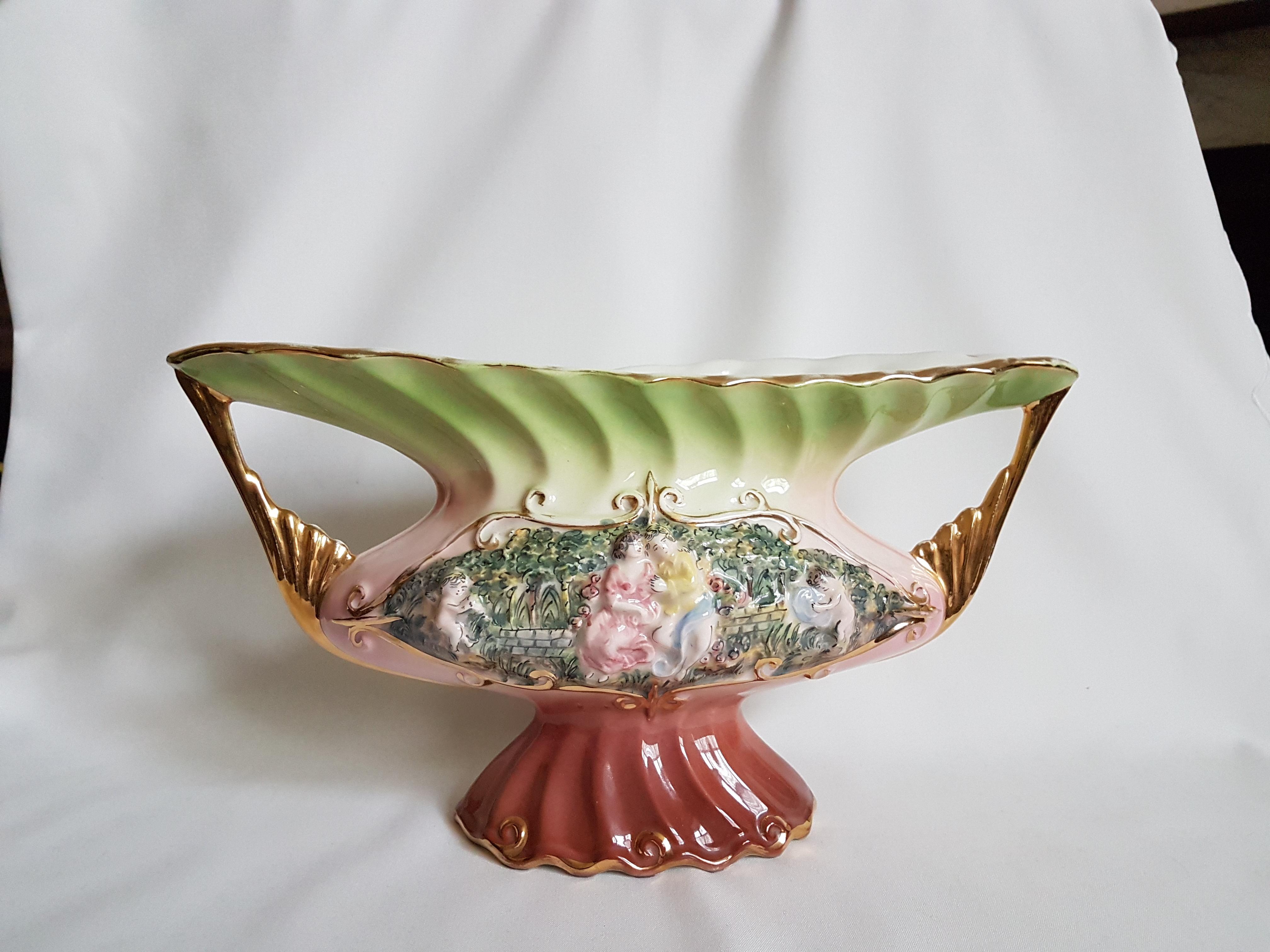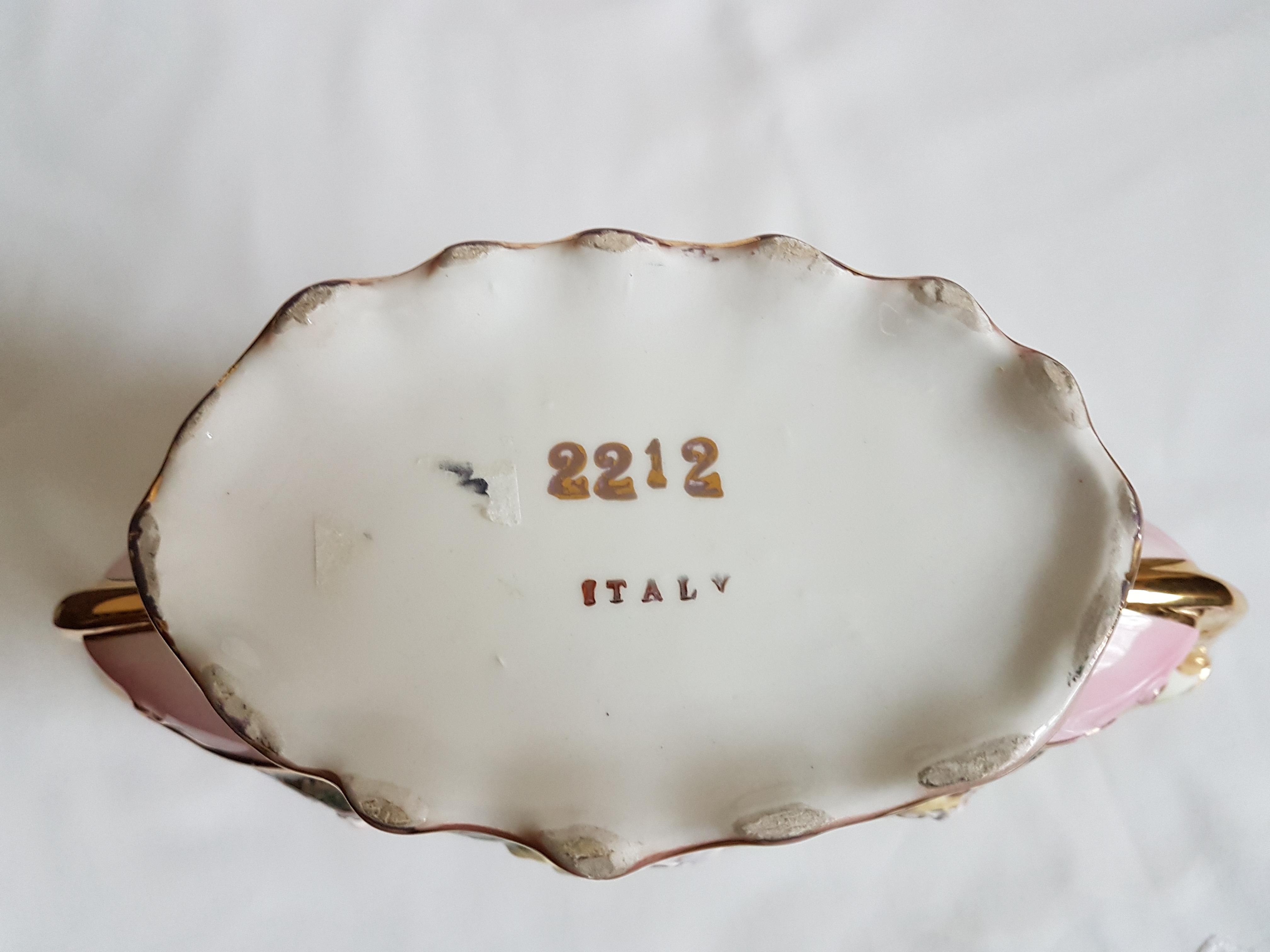 Wide Italian vase with Italy 2212 in gold on base. Capodimonte style with couple and cherubs with gilding. Very good condition. Would like to know date of manufacture, if it is capodimonte and what it may be worth? 13 3/42 or 55 cms wide, depth 3 5/8" or 9 cms and 7" or 18 cms in height. Thank you!