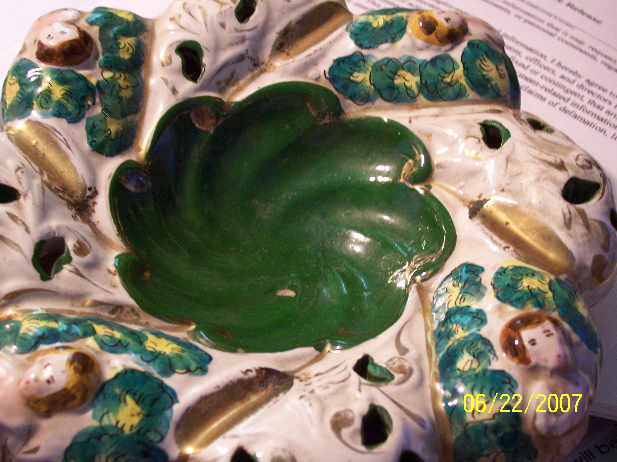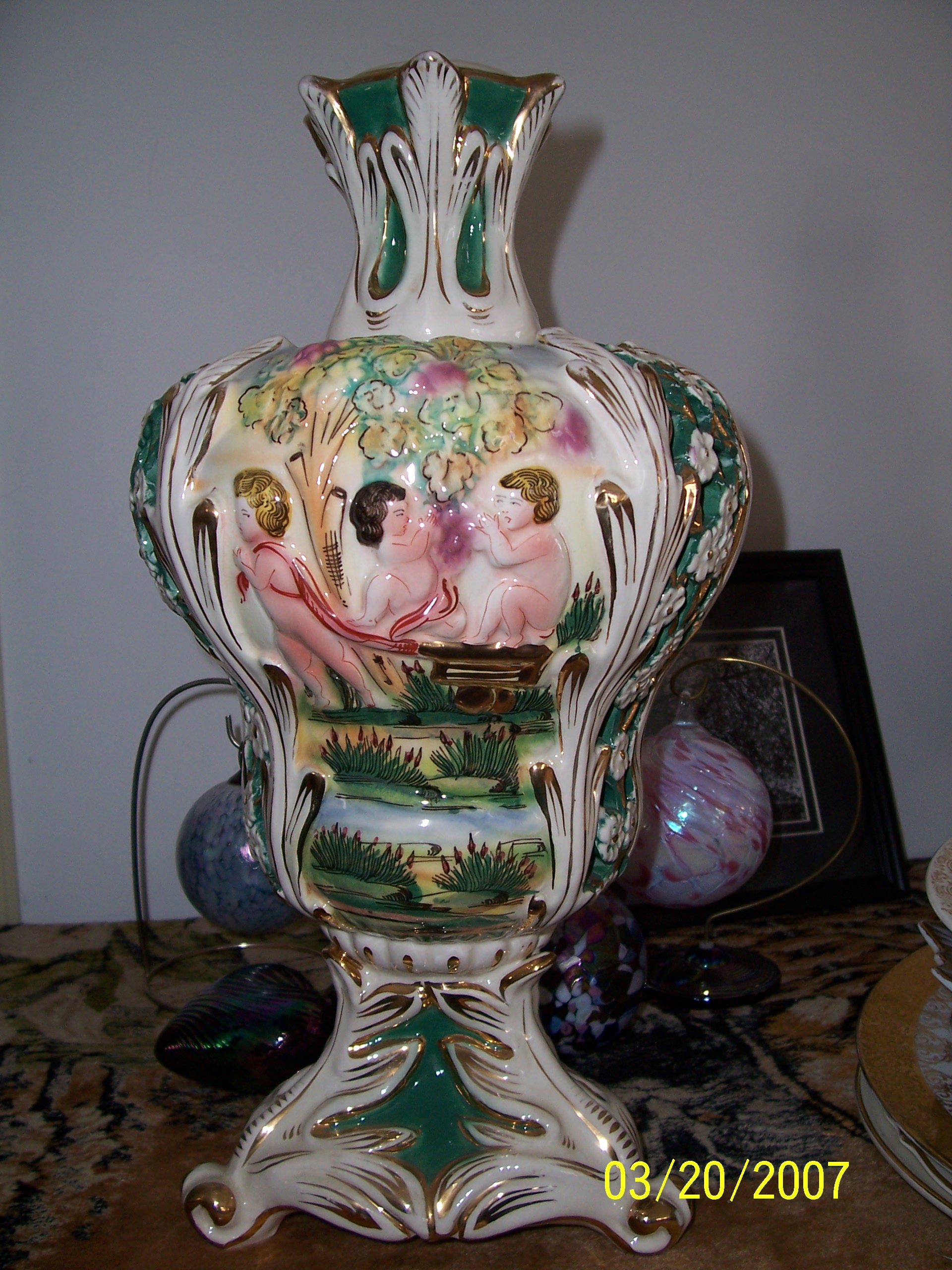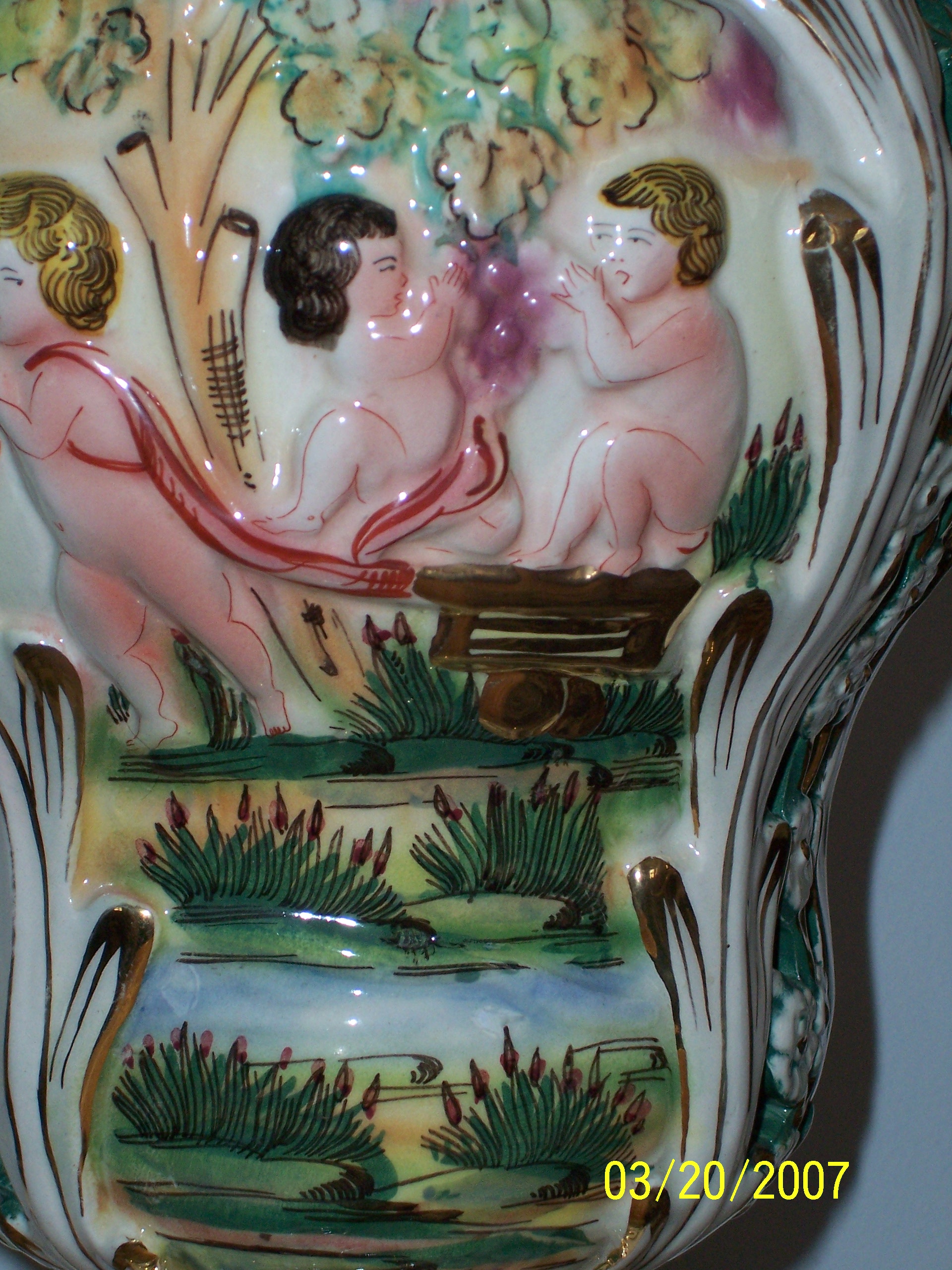 They are in storage now so I am guessing at attributes. They are about 24" plus the lighting part. Pictures attached will give you more detail than I can. There doen't appear to be the usual Cappo trademarks and the ashtray has hand painted on bottom made in Italy and a number. I have seen Capo lamps with this same pattern and shape.