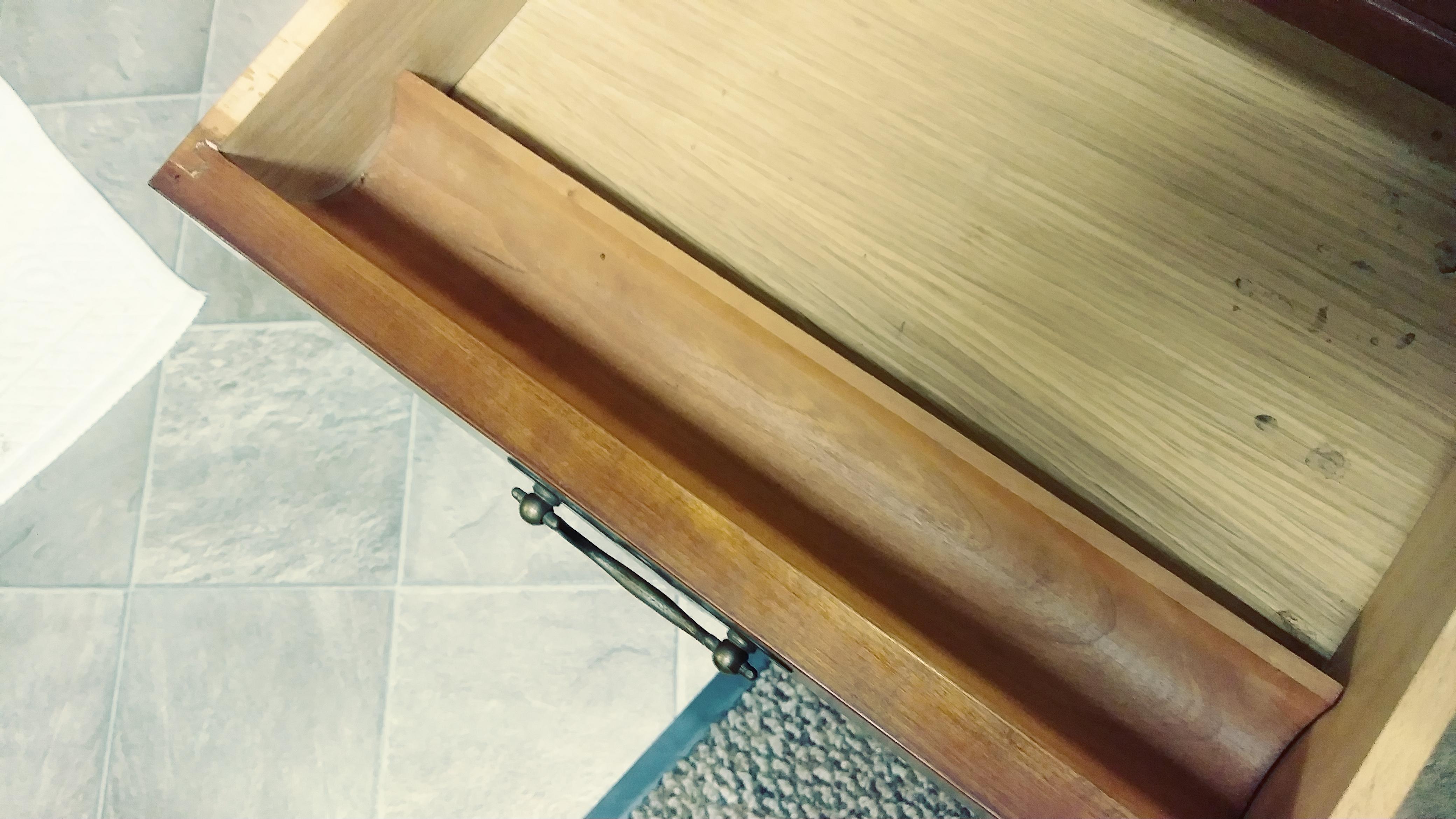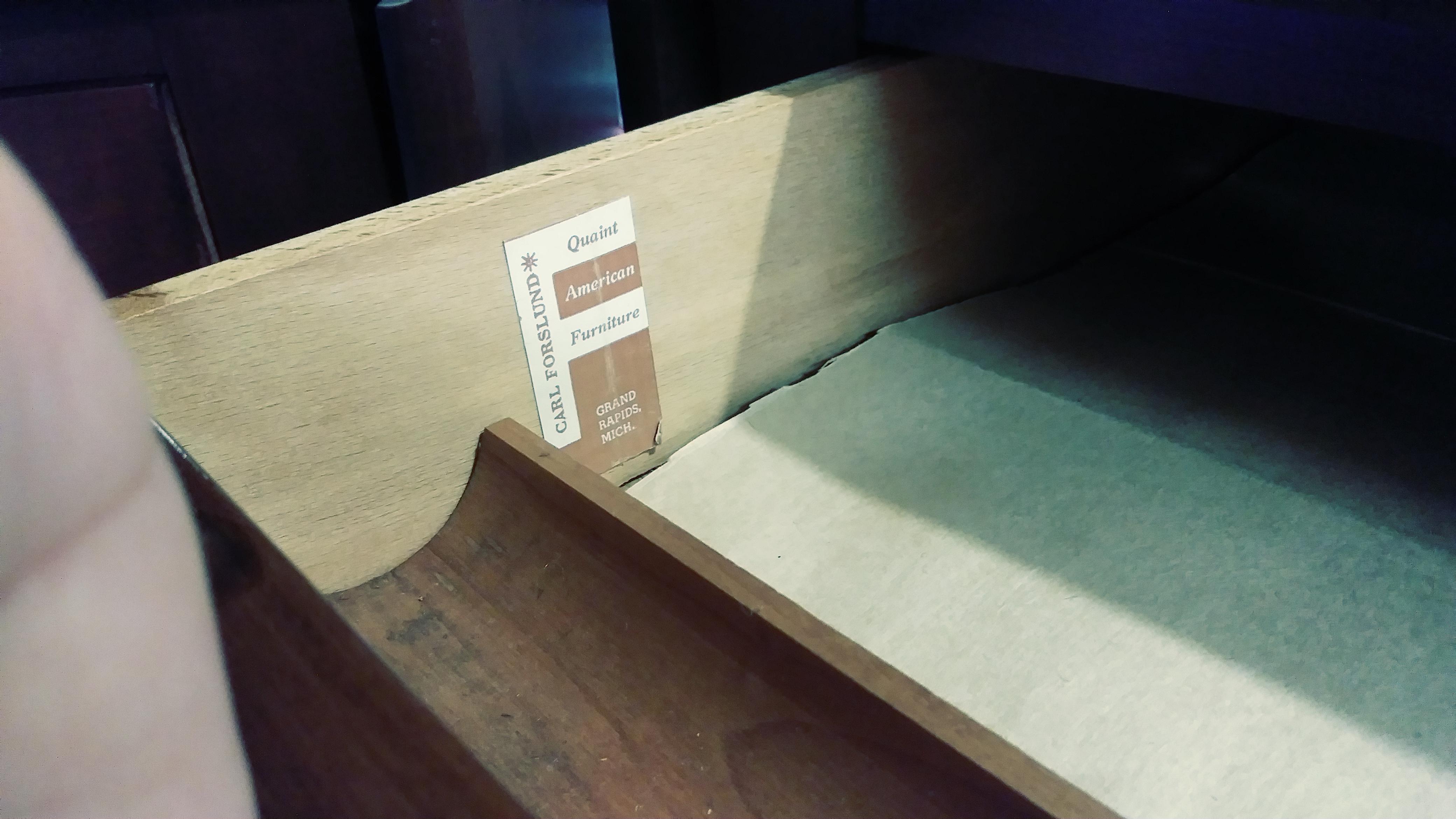 The sticker/tag inside the drawer says "Quaint American Furniture. Carl For sound* Grand Rapids Mich."