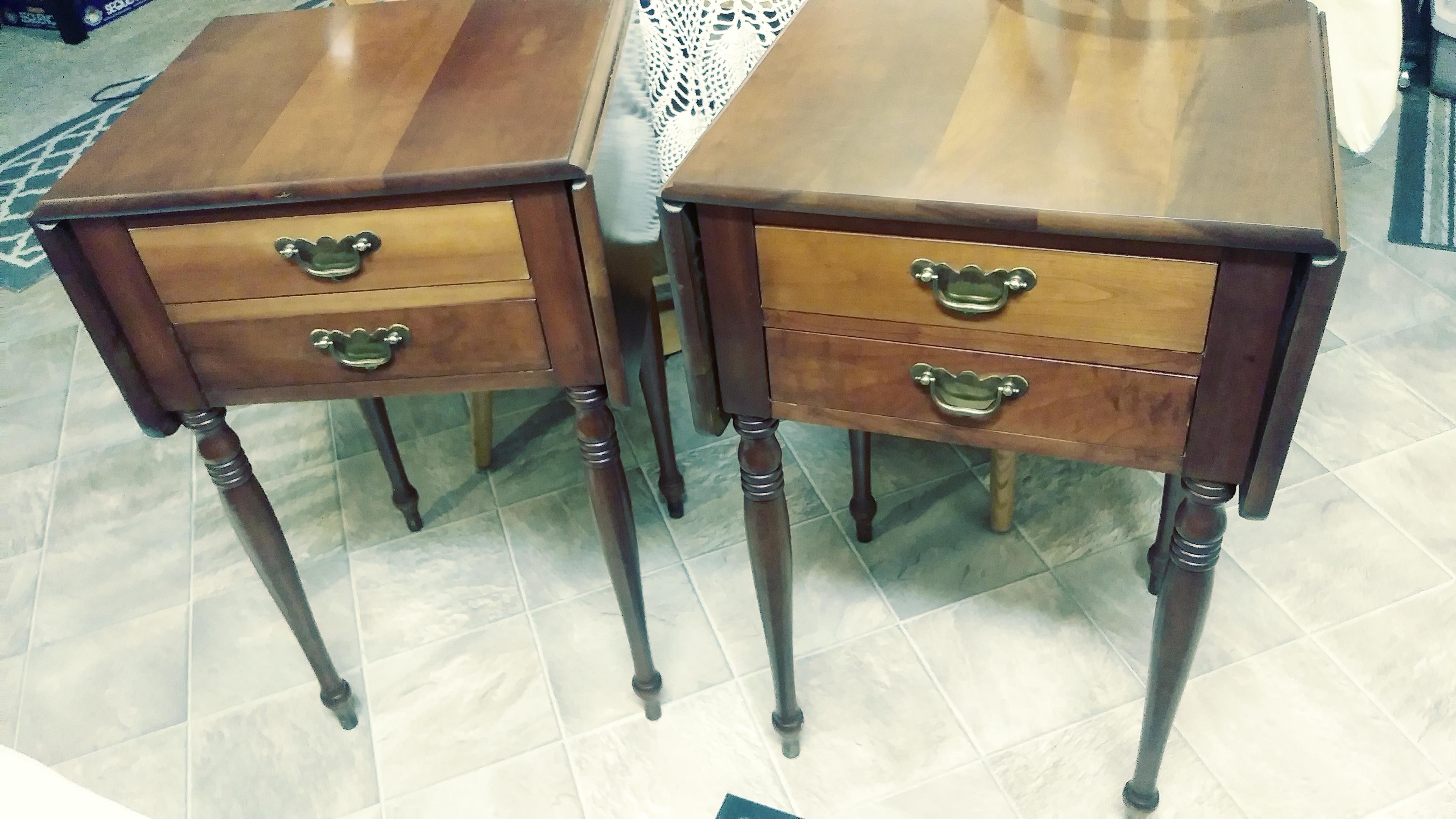 This is a pair of small tables with flip out sides. Each table has two working drawers.. One drawer has what looks like a pen/pencil holder at the front of the drawer.