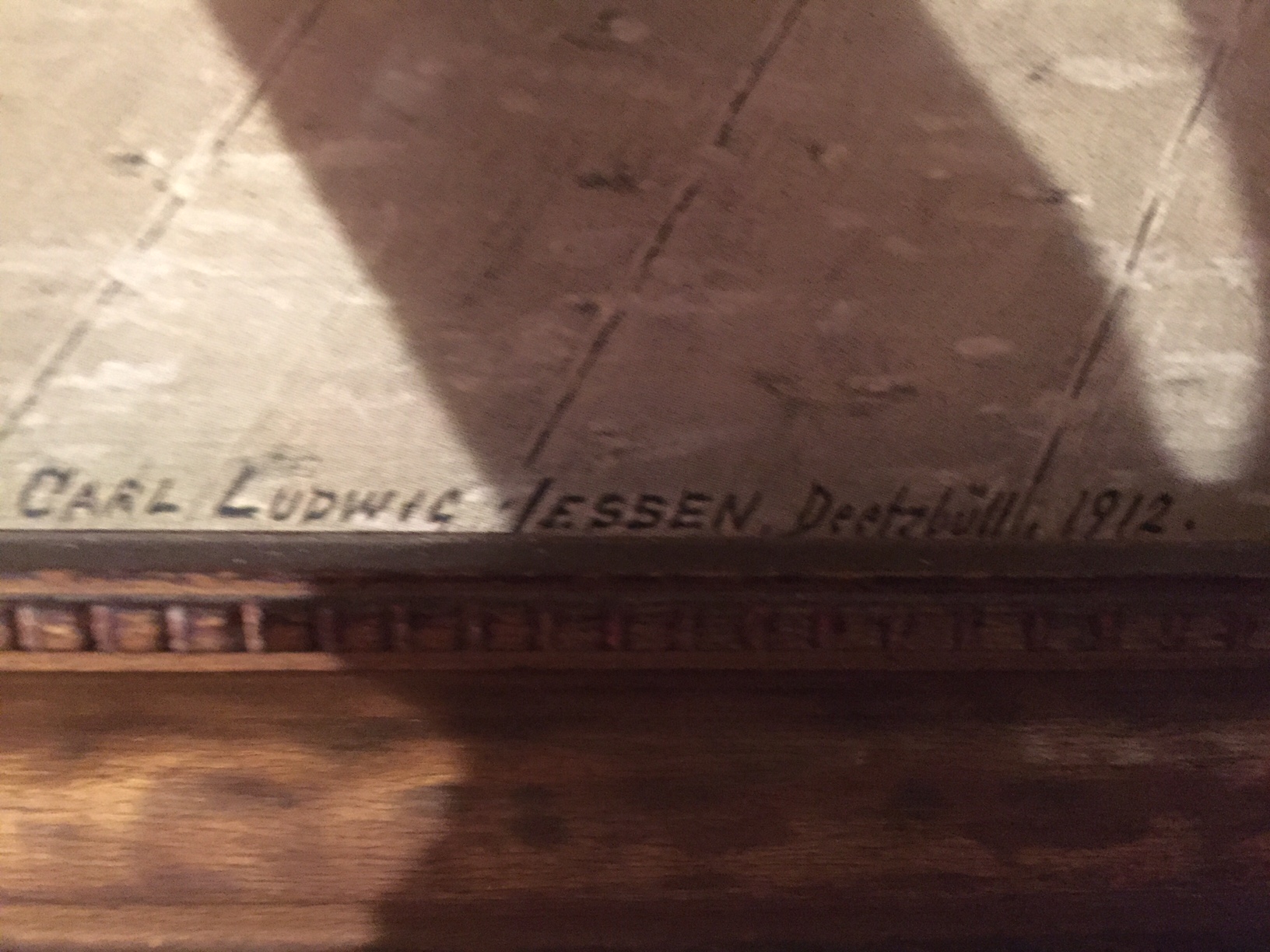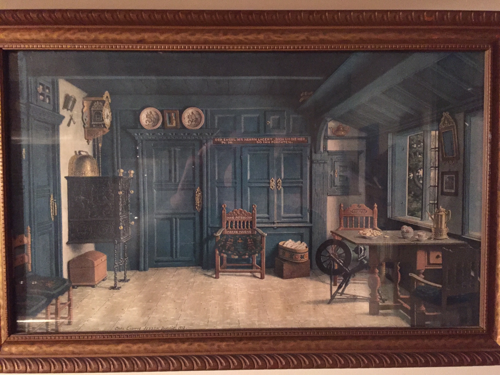 The picture in the golden painted wooden frame shows the typical arrangement of the living room of a house in Friesland Nordfriesland 19th century. The print is entitled "Blue Pesel" (the parlor in a utlandfriesischen house where most precious rooms found the large family gatherings instead) .Here would be the correct name Dörns (or sylterfriesisch Kööv), as here, the Bilegger (Beilegeofen ) is, which was heated from the kitchen. The room was thus used for daily life. The blue paint was widely used in North Friesland in the 19th century.