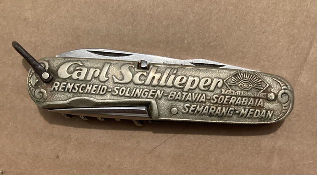This is a nickel silver plated “German Eye” pocket knife by Carl Schlieper with two blades, a can opener, corkscrew, punch, and bottle opener. Handle is engraved with “Carl Schlieper Fabrieks-Merk Remscheid-Solingen-Batavia-Soerabaia-Semarang-Medan” on one side and image of a workman and traditional tools on the other. The larger blade has “C. Schlieper” and Indonesian or Thai script (from its Dutch East India/Siamese history) engraved at its base. I know the company began in the late 1700s and existed until the 1930s but I don’t know the date or estimated value of this item. Can anyone provide further info?