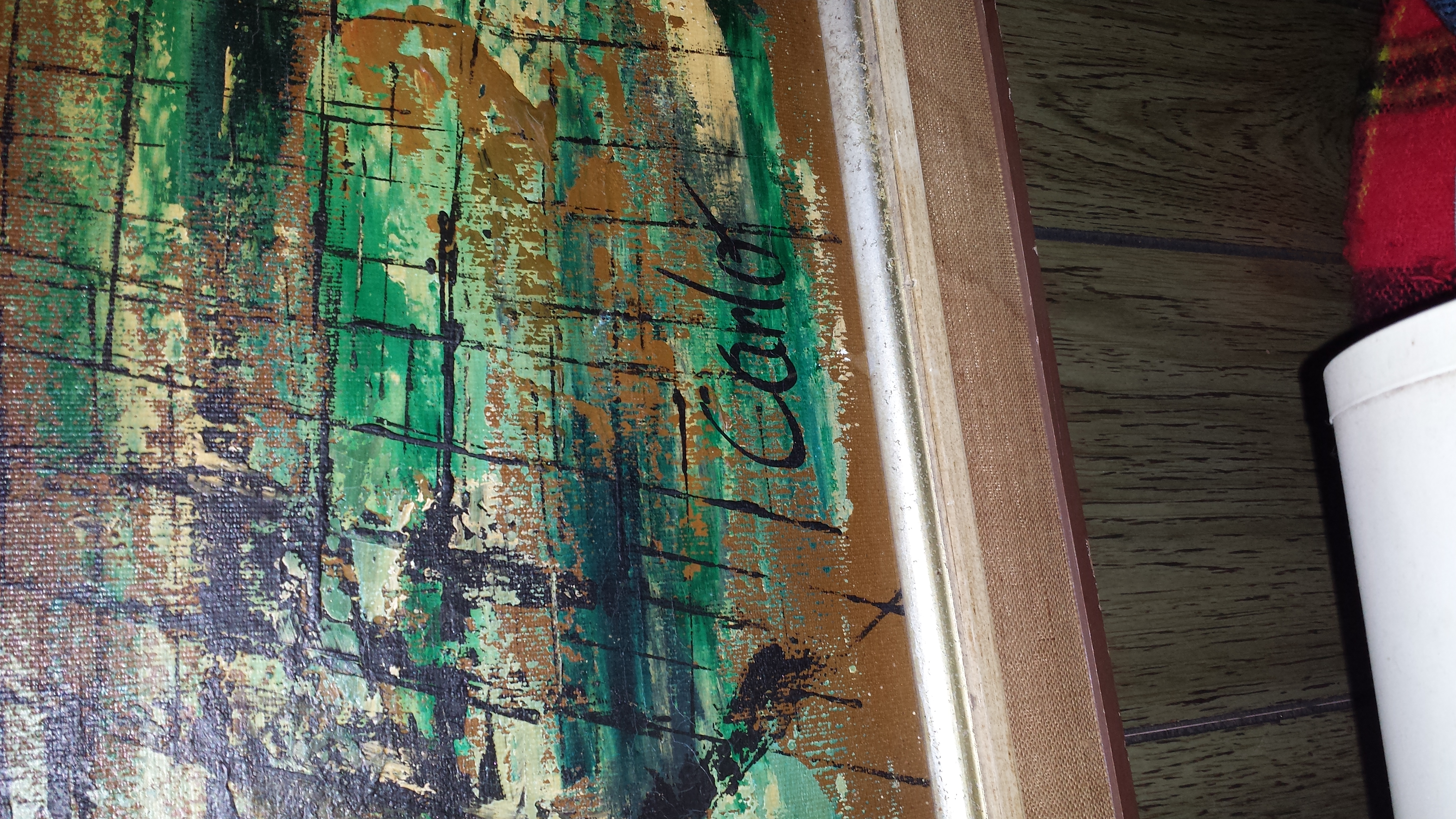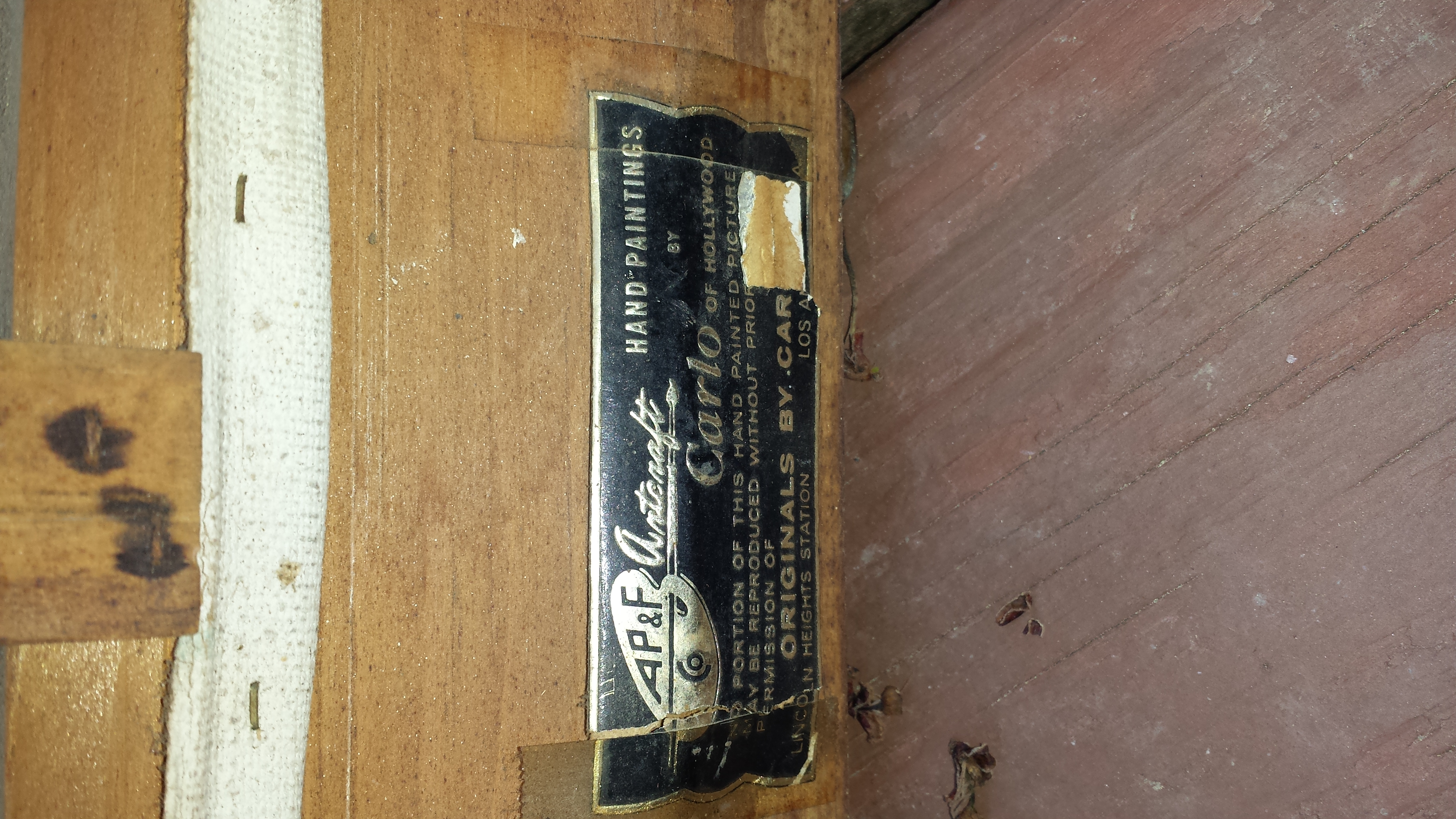 It is I believe a painting by Carlo of Hollywood. Some writing on the back says Los Angeles show 1951. Measurements are 2.5 ft by 6.5 ft. Has been hanging in my parents house for over 23 years was here when they bought the house. Just curious as to value? If anyone may know?