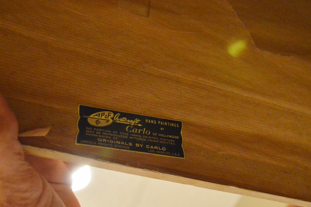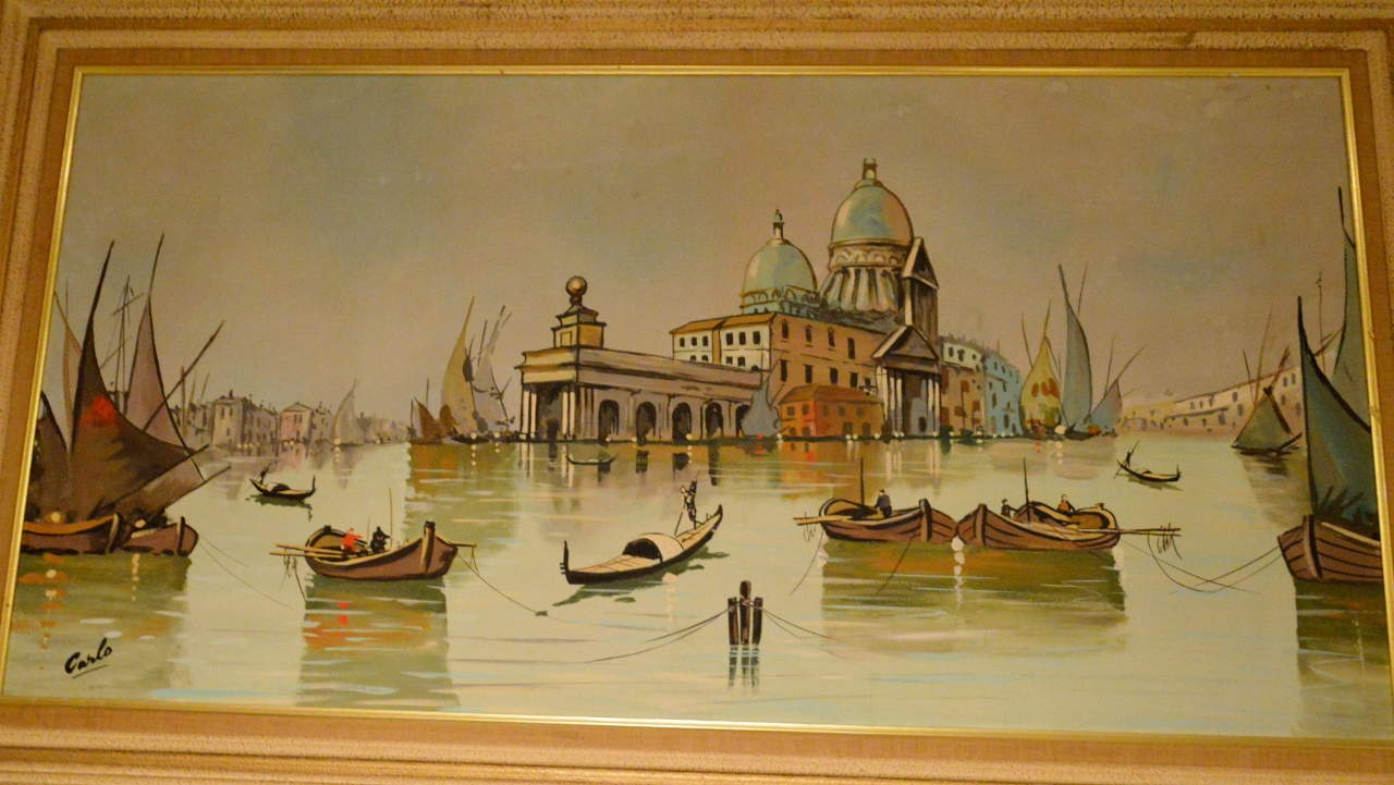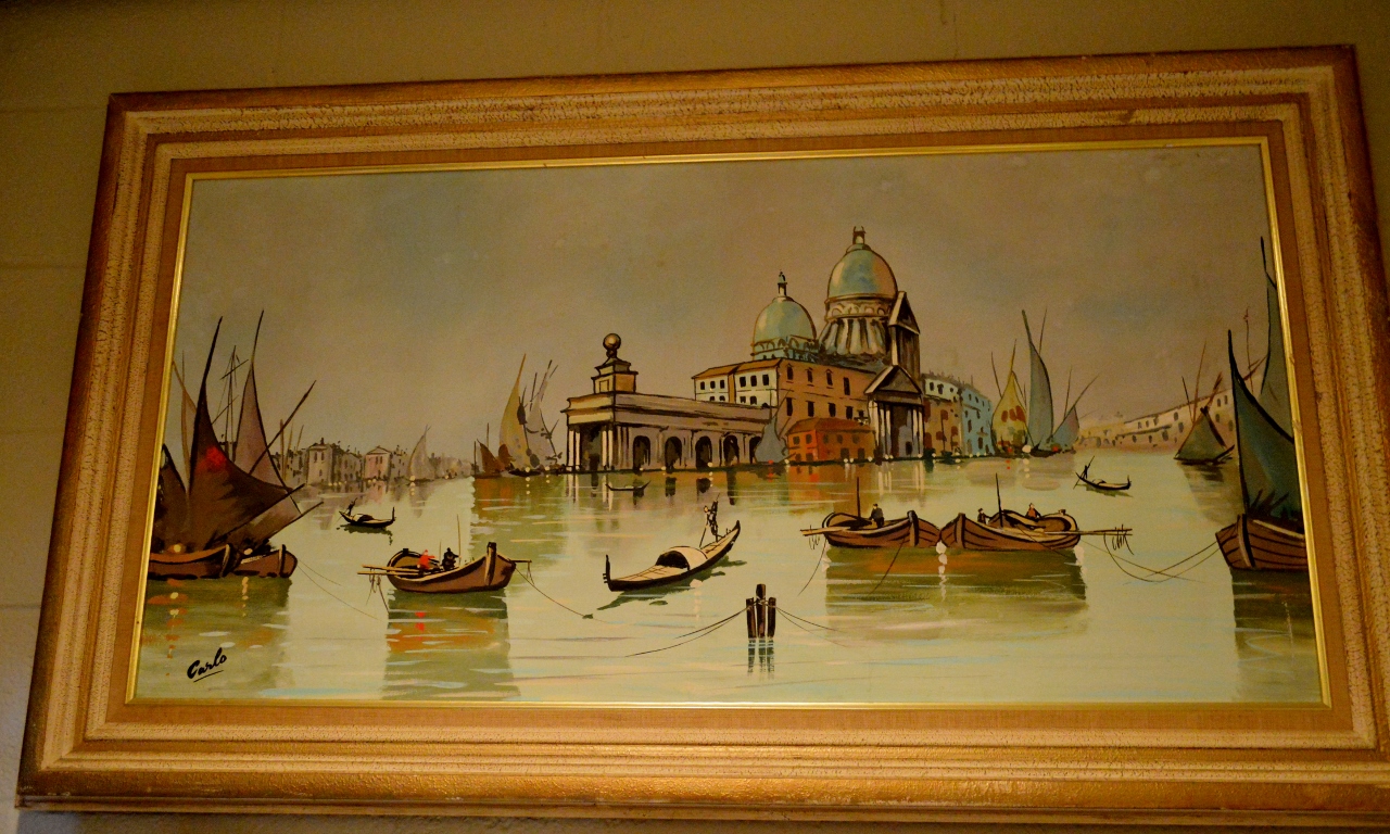 Large framed Carlo of Hollywood painting of Venice water scene. has original sticker on back.