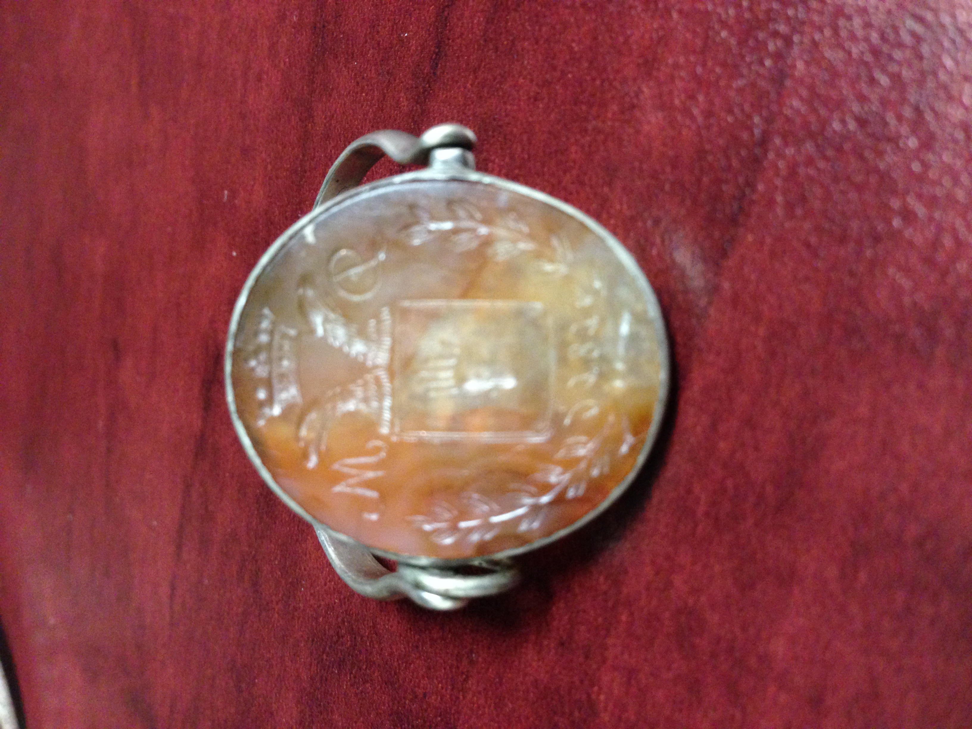 Carnelian stone etched on both sides. Letters/numbers inverted. It has the initials M and D on both sides. One side says (in French) "Two hearts entwined forever" with two hearts joined together with etched chain and the date 1816 (all inverted). The other side has initials M and D with the palm of a hand and what looks like two dragon heads with a crown above the two heads. It also has the inverted year of 1816. Sterling silver and it will turn.