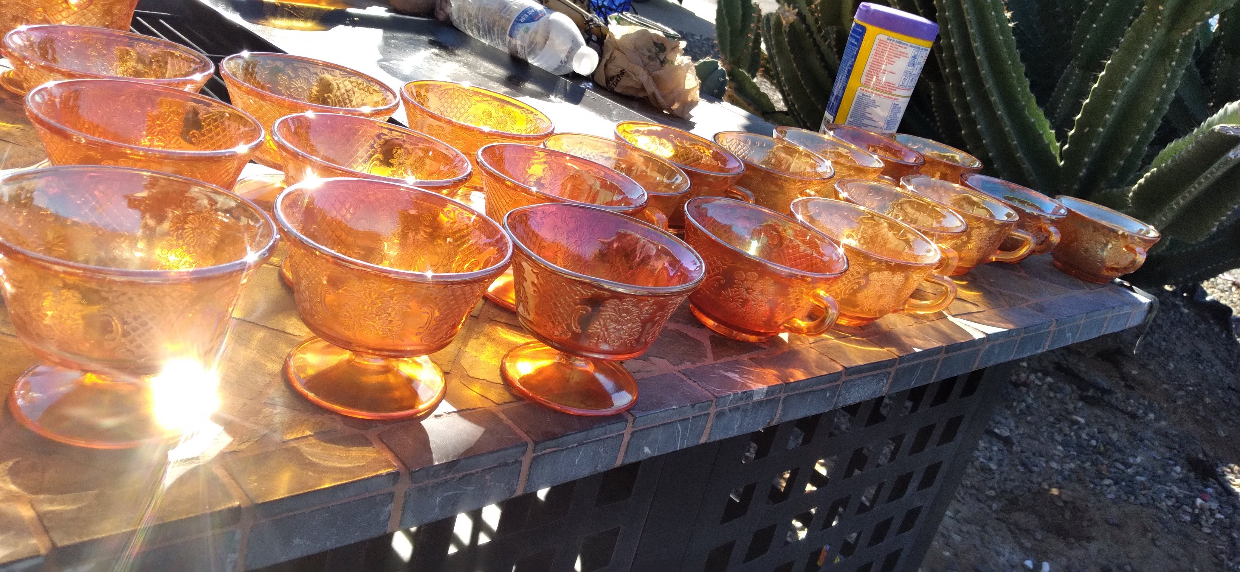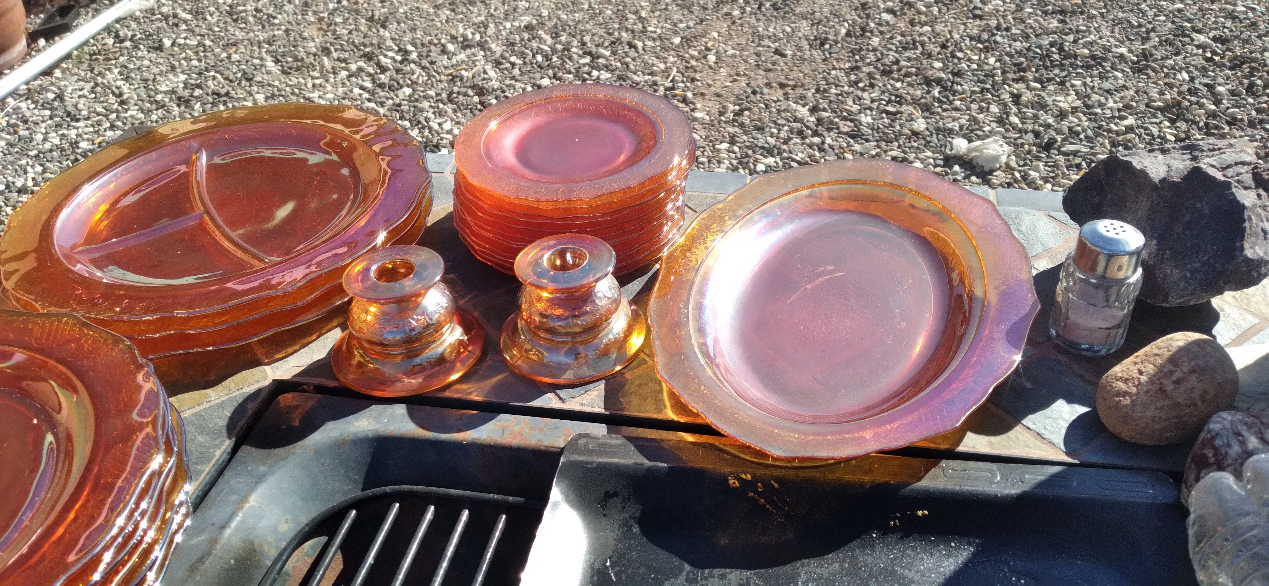 I believe it is marigold carnival glass. It has iridescent color. Trying to see how much it'd worth.
