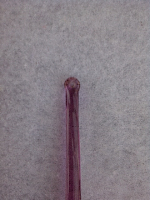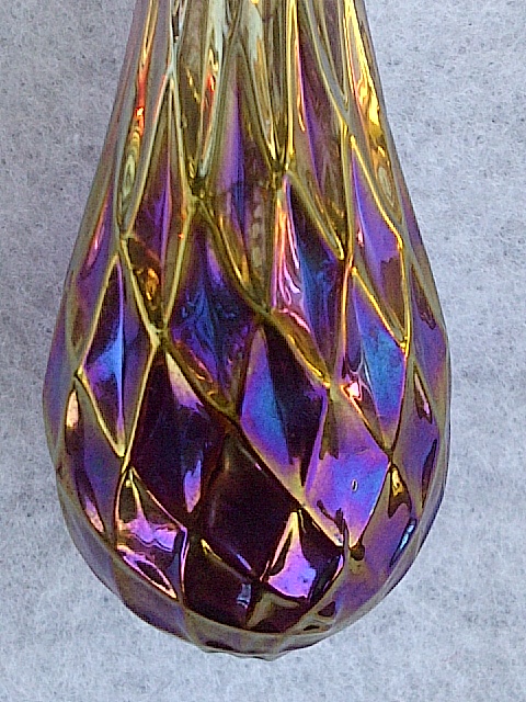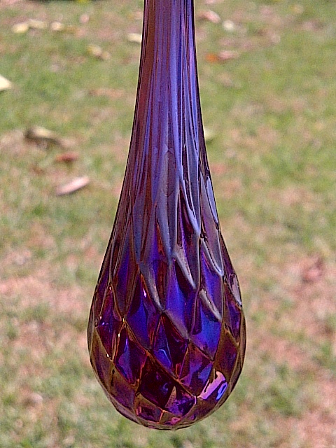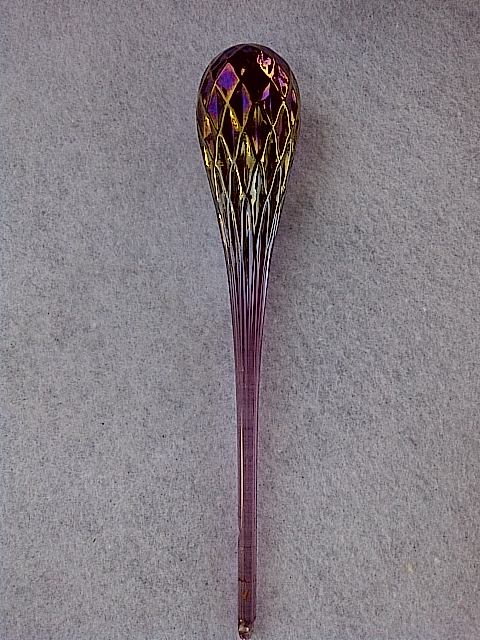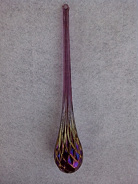 I found these lovely hand blown chandelier drops on the floor of a charity shop under an open bag of baby diapers. I was on the floor looking for buried treasure and found it. These prisms are about 6 inches long, I found 7 not broken in a bag of 8 where the eye is broken. I cannot find any information on these and have a feeling they must be rare The gold and purple color is stunning. Anyone?