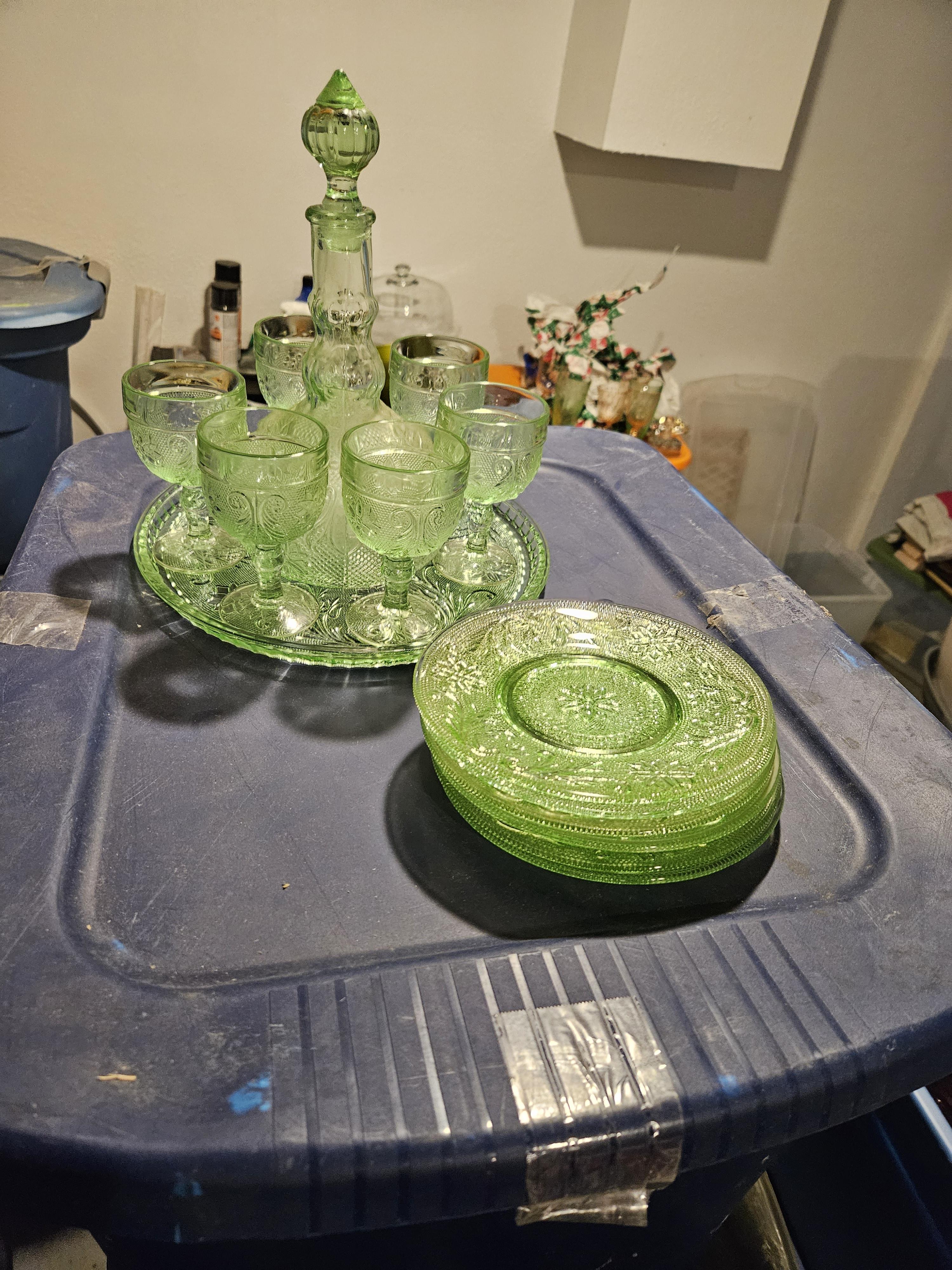 Old sherry decanter with plate and goblets. Appears to be green carnival glass.