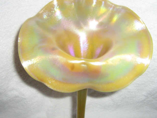 I am very curious about this piece. The base is 4 inches across, slimming down to 1/2 stem, barely able to fit one flower stem, then opens up with the fluted edges 7 inches across. The fluted edge in the top being turned down. The stem has a slight curve to it. The glass appears smooth, yet there is a tulip shaped pattern from base to underside of edges - can't seem to get that to show up in a photo.. No matter how hard I try I cannot find a makers mark anywhere on it.