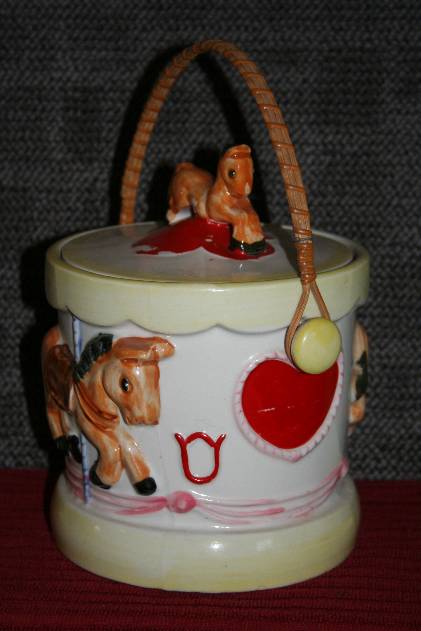 It has a horse on each side, the lid has a horse for a handle. It has a wicker bail for a handle, it's original to the piece.