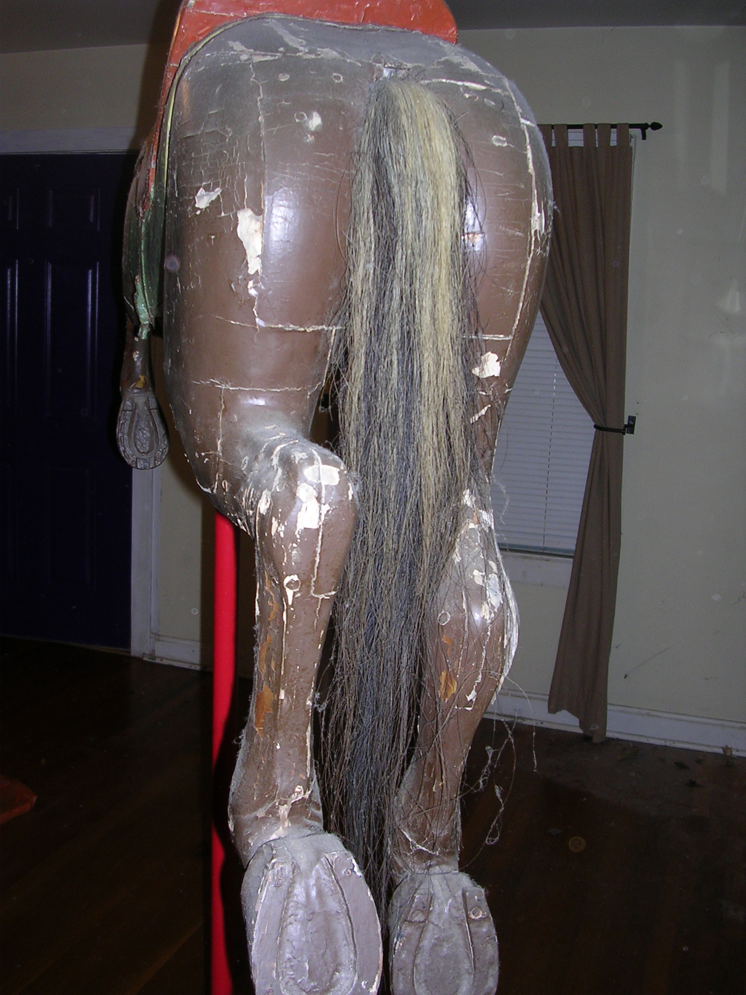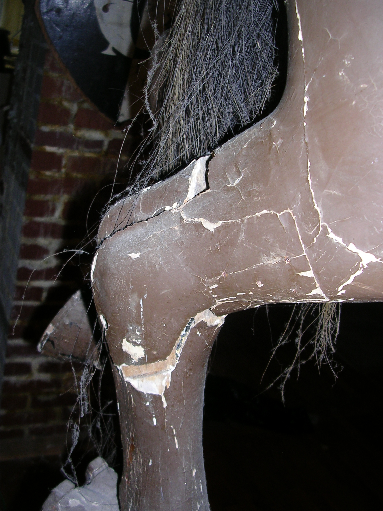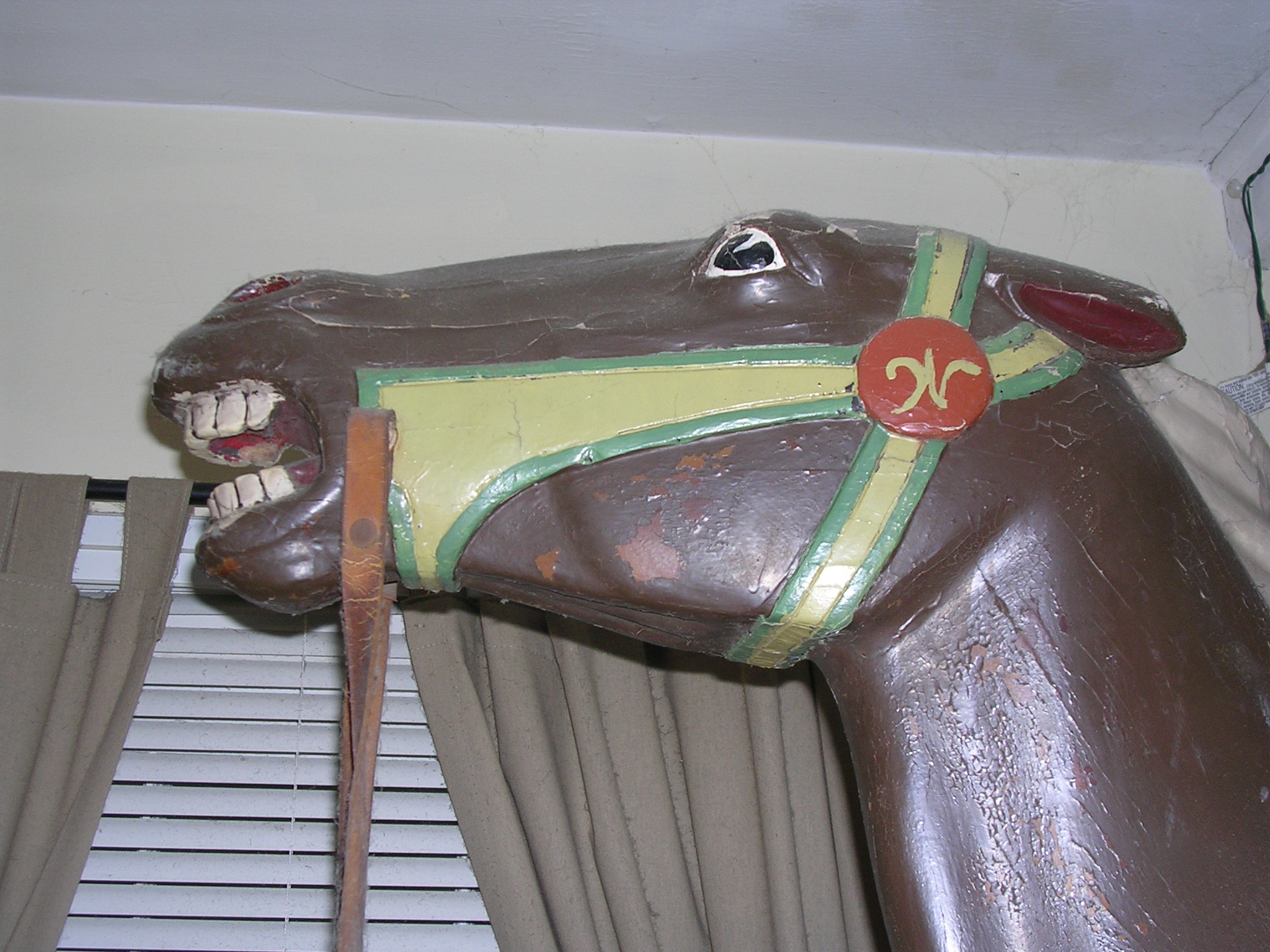 The wooden horses seldom postdate the 1930's, examples like this one could date anywhere from 1900-1930. Damaged examples often sell at auction in the $400-600.00 range