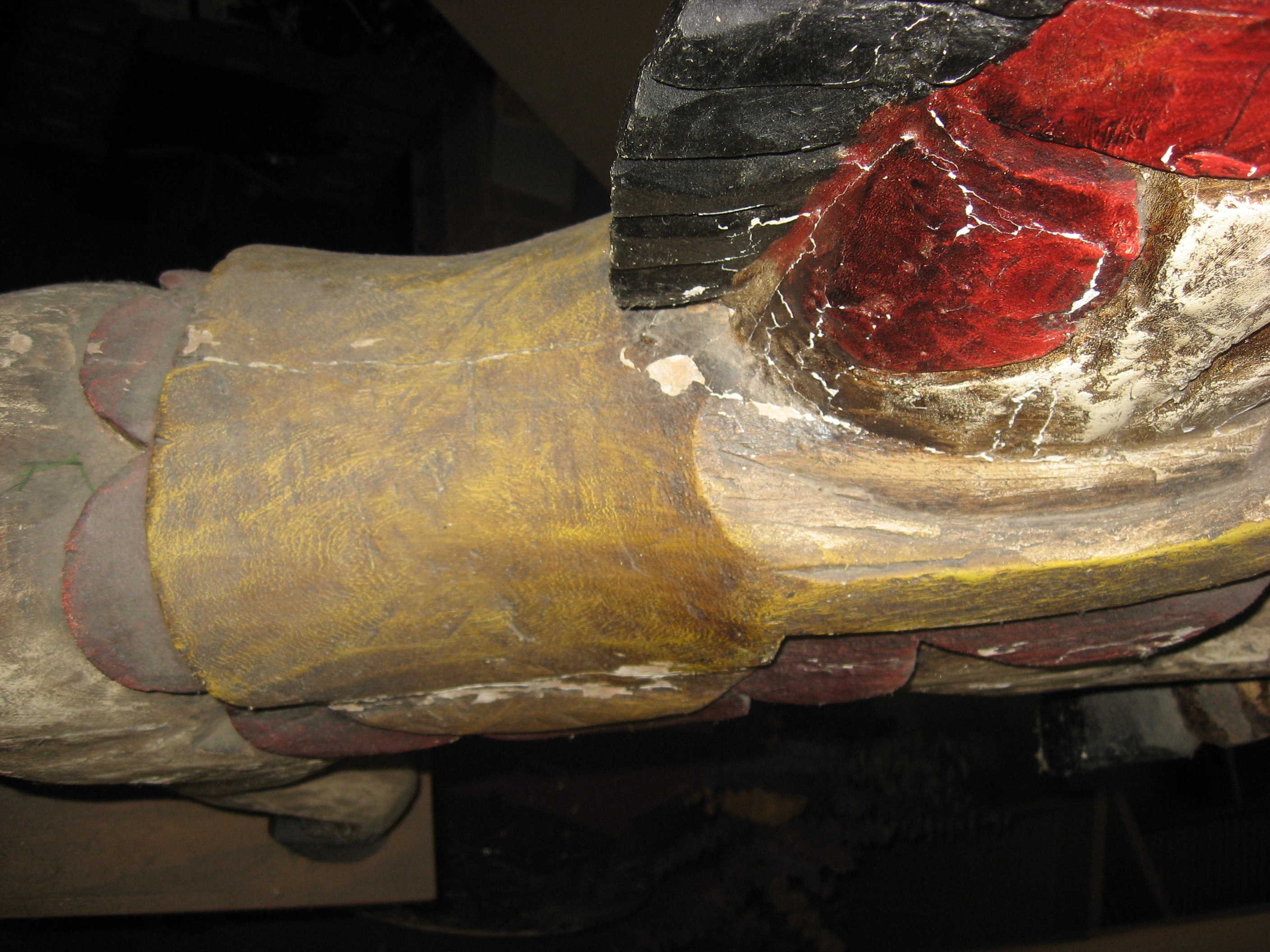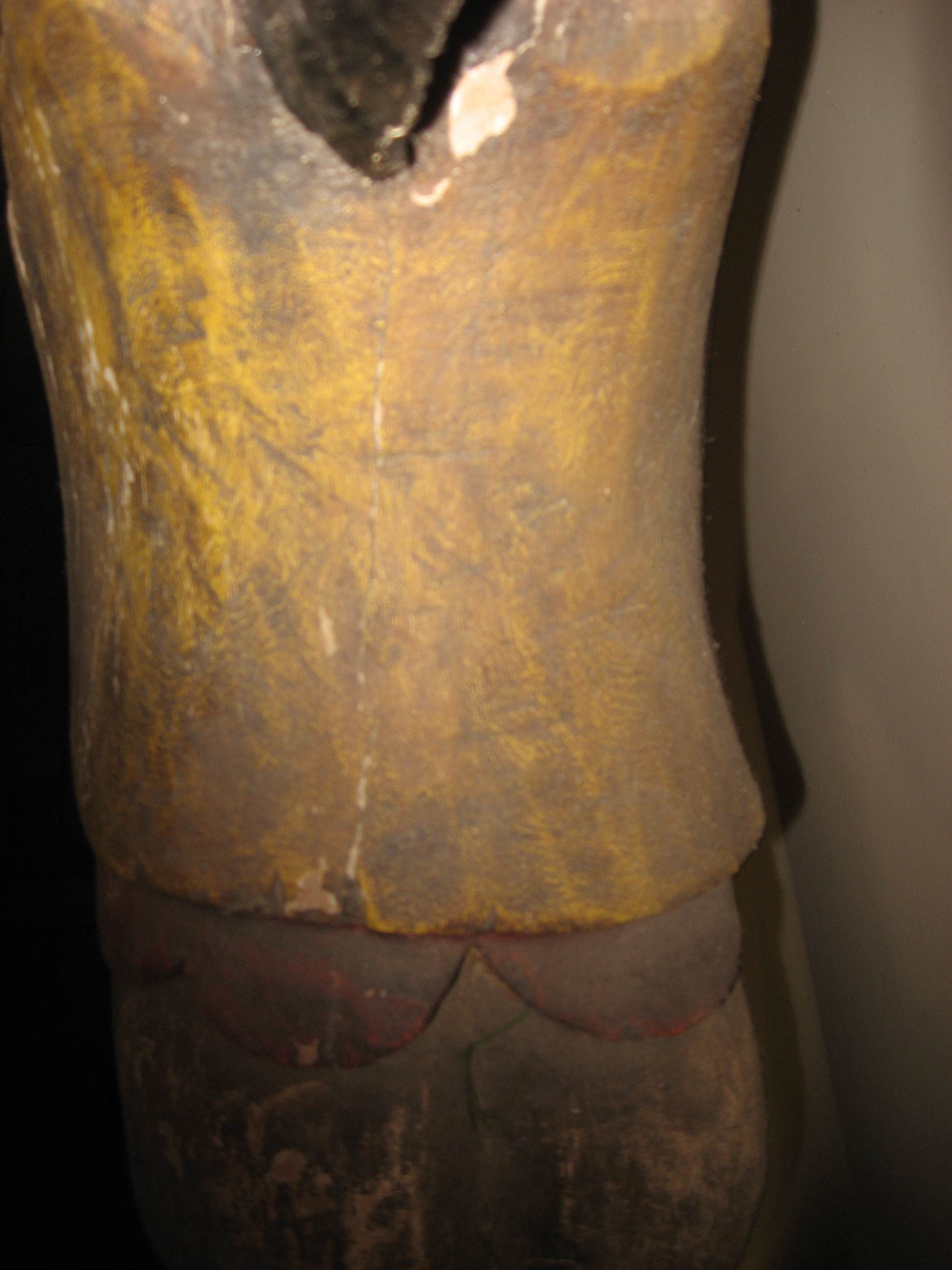 Made of wood and has not been restored. Believe, I was once told that it crafted in Italy but not sure. It has been displayed in my home for at least 40yrs.