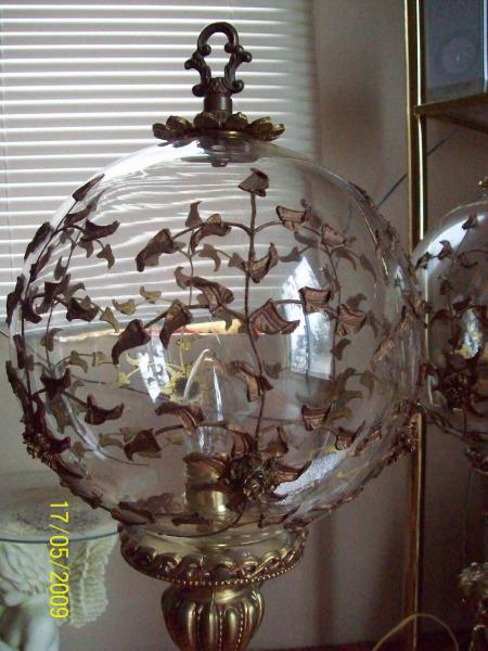 These lamps are beautiful, and cast an interesting light pattern because of the brass leaf pattern attached to the glass shades.