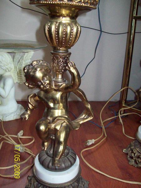brass angels holding up glass shade with brass ivy attached to the glass/ marble base
