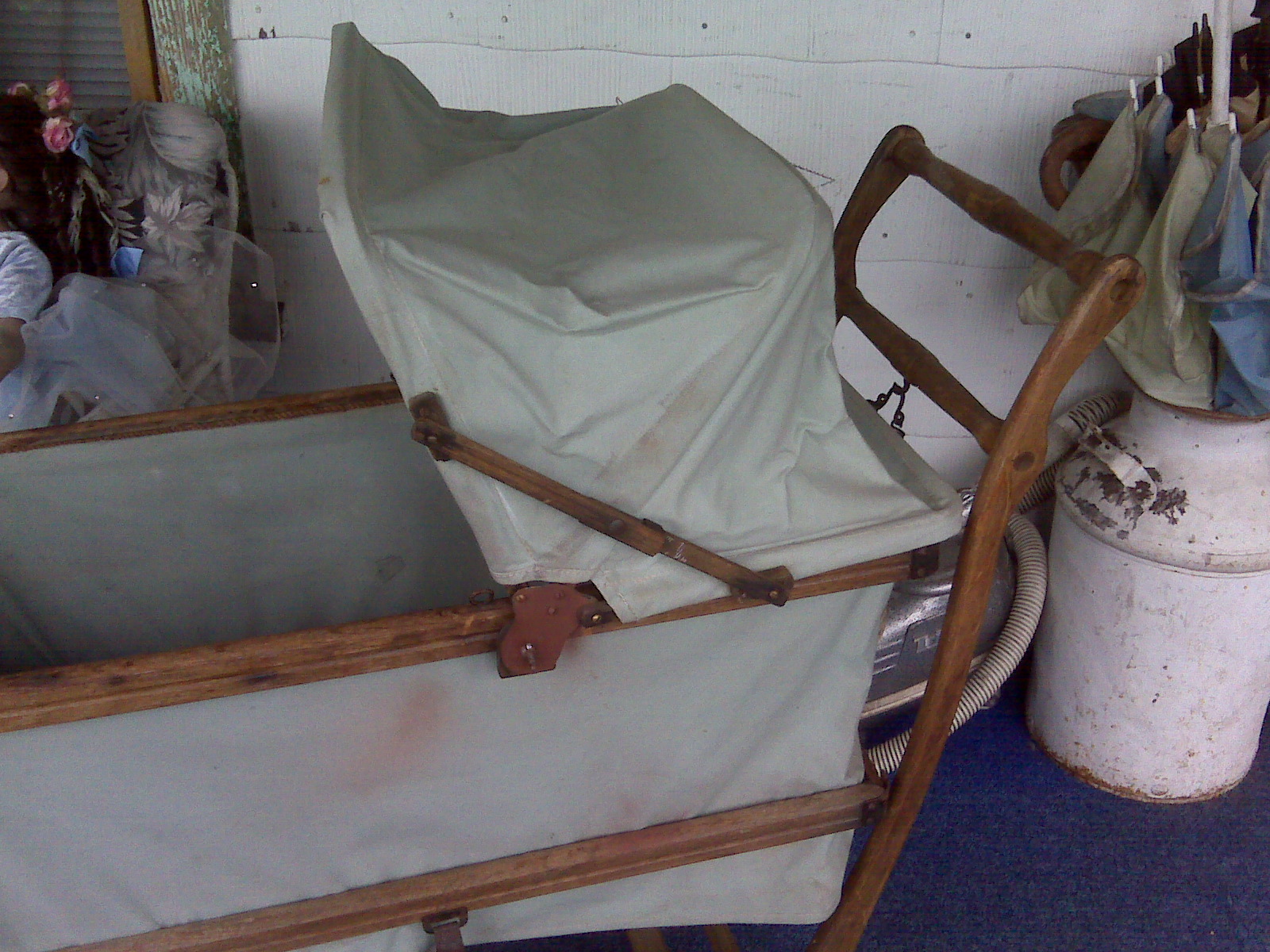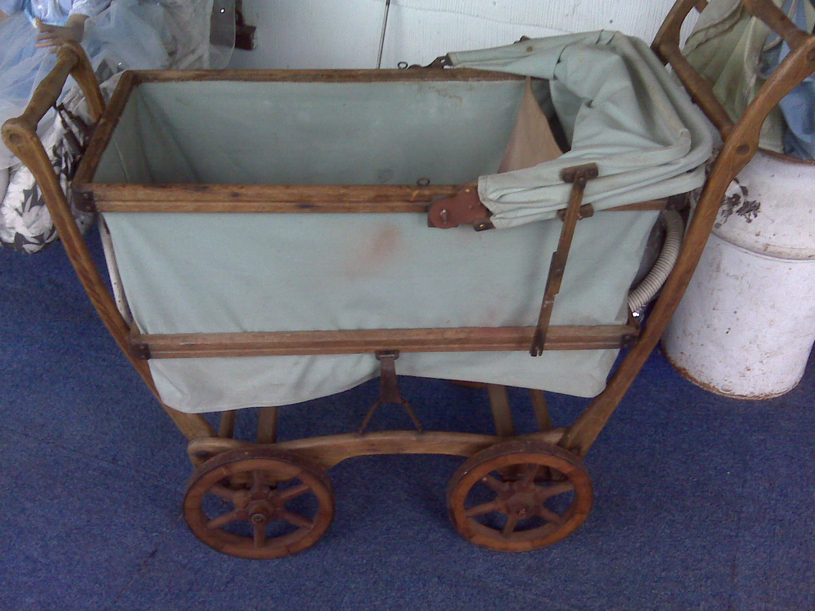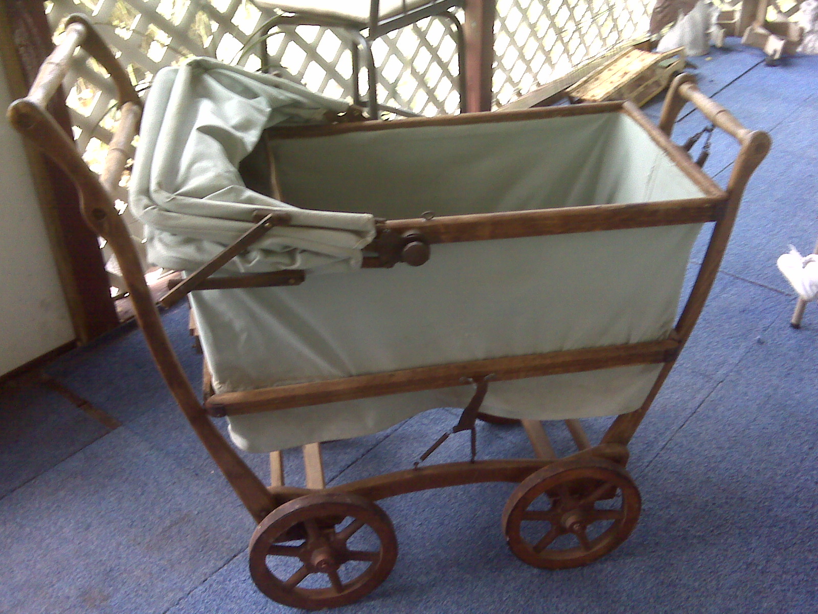 this is a carriage that has a secret hiding spot , for I am guessing maybe bottles of some sort. Very beautiful carriage, has the wooden peg wheels ,with the strap on looks like iron or steele of so me sort ,that is very strong looking, the carriage body detaches from the wheels itself to make or become an instant bed like cradle for the child. If interested please call 239-243-5166