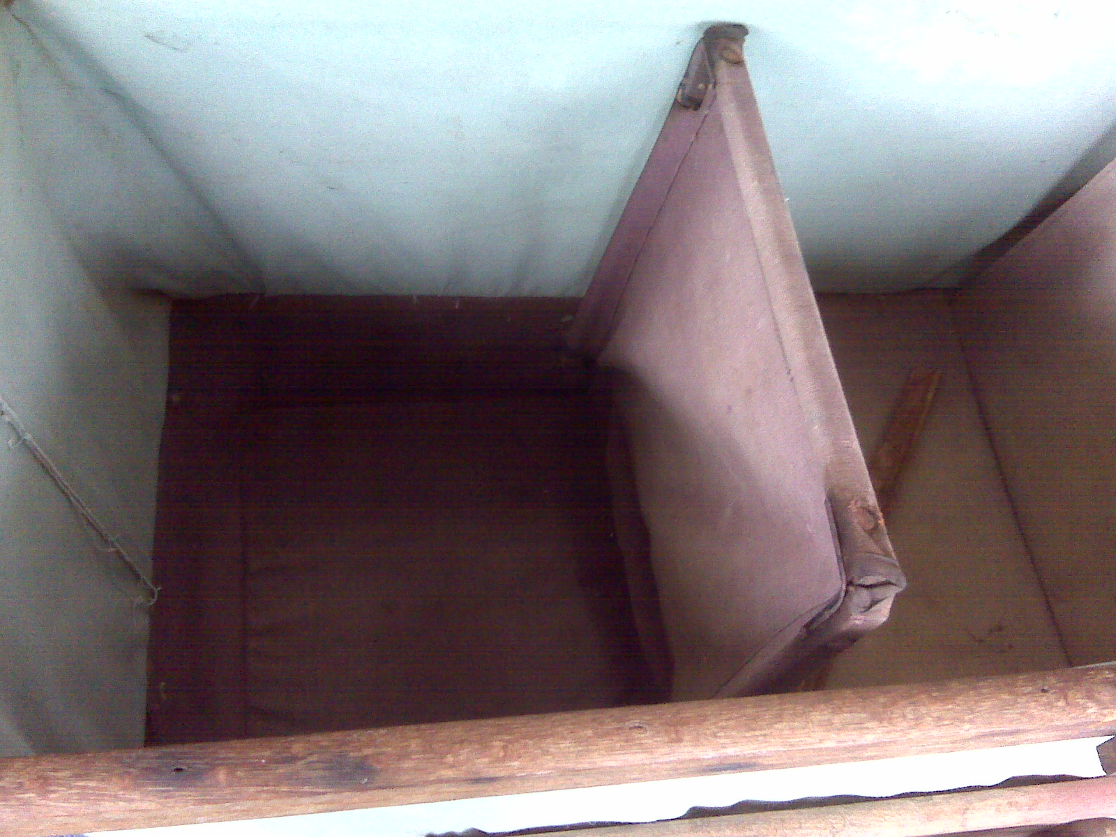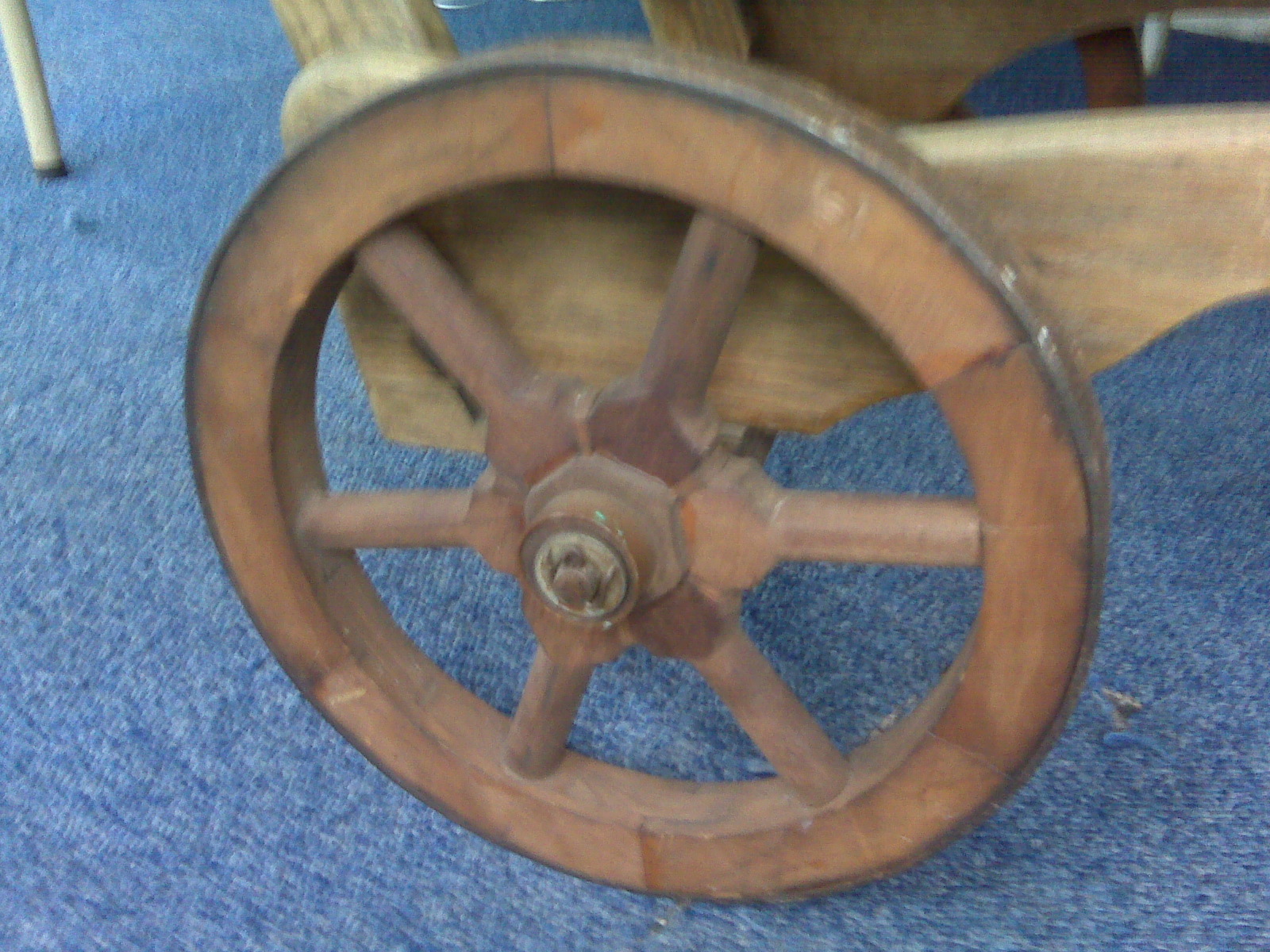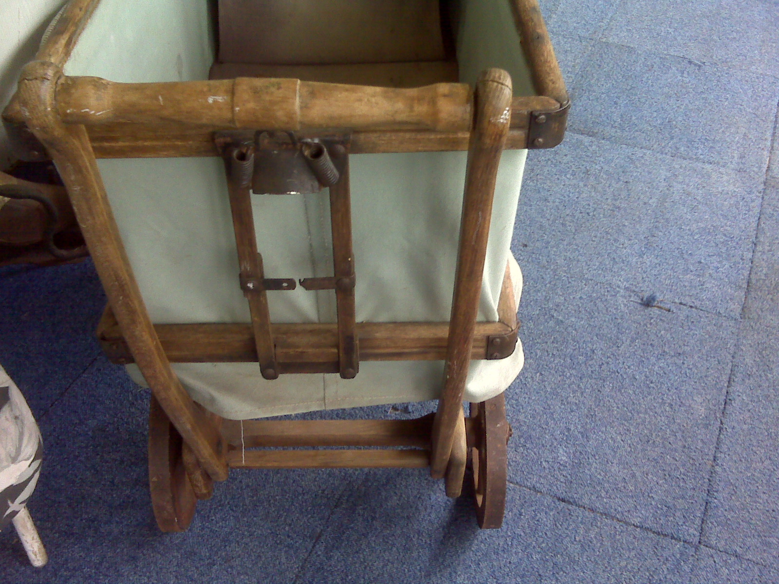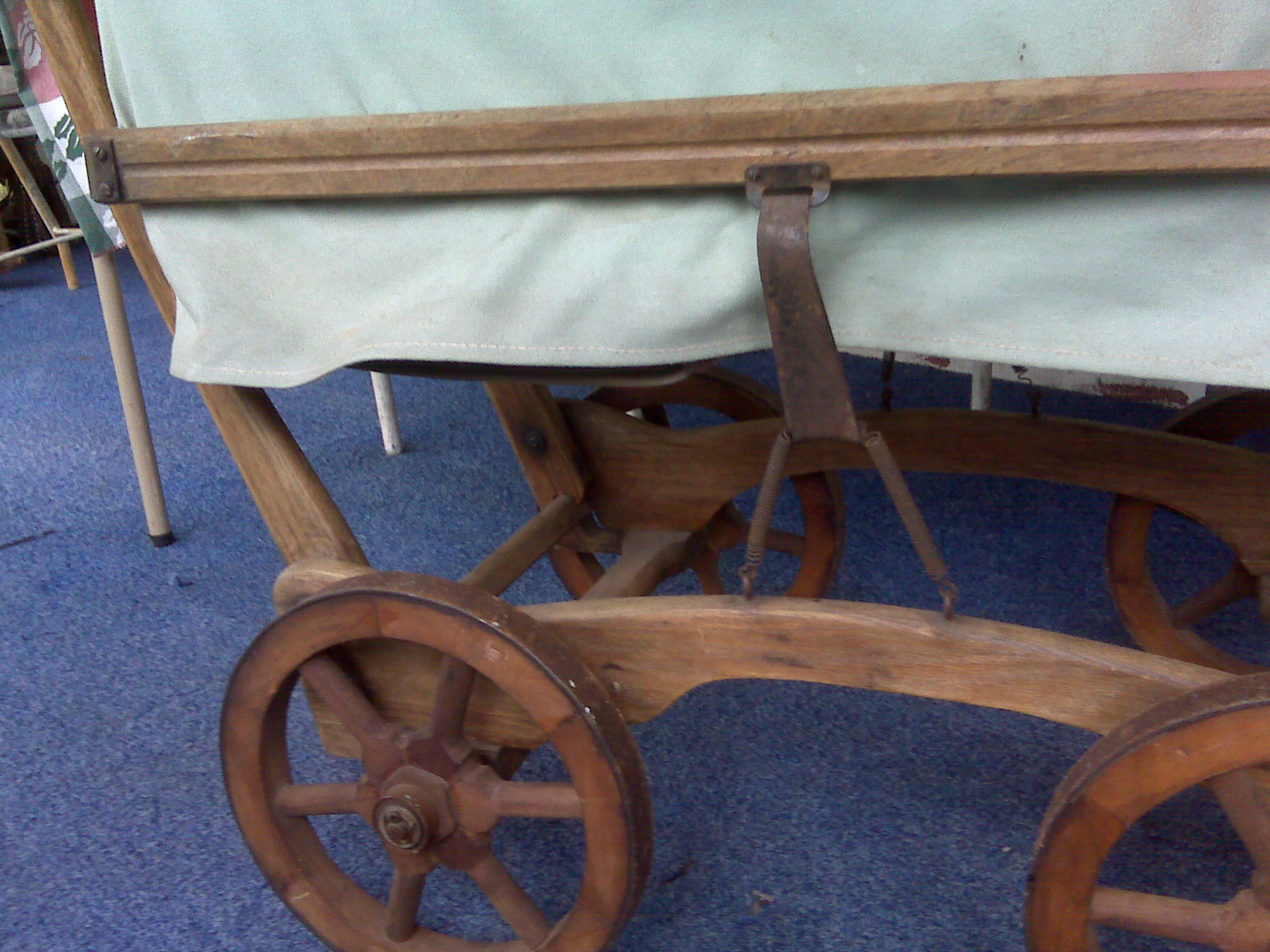 this is a carriage that has a secret hiding spot , for I am guessing maybe bottles of some sort. Very beautiful carriage, has the wooden peg wheels ,with the strap on looks like iron or steele of so me sort ,that is very strong looking, the carriage body detaches from the wheels itself to make or become an instant bed like cradle for the child. If interested please call 239-243-5166
