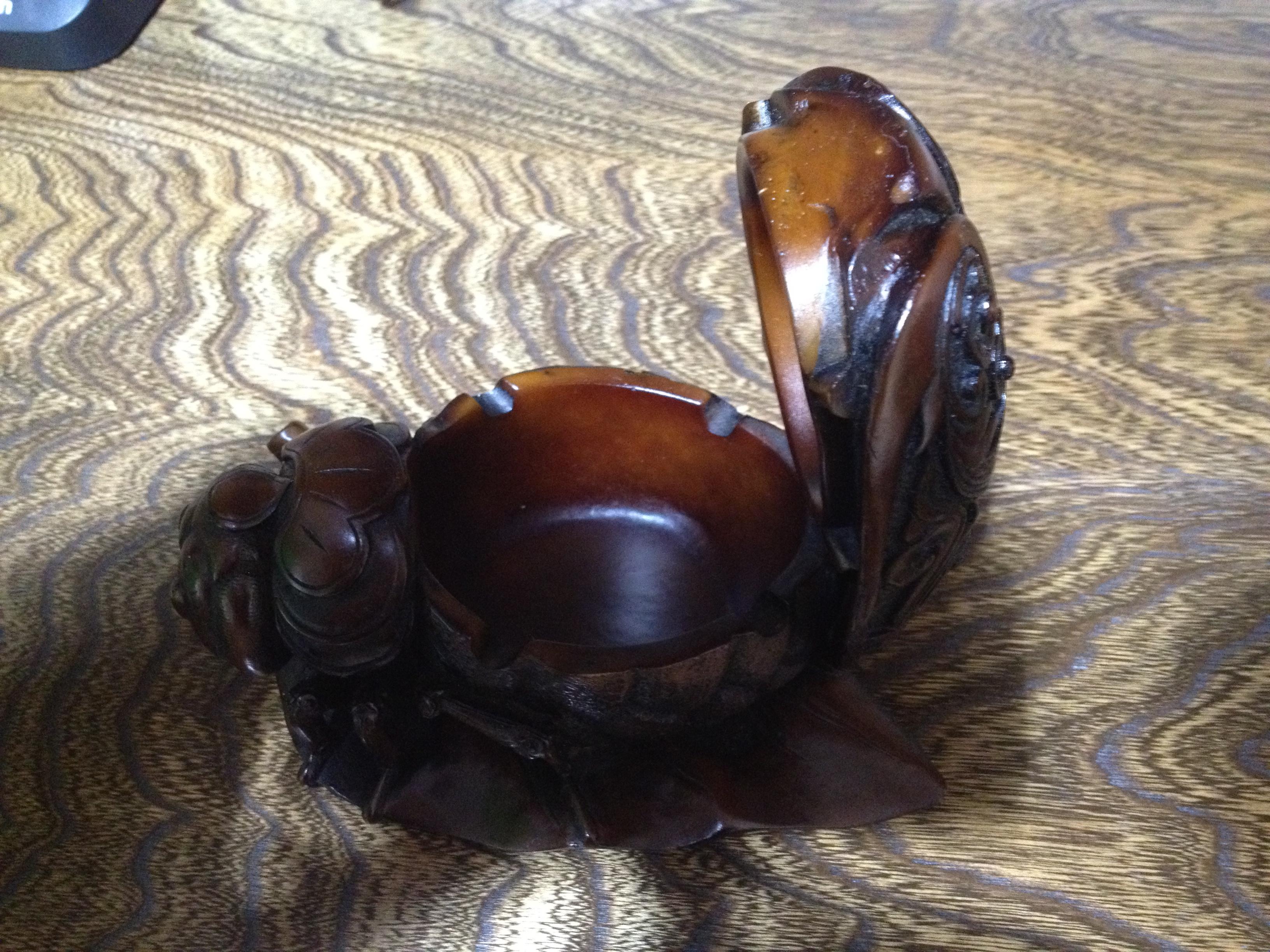 Carved hinged beetle ashtray or box. Not sure if it is carved from bone, seed pod, or wood. Item is heavy and carved very nicely.