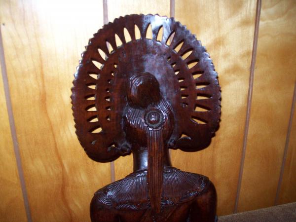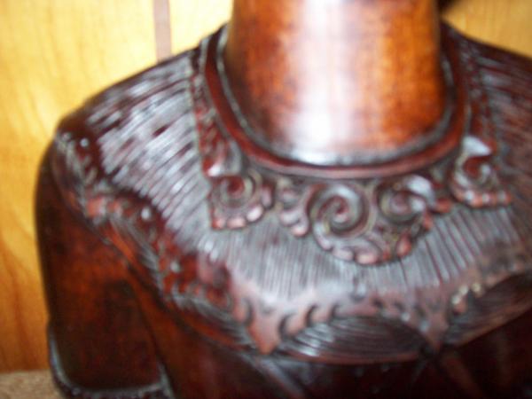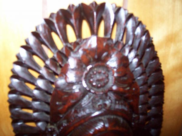 Grandfather bought it in '56 in California......made of a dark wood but when you put it in the light there is alot of auburn in it...Looking it up..the closest description I found was that it was carved in Bali..where the workers did not mark their carvings...it is supposedly a carving of the head of a legong dancer..this wood has no cracks or marks in it...