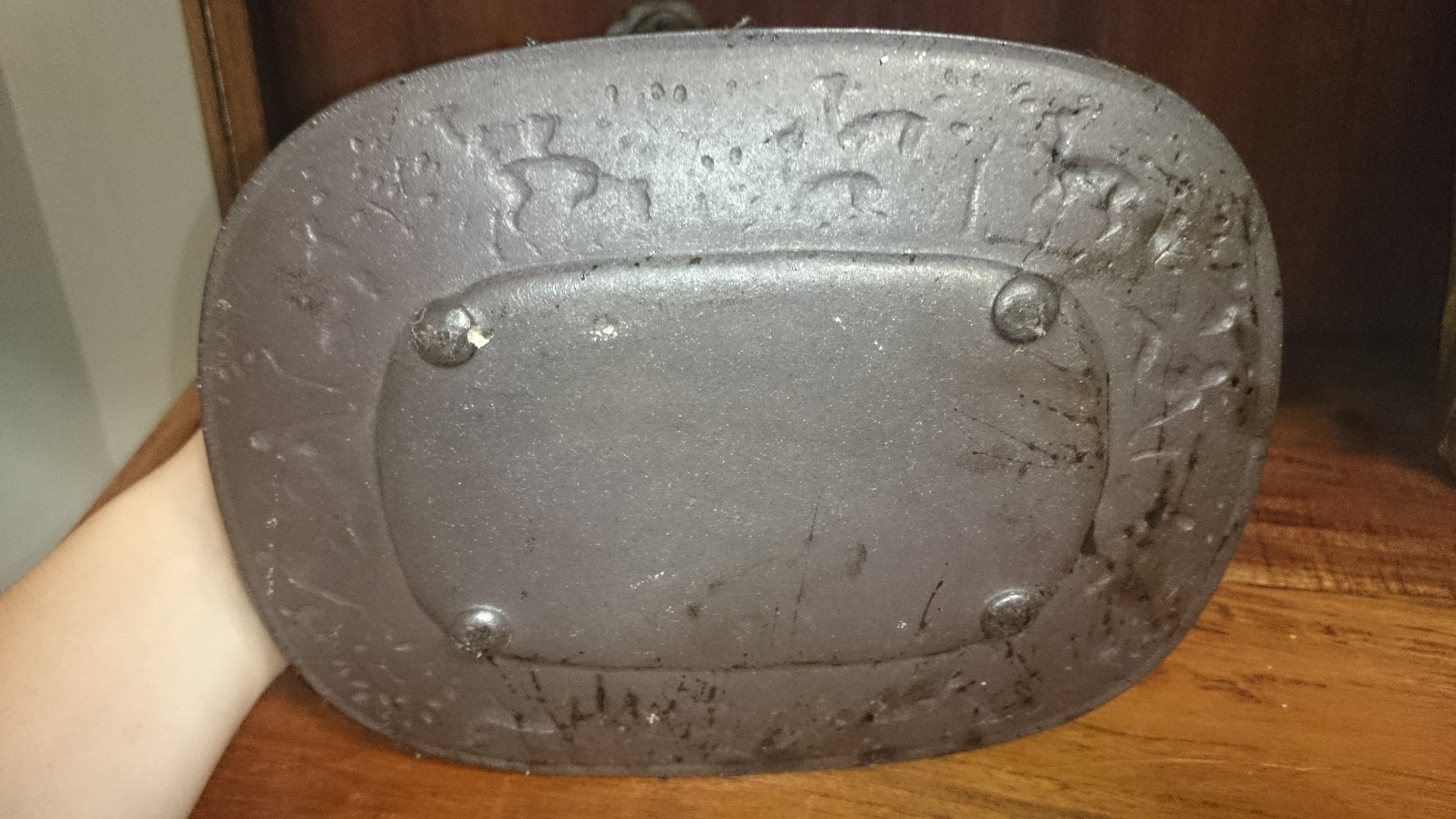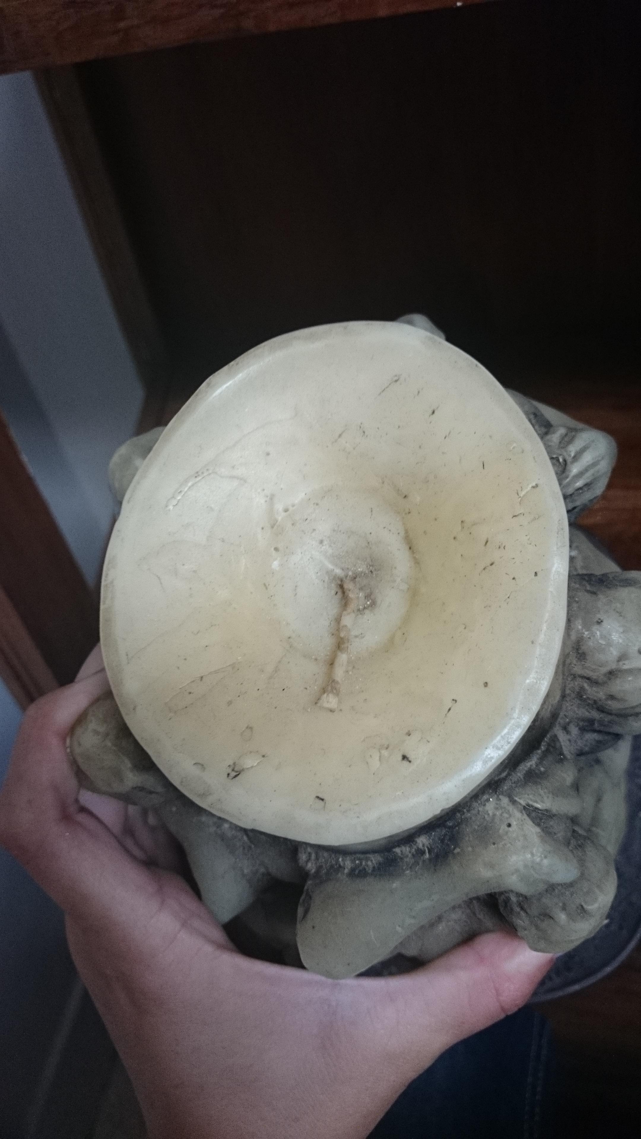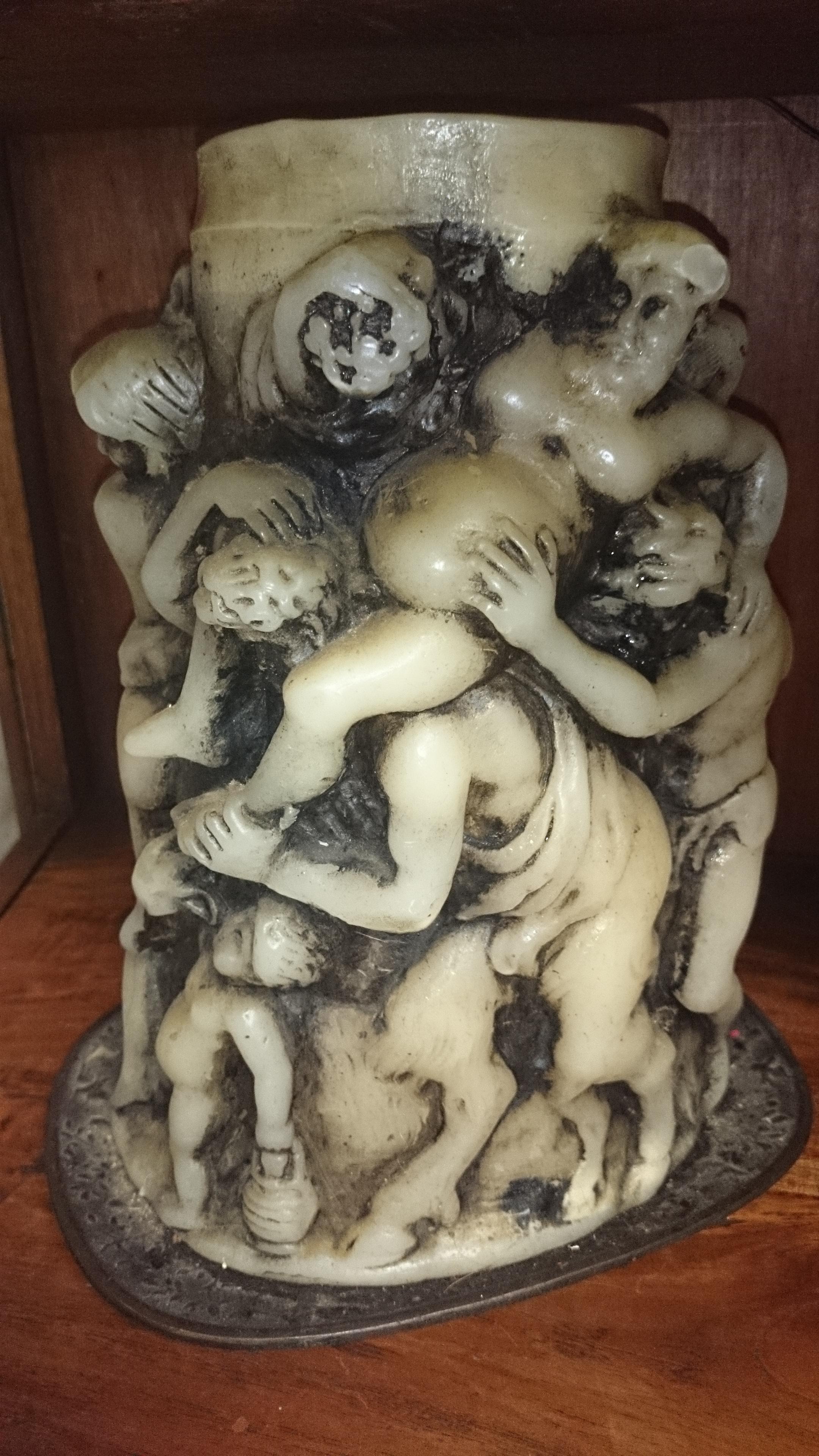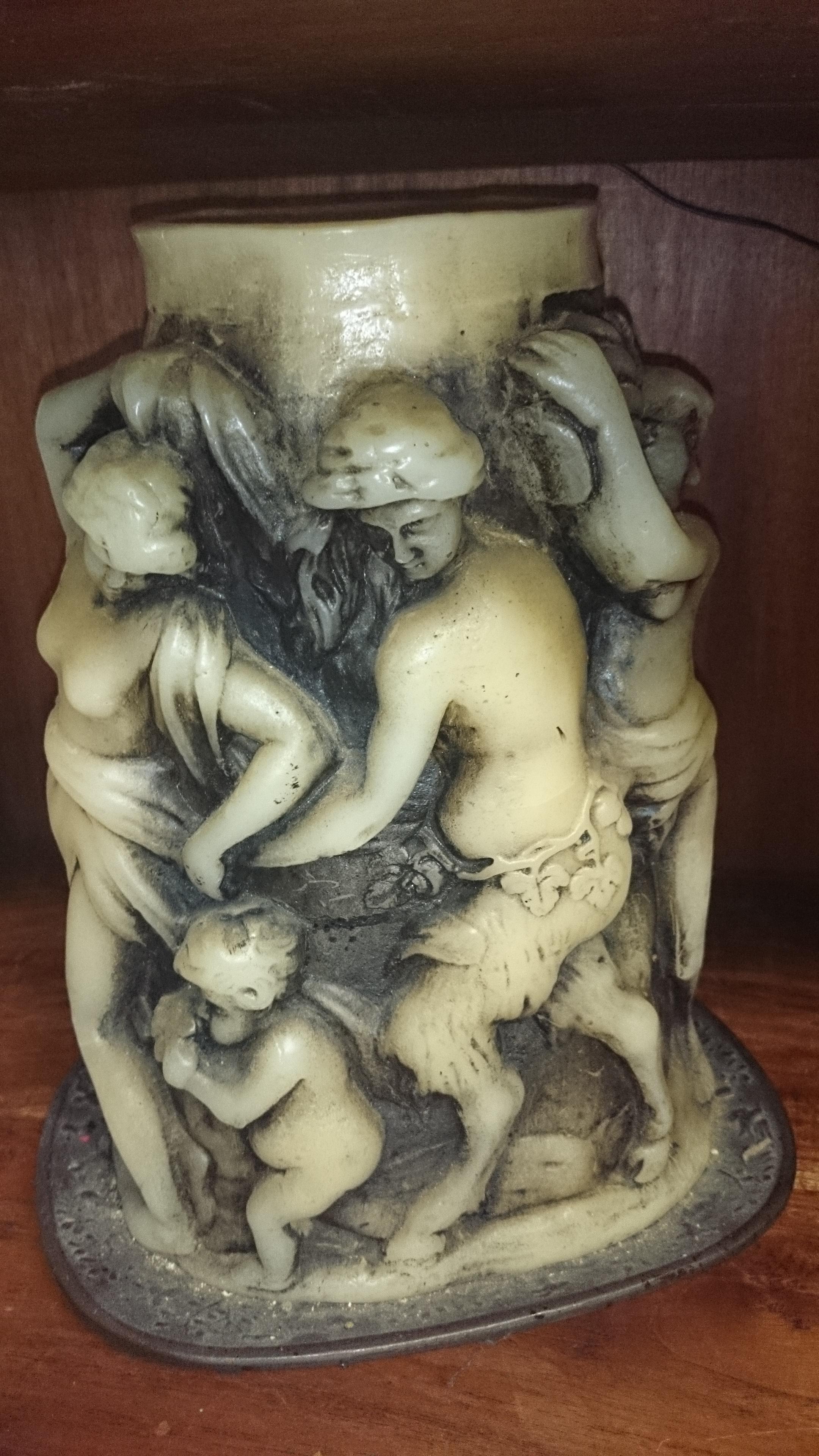 Carved candle, with mythological creatures. Exquisite detail on metal base no visible markings.