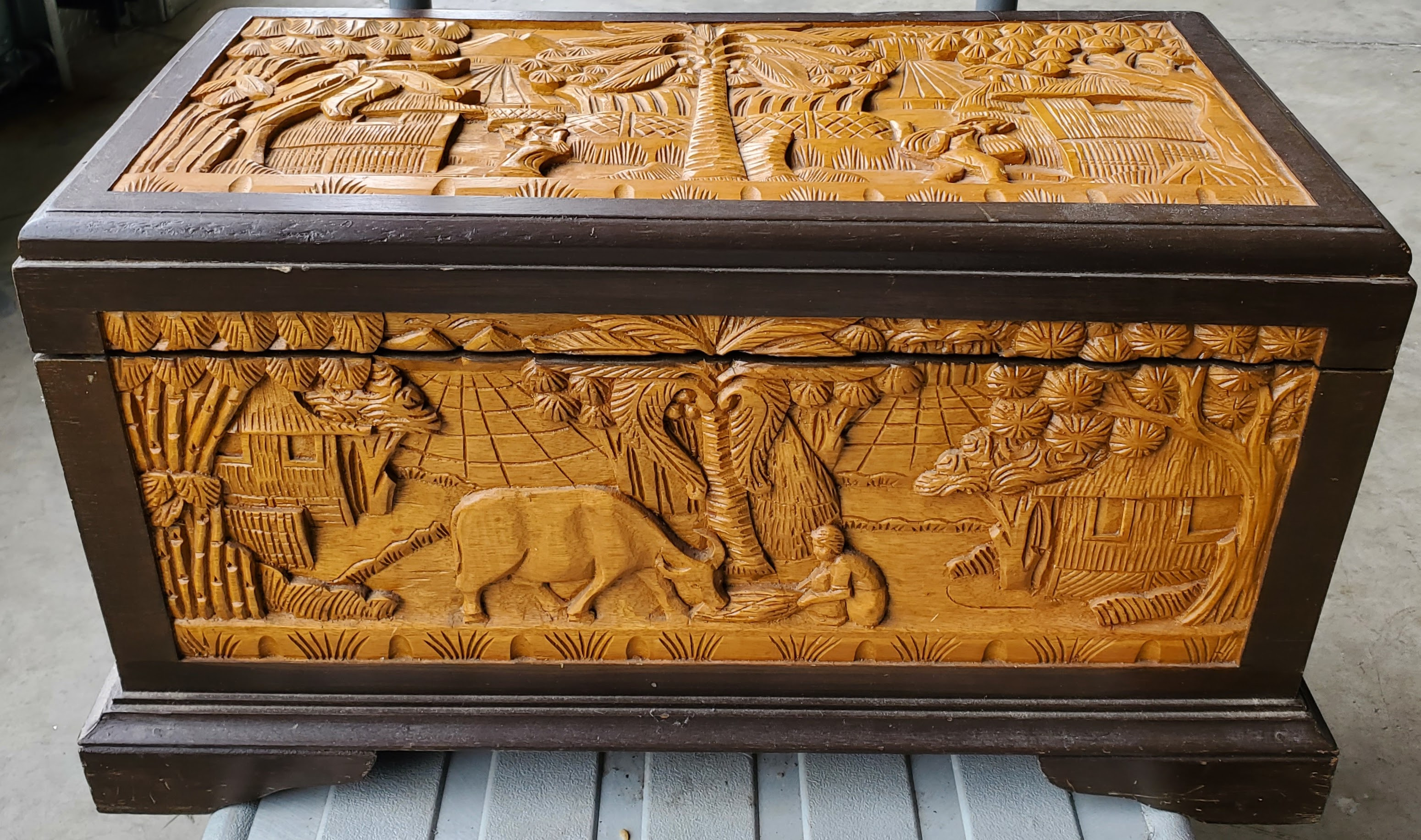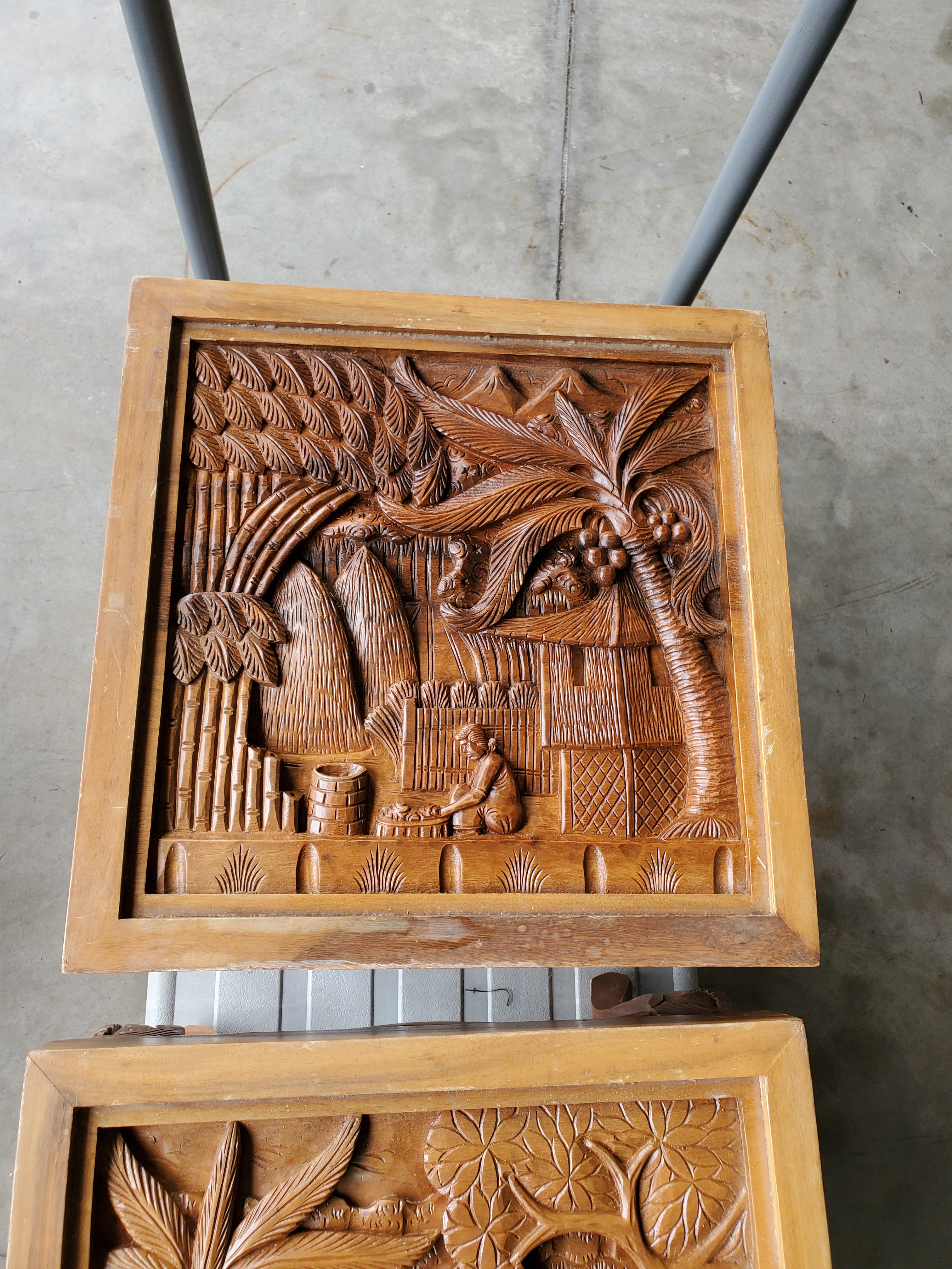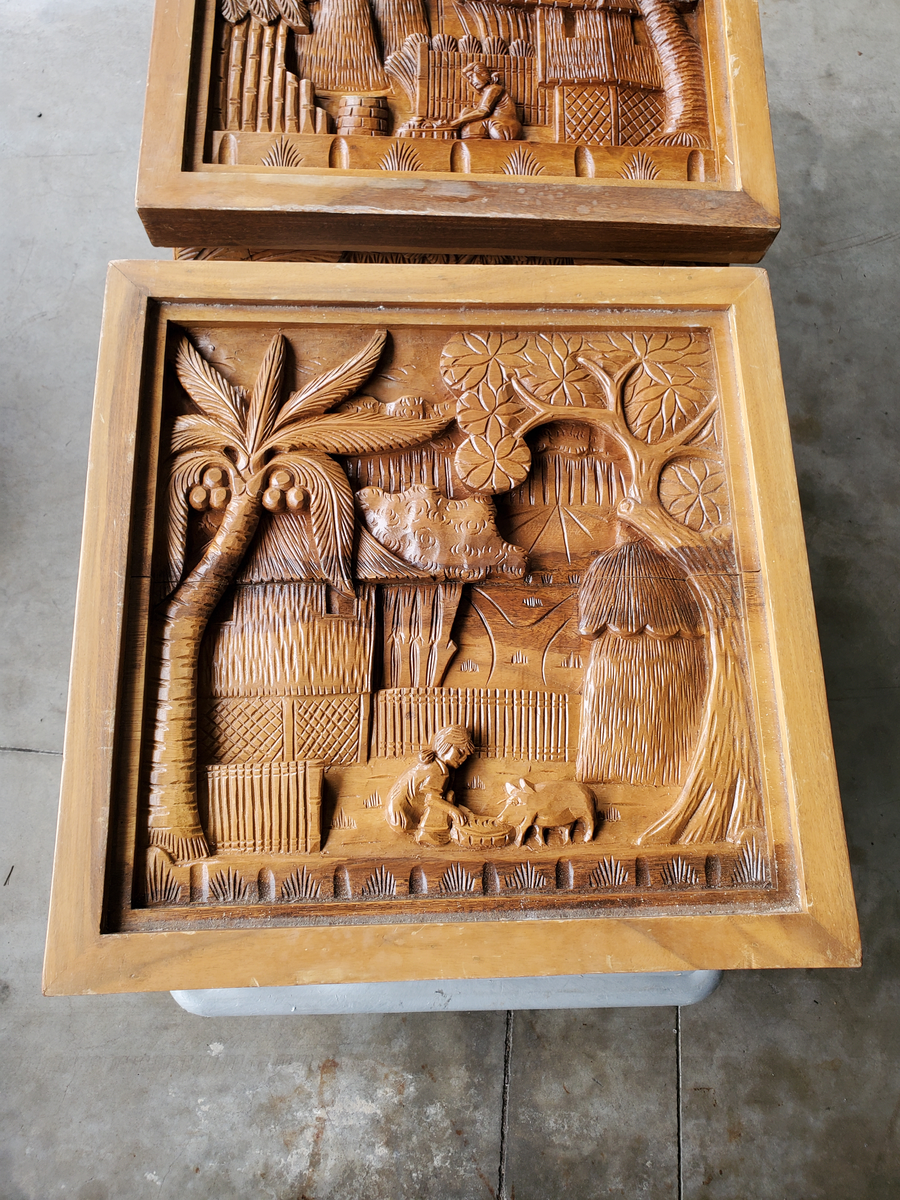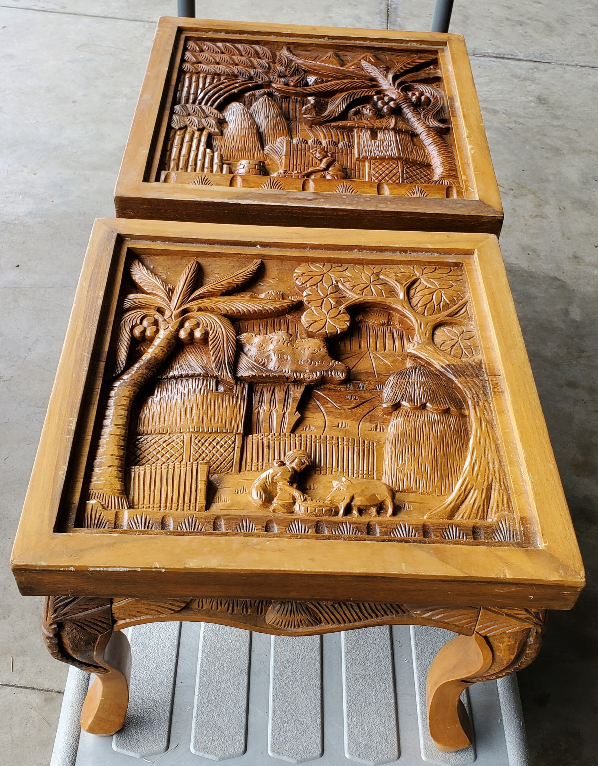 The carvings depict traditional rural village scenes: figures working, livestock, huts, tropical trees, and mountainous backgrounds. This thematic style is typical of post-WWII export furniture from Southeast Asia—particularly the Philippines—where such items were often sold to American servicemen or tourists.