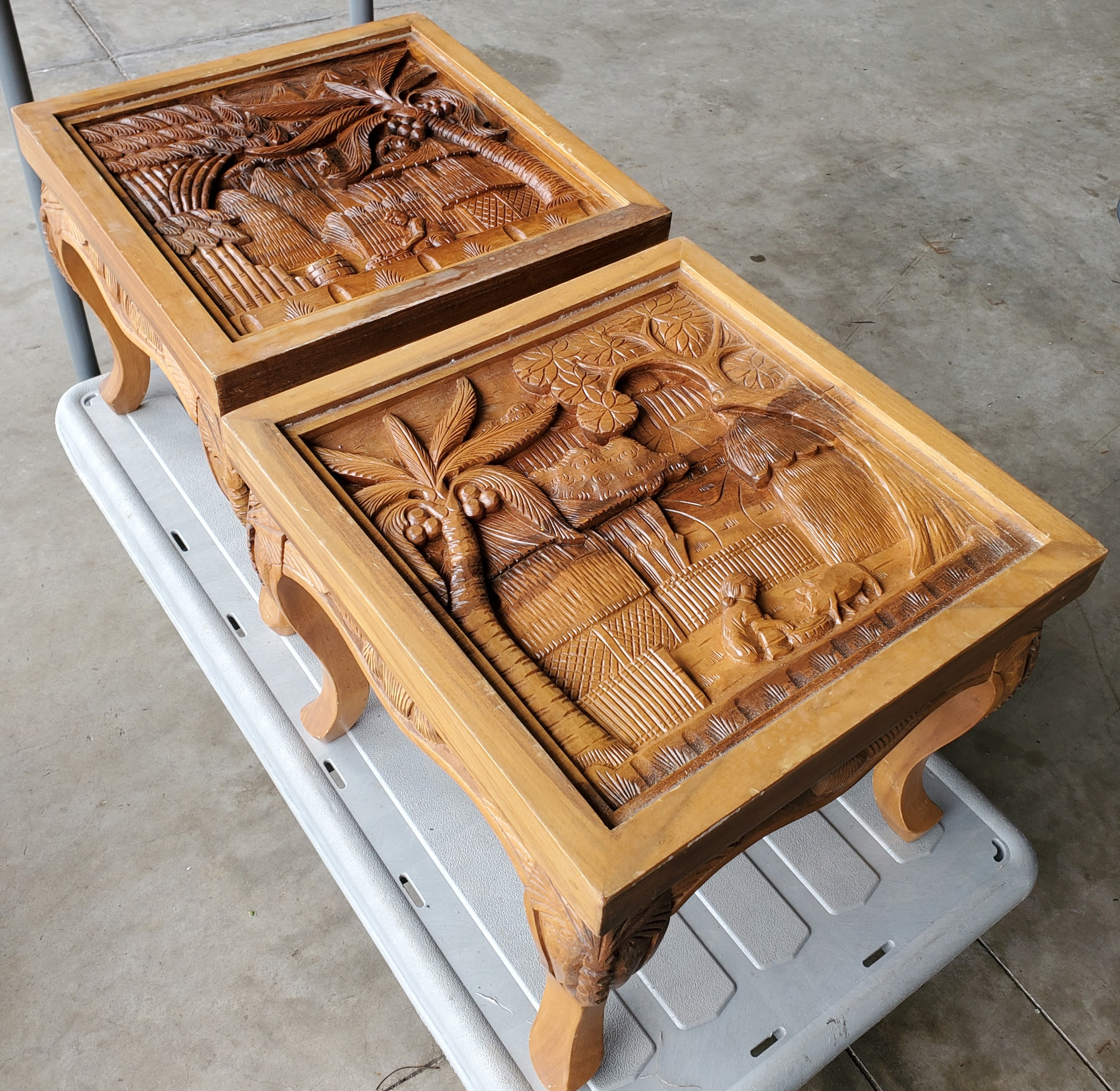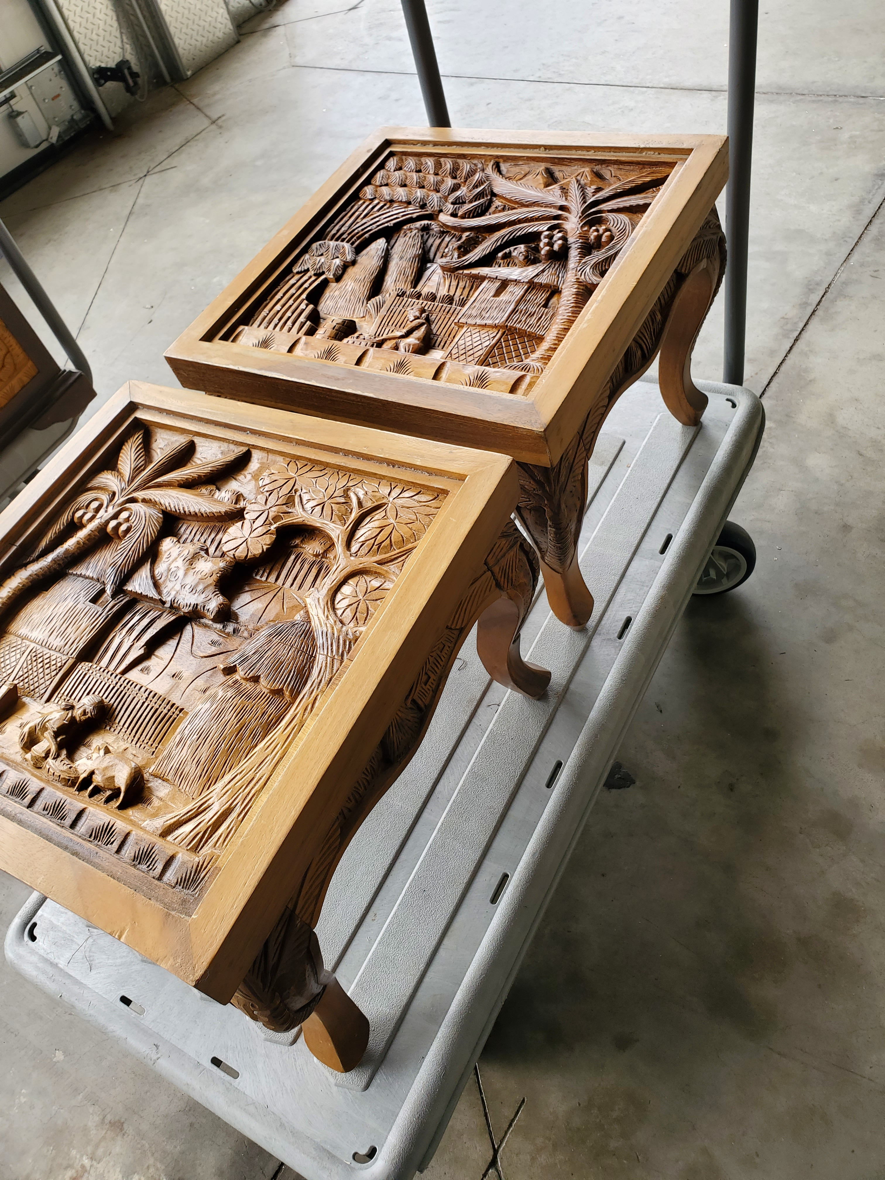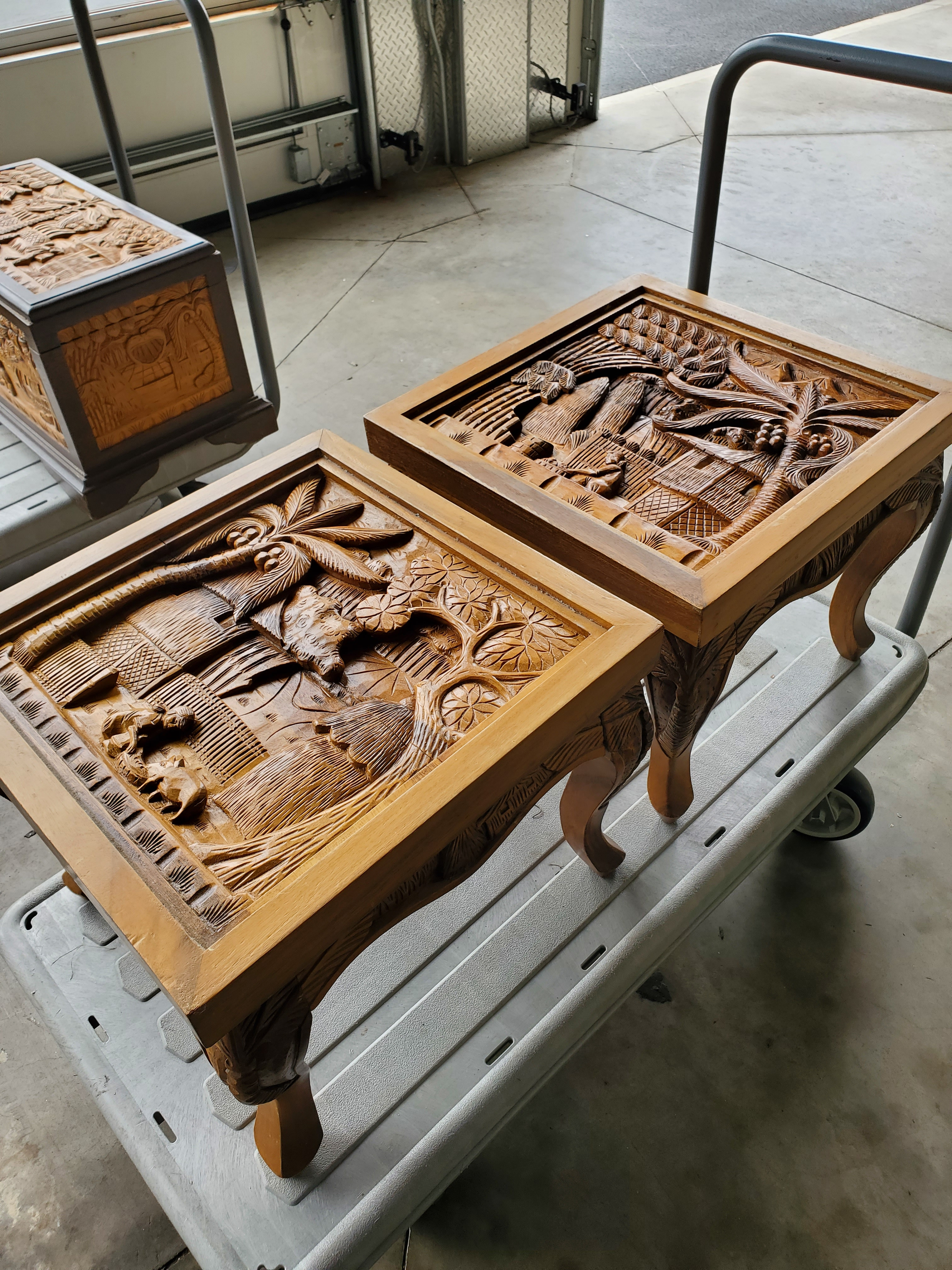 Carved (hand?) large and small chests with sidetables. Sidetables have glass tops.