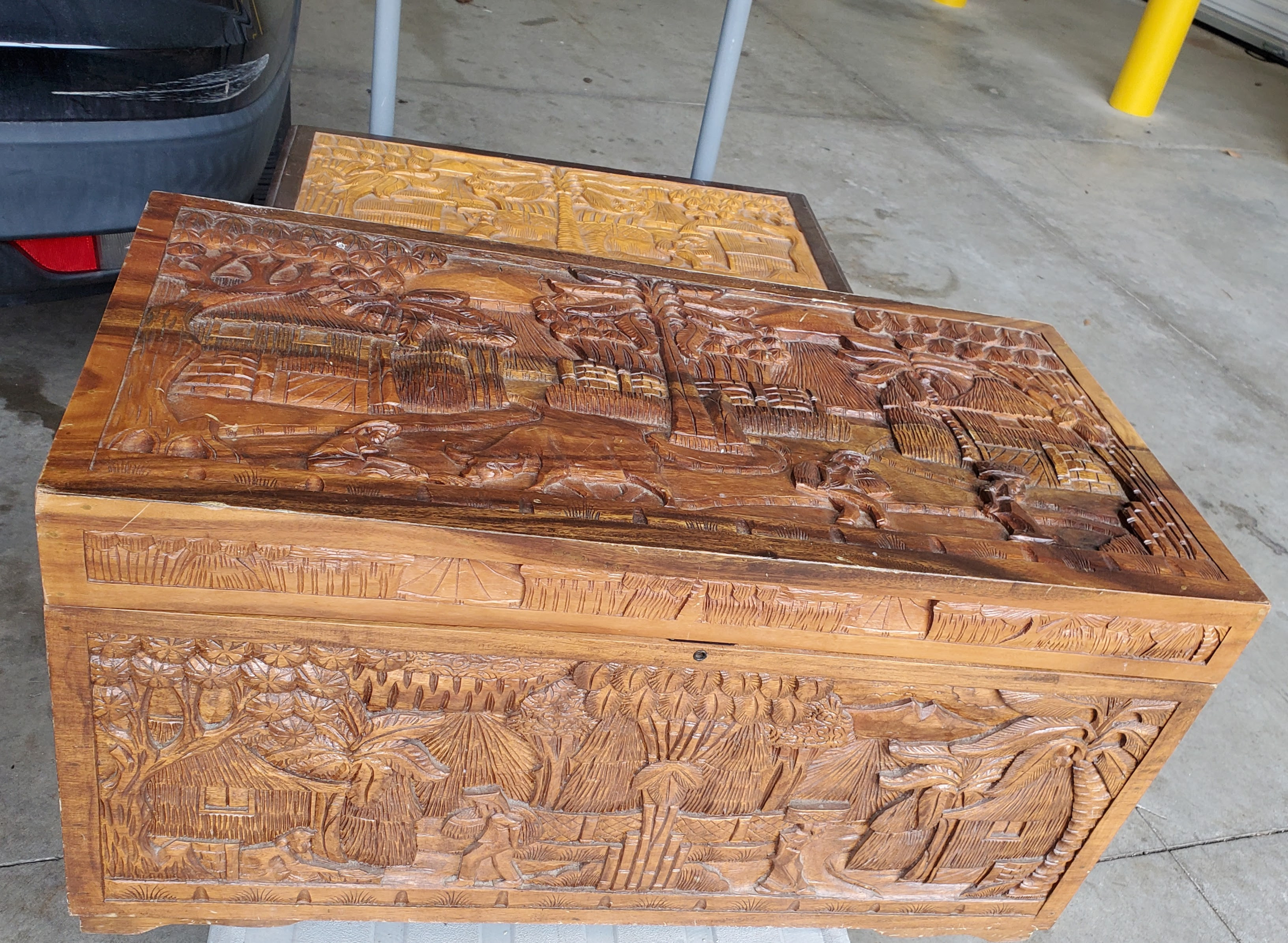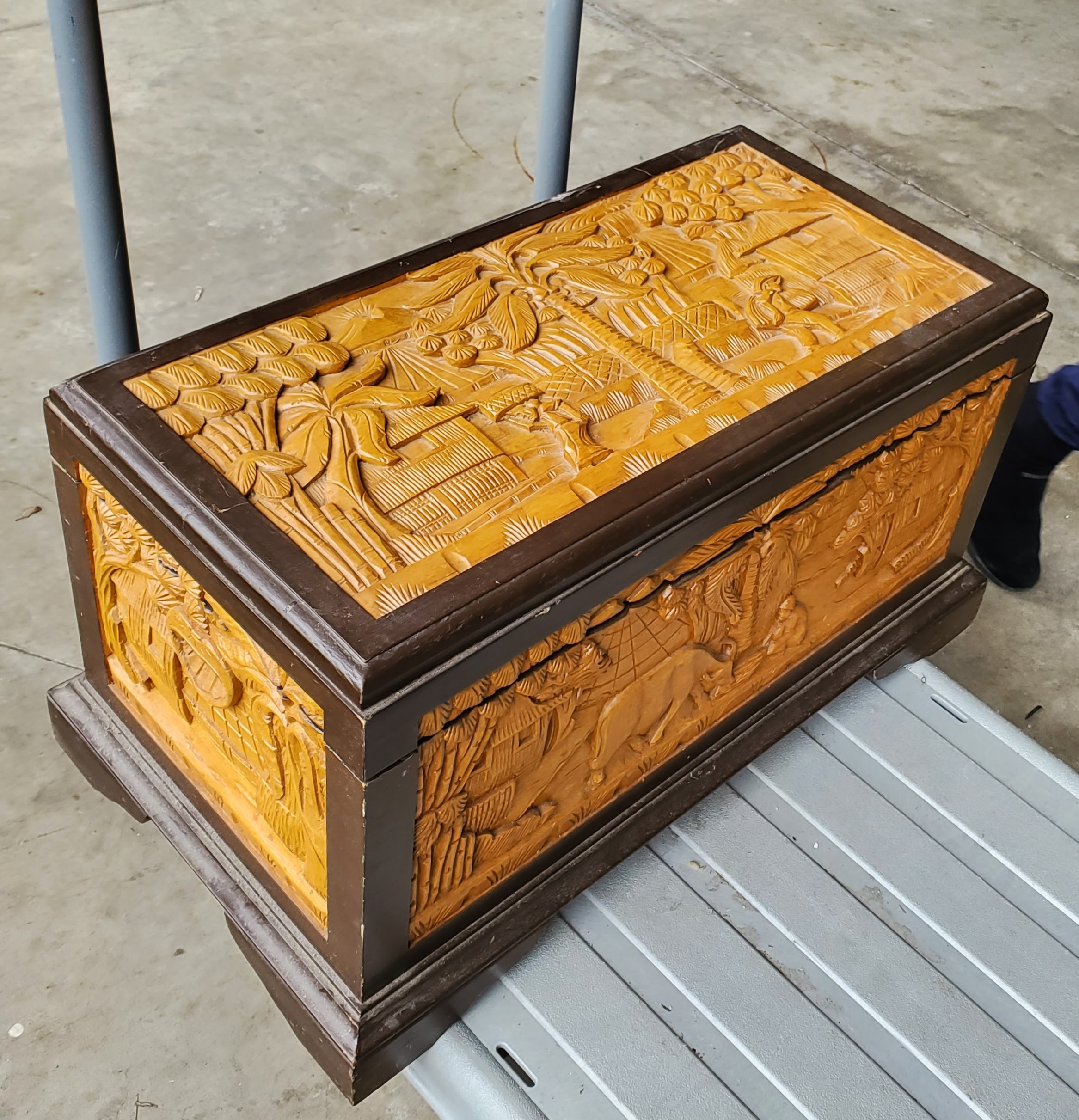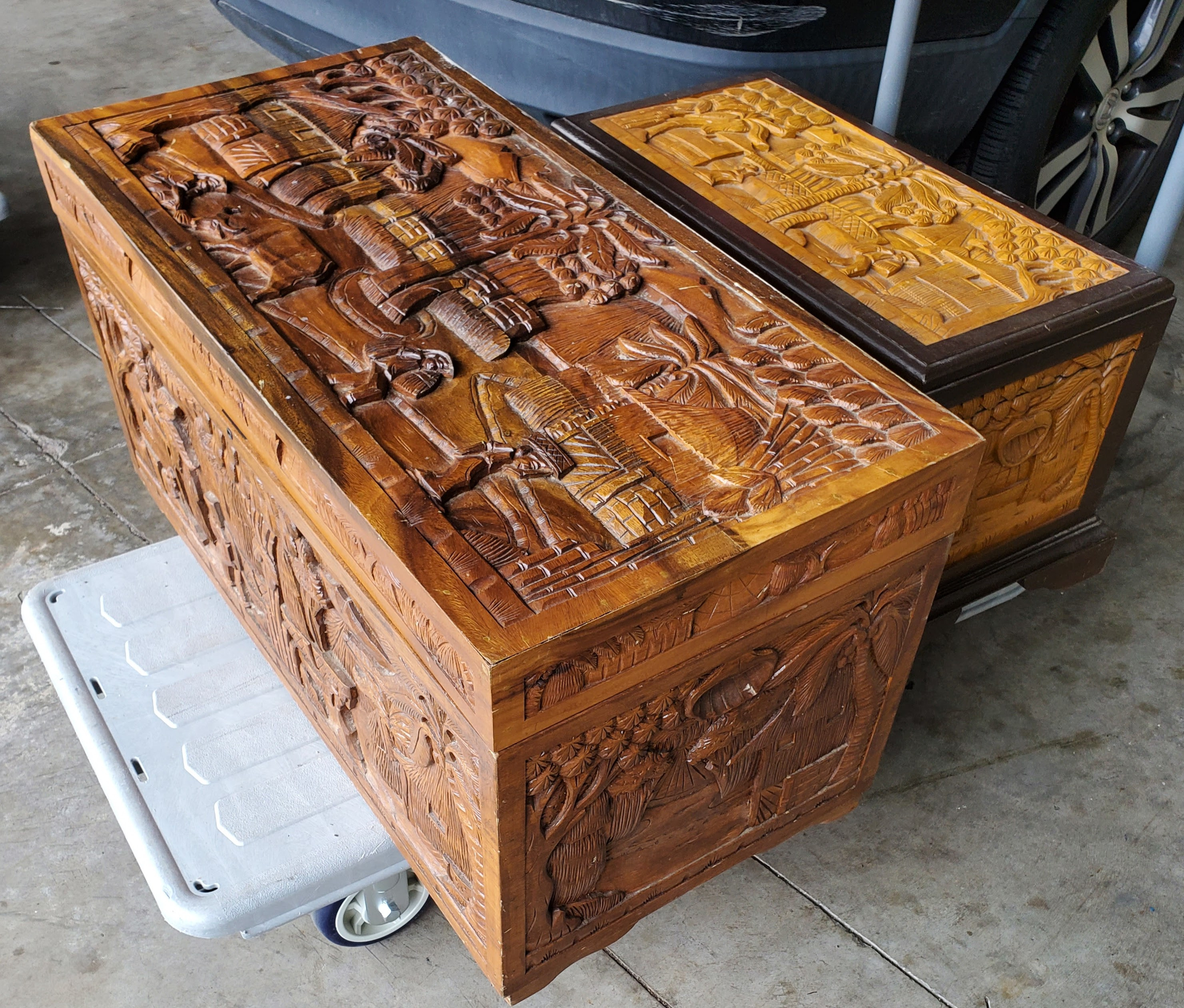 Carved (hand?) large and small chests with sidetables. Sidetables have glass tops.