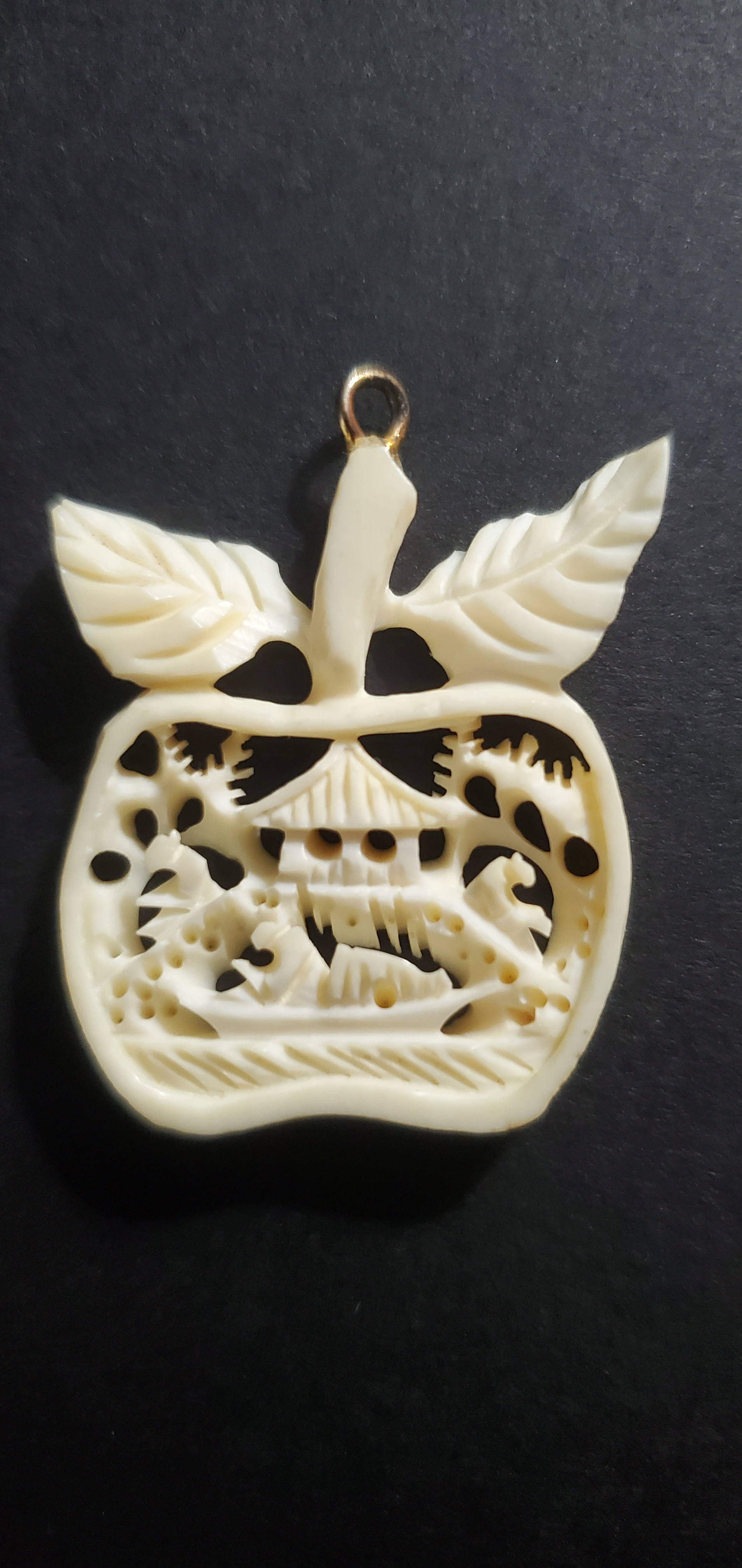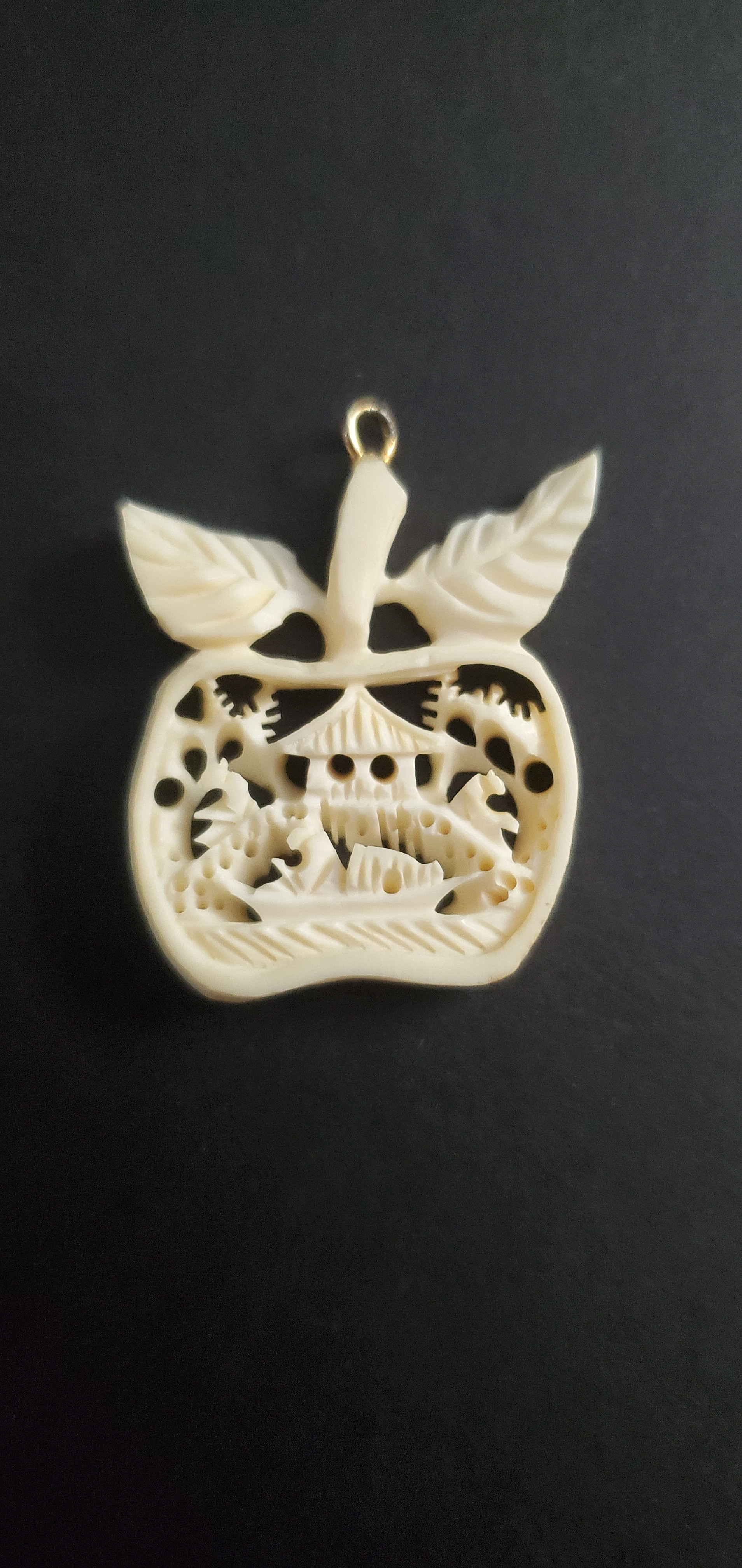 This is a hand-carved pendant, shaped like an apple with two leaves and a loop for wearing as a necklace. The interior is intricately pierced and carved in relief, depicting a traditional East Asian architectural scene, likely a pagoda amidst trees, hills, and a stylized landscape.
