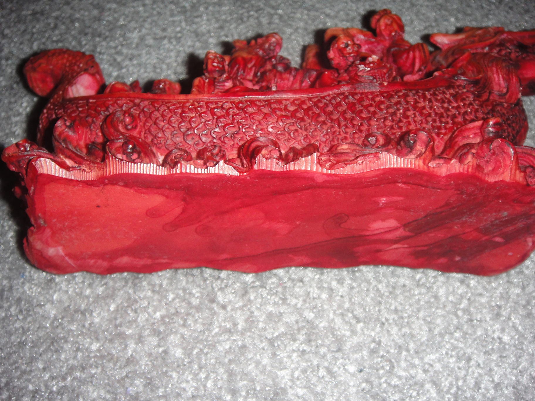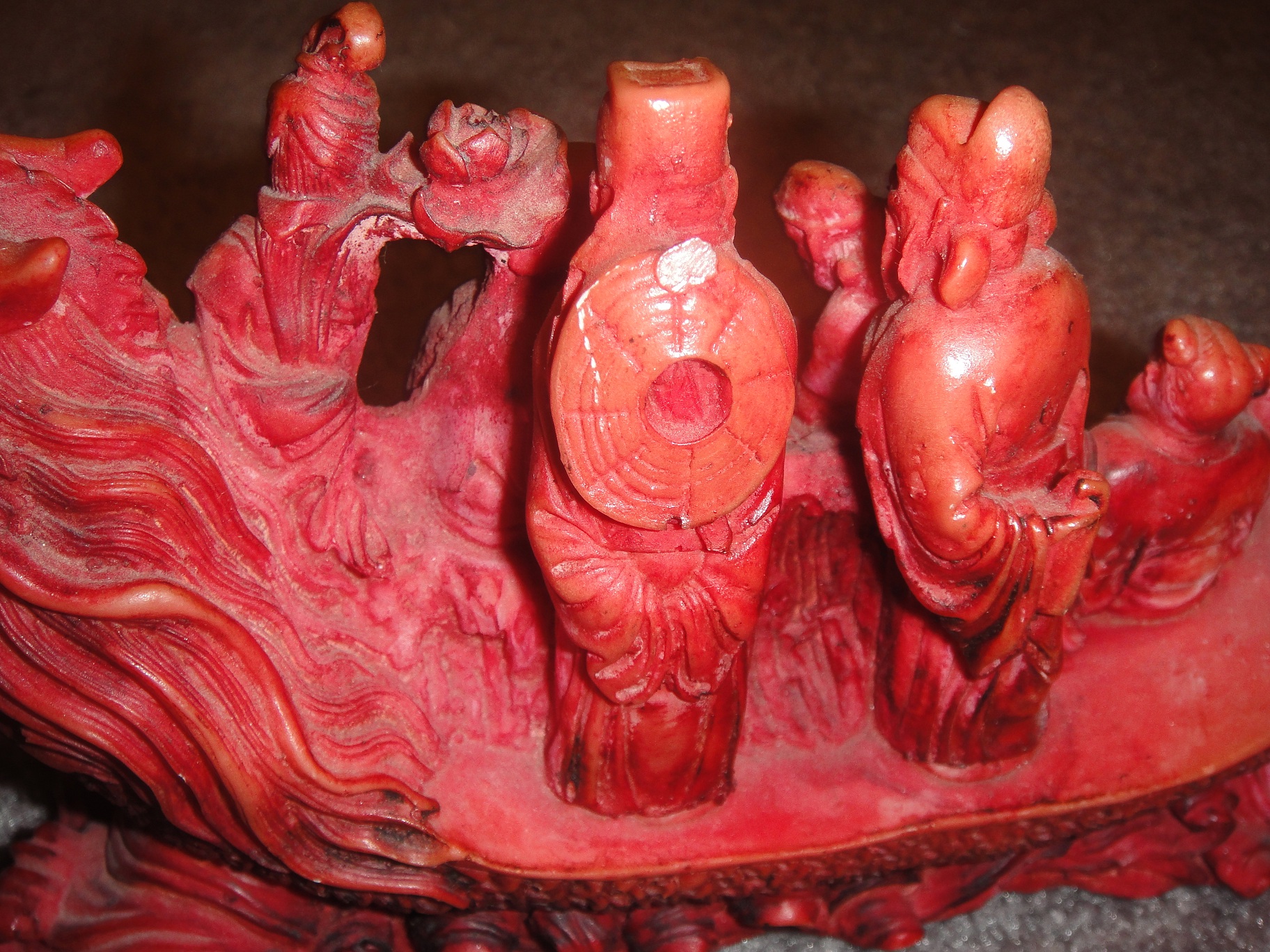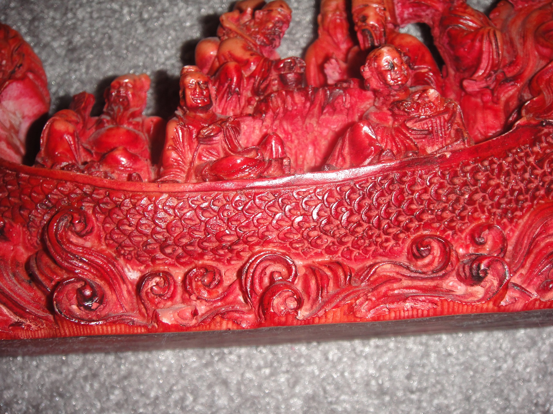 The carving is very detailed and appears to be fine crafsmanship. The object has been stained with red dye.